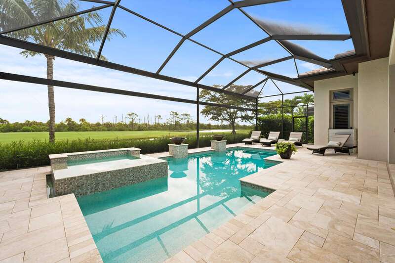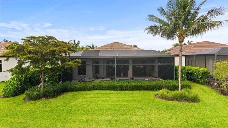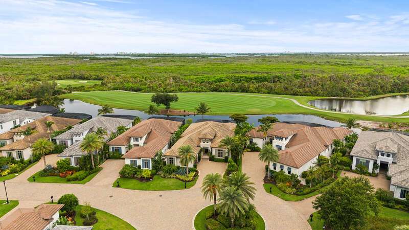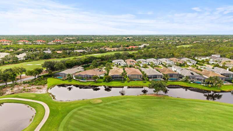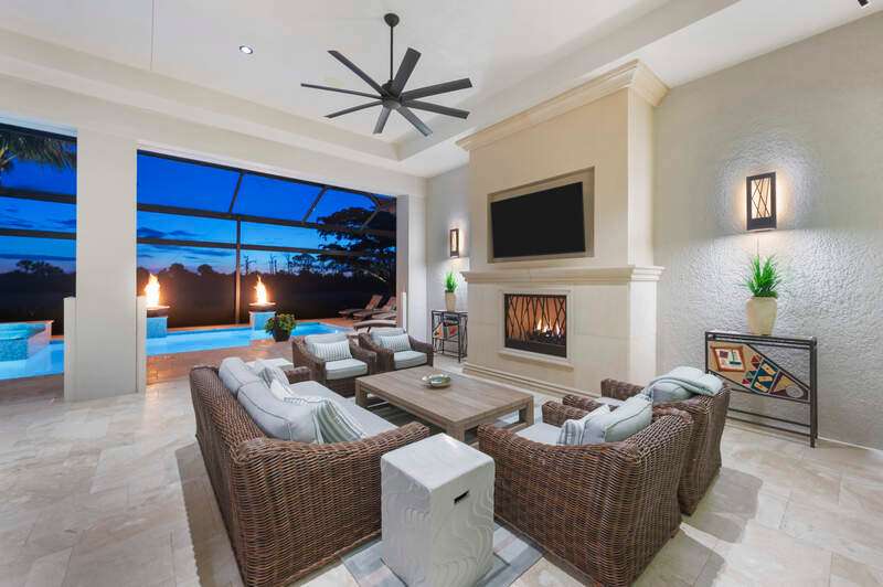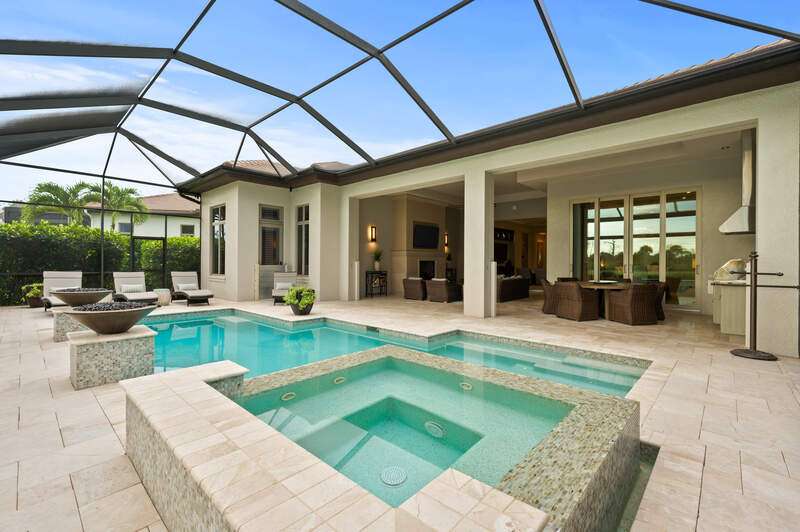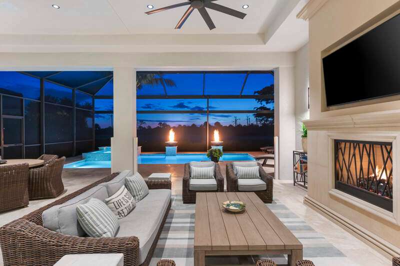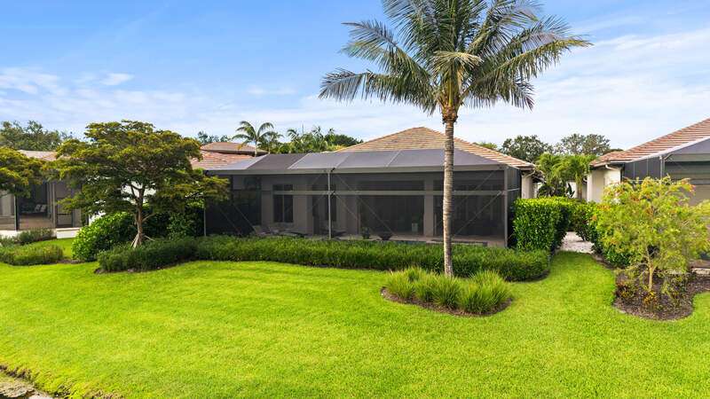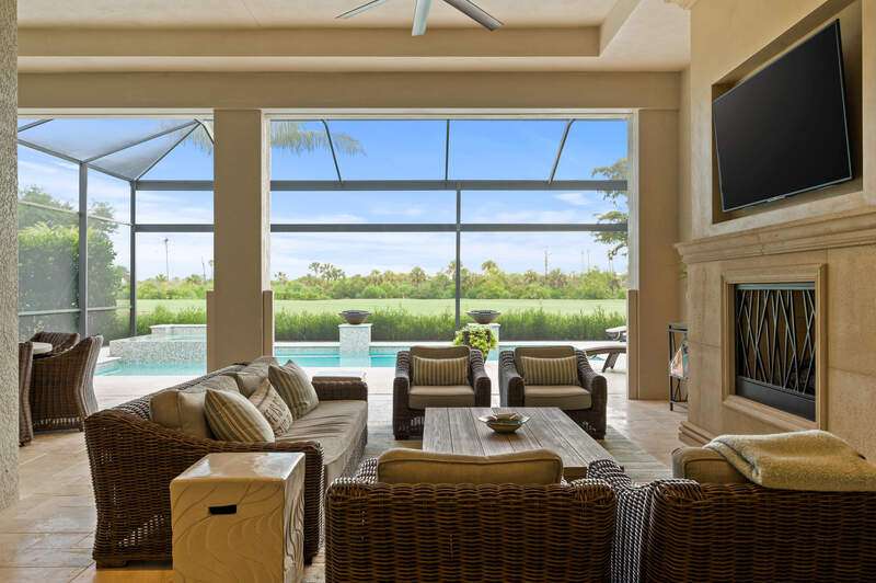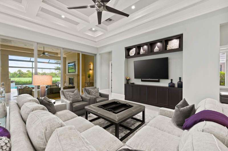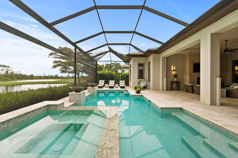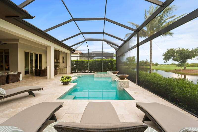 IMMEDIATE GOLF MEMBERSHIP AVAILABLE with this Luxurious West-Facing home offering lake, golf course, preserve views and glorious sunsets Experience elegant living in this stunning custom-built residence by Gulfshore Homes, professionally designed by Vogue Interiors and perfectly positioned in the exclusive enclave of Westlake Court. Step through double entry doors into a light-filled interior boasting 12-foot ceilings with exquisite detailing, designer tile flooring, and custom built-ins. The open-concept layout is ideal for entertaining, with the spacious great room and dining area flowing seamlessly to the outdoors through 10-foot impact resistant sliding glass doors. The chef's kitchen is a standout feature, offering a large center island, custom cabinetry with ample storage, under-counter microwave drawer, and a U-Line dual-zone wine cooler. Outside, the lanai is a true private retreat. Travertine tile surrounds a resort-style pool and spa, accented by dramatic Grand Effects fire and water features. A custom outdoor kitchen, covered dining area, and fireplace with handcrafted screen create the perfect setting for relaxed living and entertaining-all while enjoying unobstructed sunset views.The luxurious primary suite features detailed ceiling finishes, designer wall treatments, and customized walk-in closets. Two guest suites, a den/office, powder room, and an oversized 2.5-car garage complete this exceptional home. Additional highlights include a whole-house generator, Anderson impact resistant windows, custom window treatments, built-in sound system and ample garage storage. Enjoy the unmatched lifestyle West Lake offers from the brand new Beach Club on the Gulf to the resort-style pool, fitness center, Championship Pete & P.B Dye golf course, pickle ball, tennis, private boat launch to the Gulf and Estero Bay and so much more!