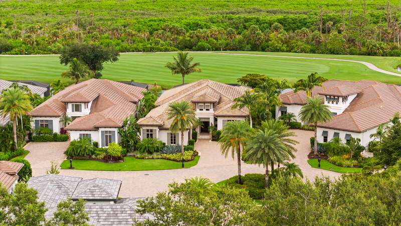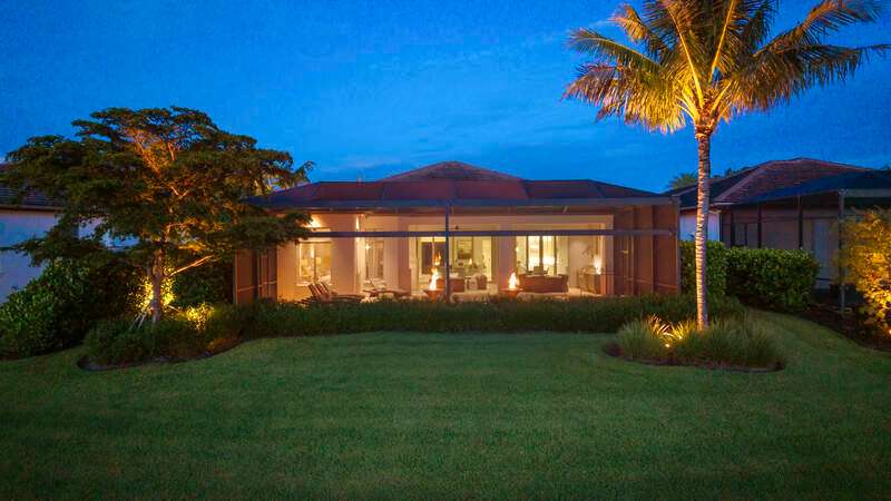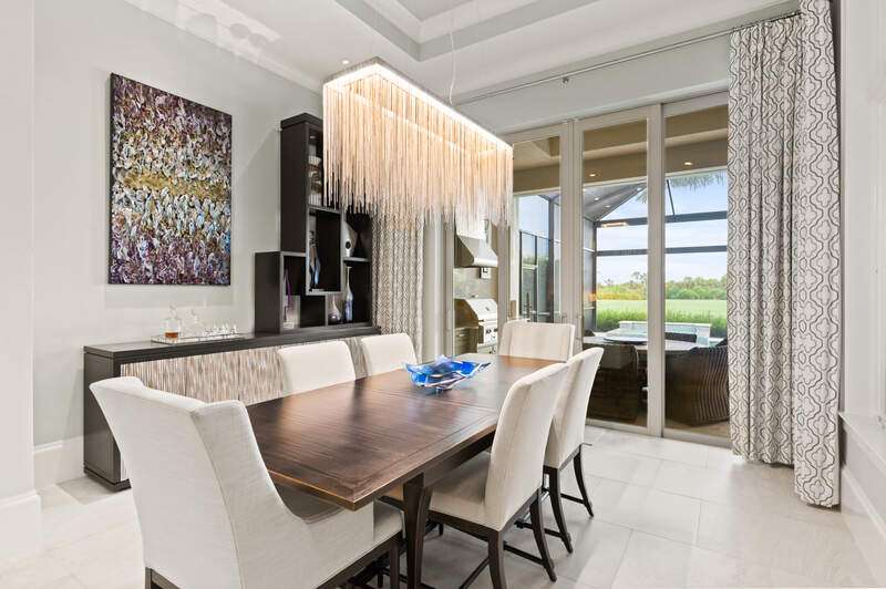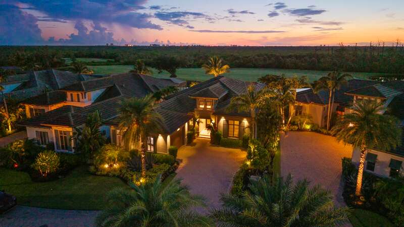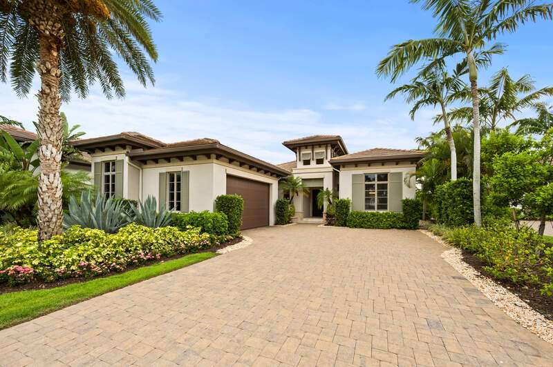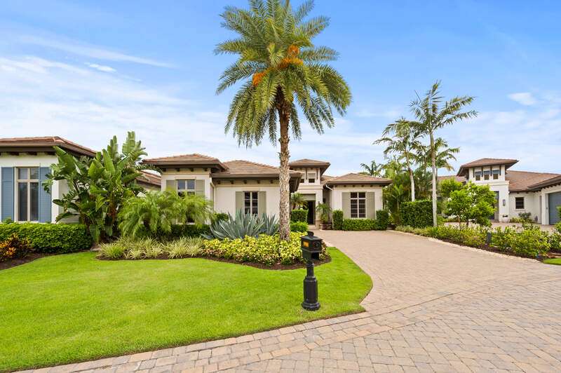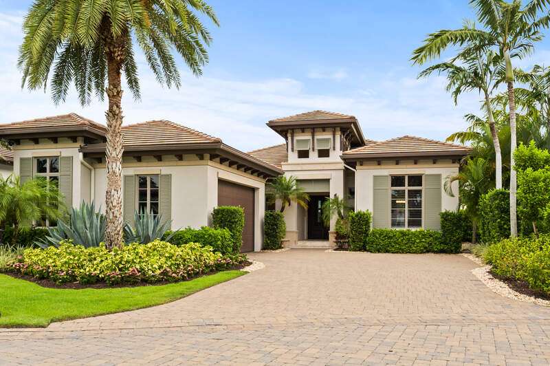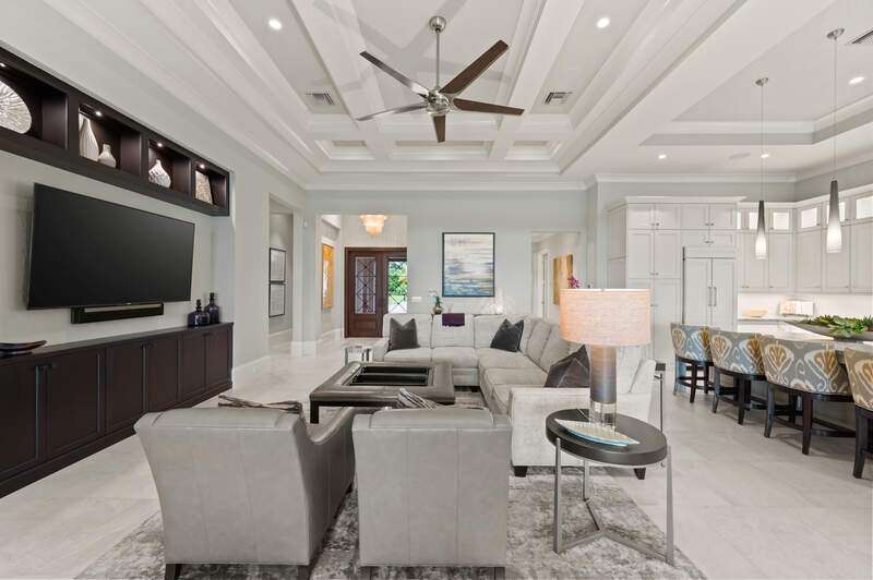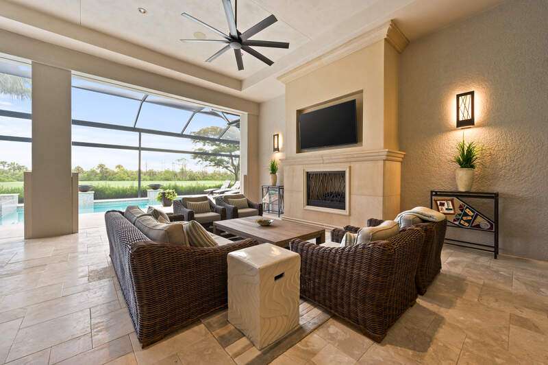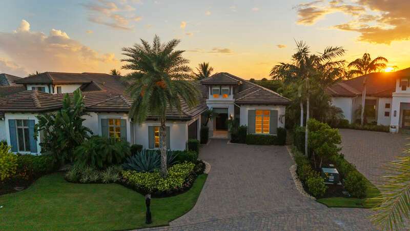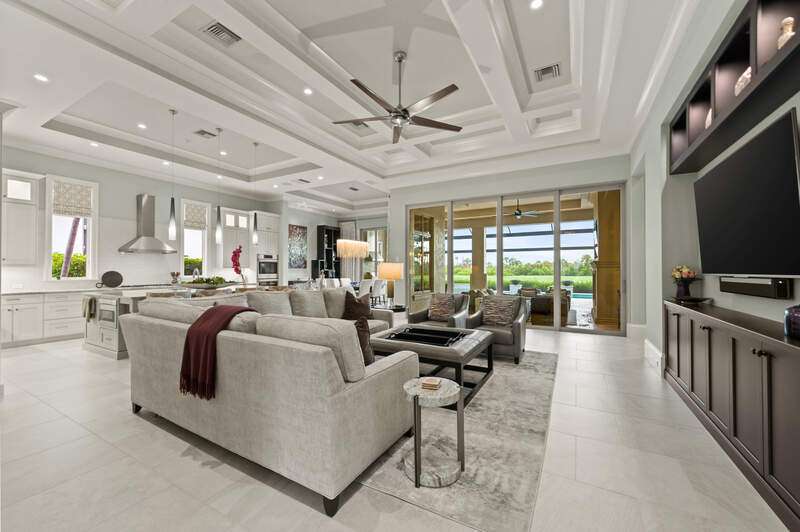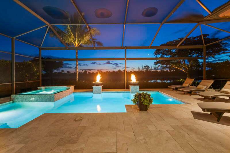 IMMEDIATE GOLF MEMBERSHIP AVAILABLE with this Luxurious West-Facing home offering lake, golf course, preserve views and glorious sunsets Experience elegant living in this stunning custom-built residence by Gulfshore Homes, professionally designed by Vogue Interiors and perfectly positioned in the exclusive enclave of Westlake Court. Step through double entry doors into a light-filled interior boasting 12-foot ceilings with exquisite detailing, designer tile flooring, and custom built-ins. The open-concept layout is ideal for entertaining, with the spacious great room and dining area flowing seamlessly to the outdoors through 10-foot impact resistant sliding glass doors. The chef's kitchen is a standout feature, offering a large center island, custom cabinetry with ample storage, under-counter microwave drawer, and a U-Line dual-zone wine cooler. Outside, the lanai is a true private retreat. Travertine tile surrounds a resort-style pool and spa, accented by dramatic Grand Effects fire and water features. A custom outdoor kitchen, covered dining area, and fireplace with handcrafted screen create the perfect setting for relaxed living and entertaining-all while enjoying unobstructed sunset views.The luxurious primary suite features detailed ceiling finishes, designer wall treatments, and customized walk-in closets. Two guest suites, a den/office, powder room, and an oversized 2.5-car garage complete this exceptional home. Additional highlights include a whole-house generator, Anderson impact resistant windows, custom window treatments, built-in sound system and ample garage storage. Enjoy the unmatched lifestyle West Lake offers from the brand new Beach Club on the Gulf to the resort-style pool, fitness center, Championship Pete & P.B Dye golf course, pickle ball, tennis, private boat launch to the Gulf and Estero Bay and so much more!