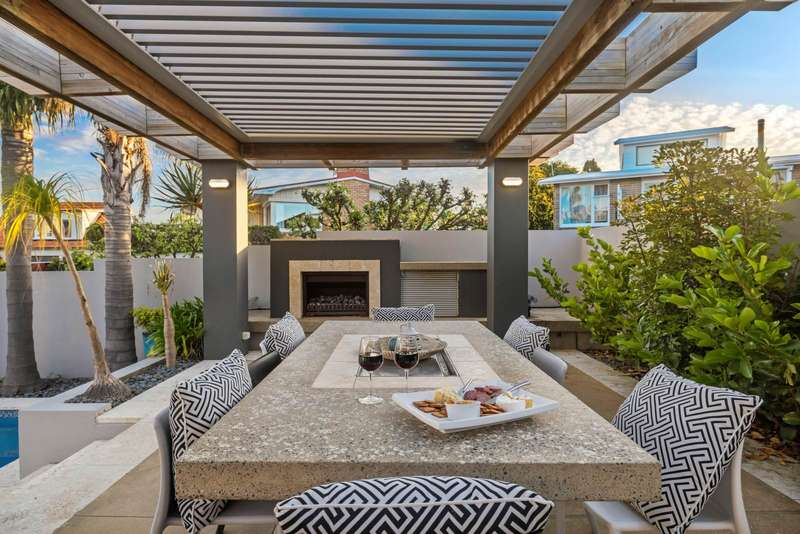 This solid home of expansive scale beautifully blends together 1960’s character charm with sophisticated modern living. It all comes together on an elevated north facing 800m site in Pillan’s Point, where the stage is set for sunny resort style living. Inside on the main floor, hardwood Tawa flooring and ornate scotia offer a feeling of permanence, gracing the well-connected family living space with a character feel that is hard to replicate. The well-appointed kitchen here anchors the heart of the home and is ready for gatherings of any size. This culinary hub mingles well with dining and living all extending out to an expansive north facing decking. The sea views throughout this level frame the Mount beautifully and encapsulate a rich coastal tapestry enjoyed also by two of the home’s generously sized bedrooms found on this level. The upper level is a private haven where two more sun-drenched oversized bedrooms await, including a serene master retreat with ensuite, both indulging in north facing wide vistas showcasing Mount Maunganui and Matakana Island. Downstairs is ideal for those who like to entertain or just find their own space with a range of options. A large separate games lounge, home theatre, office, designated gym, custom built bar and wine cellar room are all at your beck and call. Polished concrete floors instil a modern feel to this level, as does the three-car garaging with plenty of room for your toys. The home’s third bathroom is also found on this level which is easily accessed by the pool complex out back. The backyard is what really transforms the property into resort style living all year round. Thoughtfully landscaped with tranquil water features and a tropical vibe, get set to dive into the two metre deep in-ground pool or relax in the spa. Host unforgettable gatherings with a magnificent louvered-covered alfresco dining area featuring a large teppanyaki dining table. You’ll be very busy relaxing here, all summer long. Whether it’s a relaxed family dinner or stylishly entertaining guests, this outdoor sanctuary blends luxury, comfort, and functionality in one breathtaking setting. Ensuring total security and seclusion are a full perimeter block wall and electronic front gates with abundant off-street parking within for all your friends and their basketball playing kids. Situated in an exclusive location, high on Pillans Road, near the CBD and key amenities, this property offers a lifestyle of unparalleled luxury and convenience. Often sought but seldom found, don’t miss your chance to experience this home’s offering. Call us today to see what you’ve been missing.