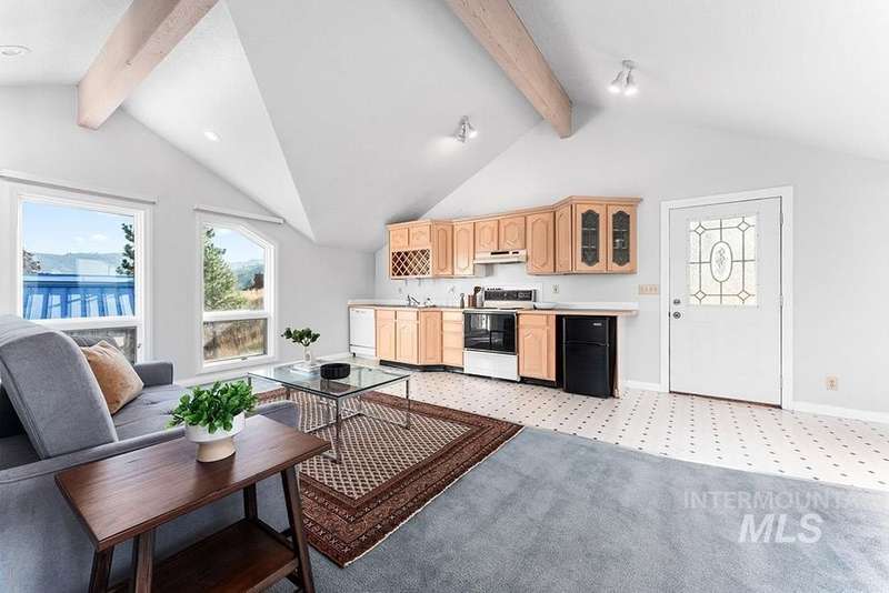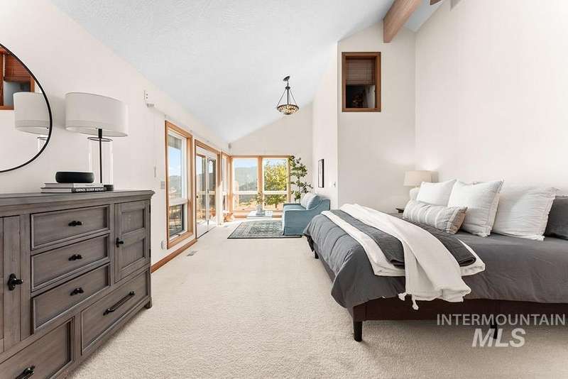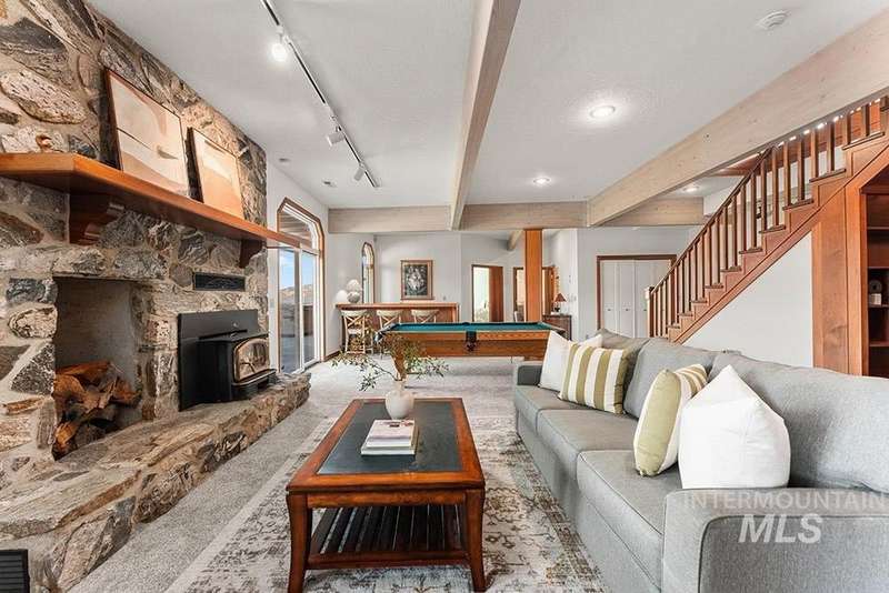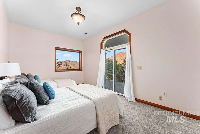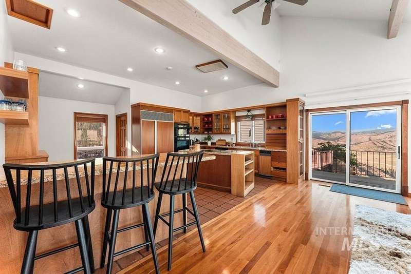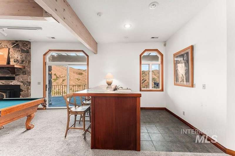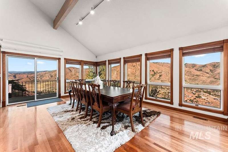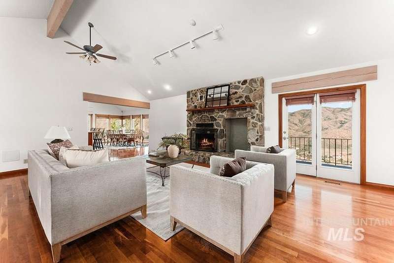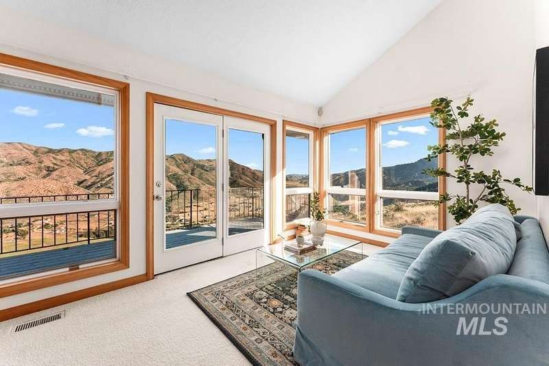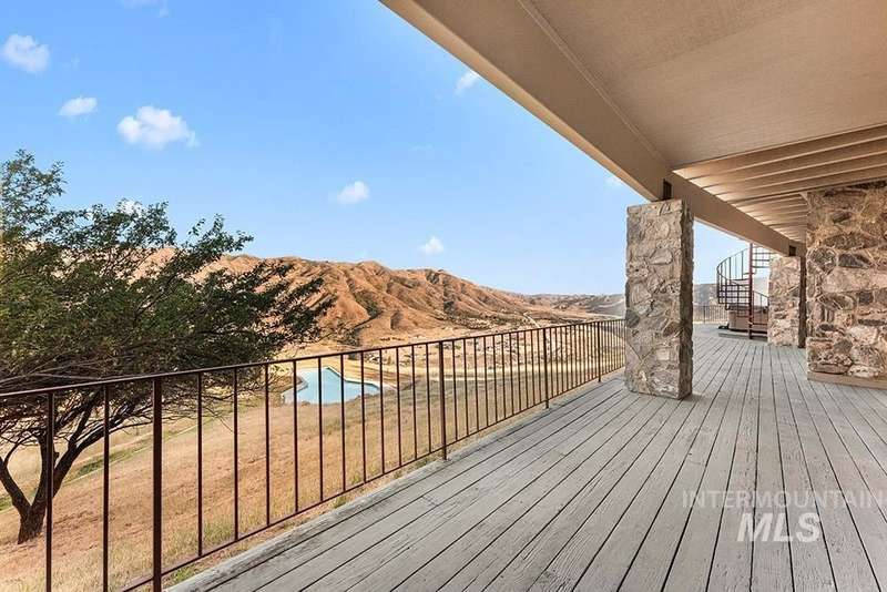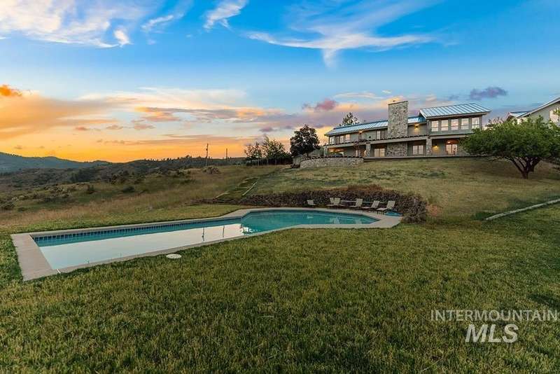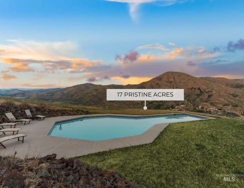 Experience over 17 acres of rural Idaho living, just 35 minutes from Boise with sweeping views of the Sawtooth Mountain Range in every direction! This charming mountain estate offers a spacious main residence and a flexible guest house/ADU. A 24’x47’ in-ground pool overlooks the endless mountain range. The interior features hardwood flooring, intricate mahogany woodwork, cathedral ceilings with exposed wood beams, and expansive architectural windows that frame the natural landscapes. Main-level master suite features direct balcony access, dual walk-in closets, and spacious en suite bathroom. On the lower level, enjoy a vast bonus room with a wet bar, a cozy library, three additional guest bedrooms and a newly renovated bathroom. The elevated guest house offers open-concept living, dining, and kitchen area, a secluded bedroom, and a full bathroom. Minutes from hiking, biking, hunting, & Lucky Peak dock access. HOA maintains roads for year round ease. Steel roof with 30 yr warranty & 500 gal propane tank.