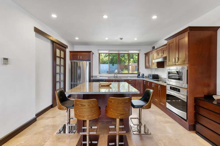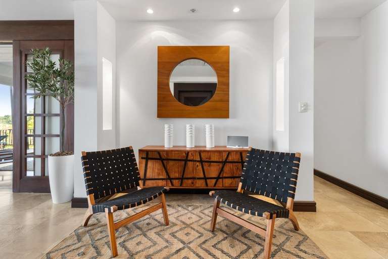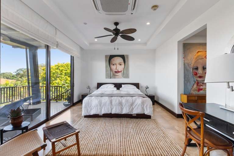 Step through glass doors onto a large, private balcony—an ideal setting for your morning coffee, evening wine, or unforgettable sunsets accompanied by nesting green parrots and ocean breezes. The indoor-outdoor flow from both the living room and master suite creates a harmonious living experience with nature.