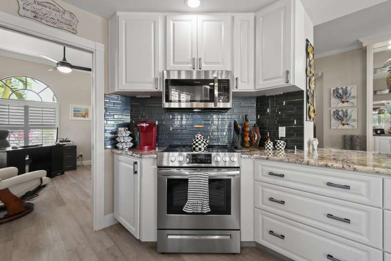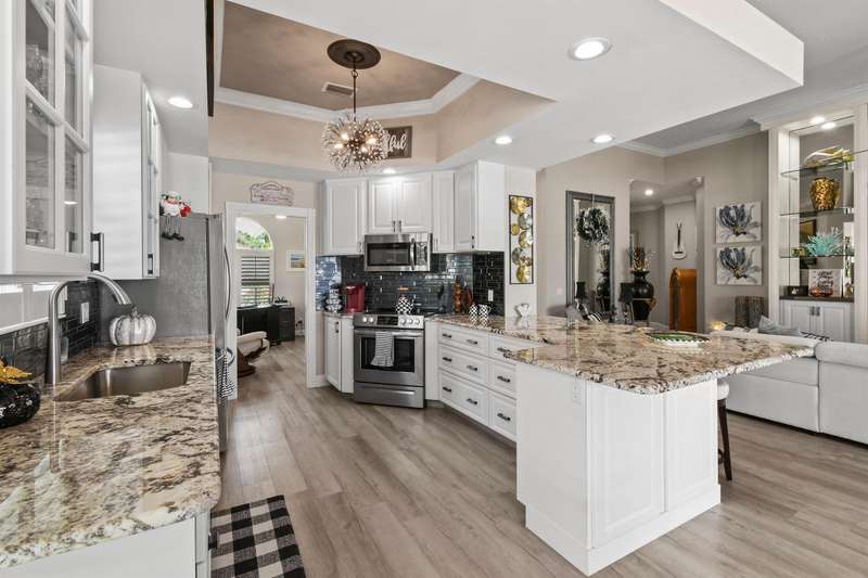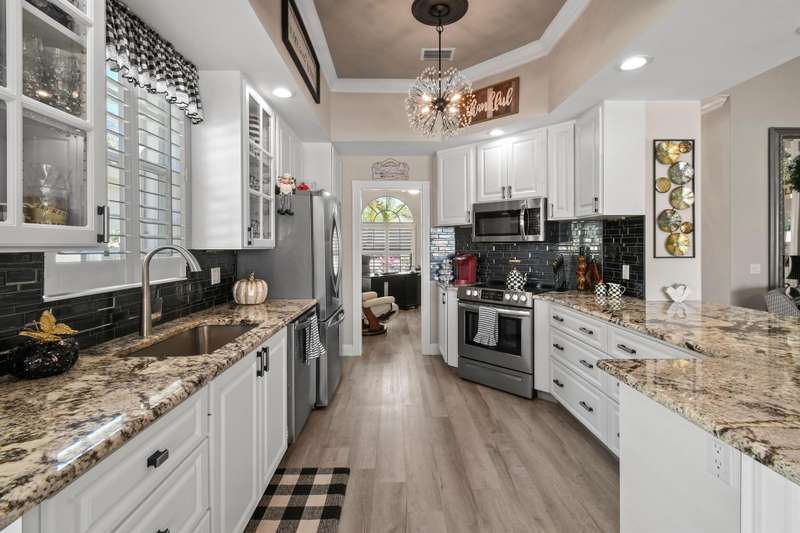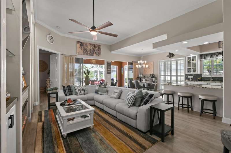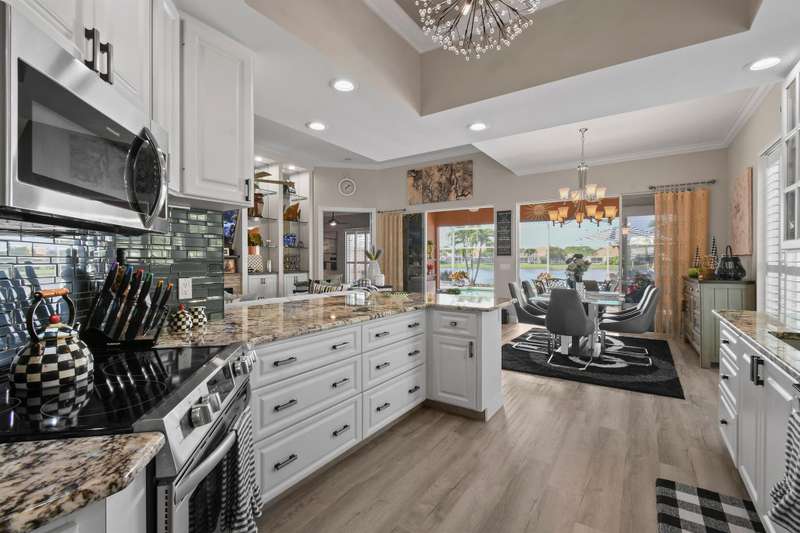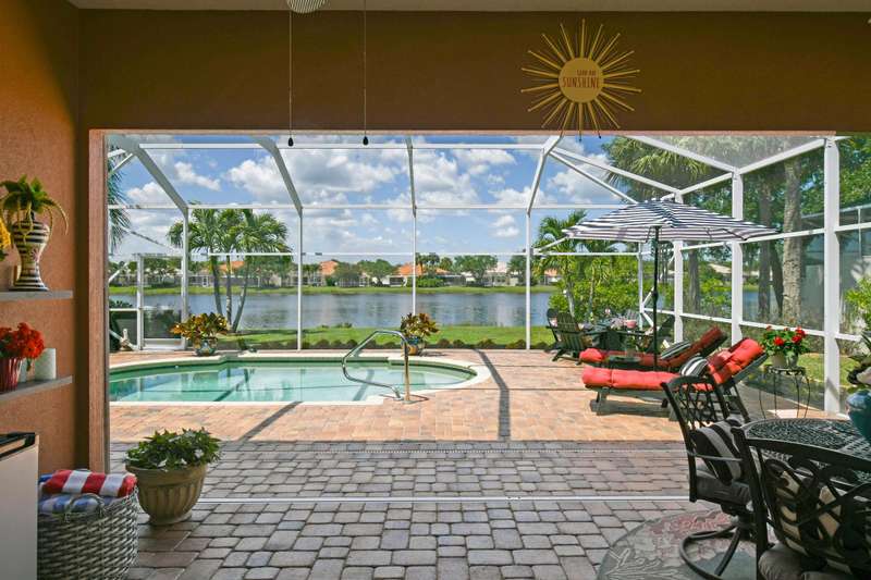 Tucked away, In a Gated Enclave. on a quiet street, This beautifully updated home offers stunning lake views and the perfect blend of tranquility and community living. Featuring 3 spacious bedrooms plus a flex room, this residence is designed for both comfort and functionality--ideal for unwinding in style. Step inside to an open-concept floor plan highlighted by stylish modern LVP flooring throughout, creating a warm, inviting atmosphere perfect for relaxing or entertaining. This modern style updated home is a must see.The screened in patio offers a peaceful setting to enjoy your morning coffee or unwind poolside.