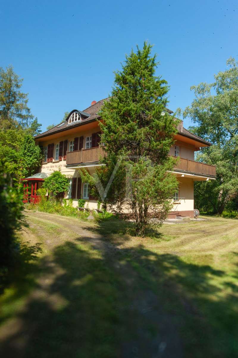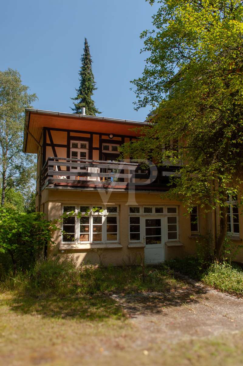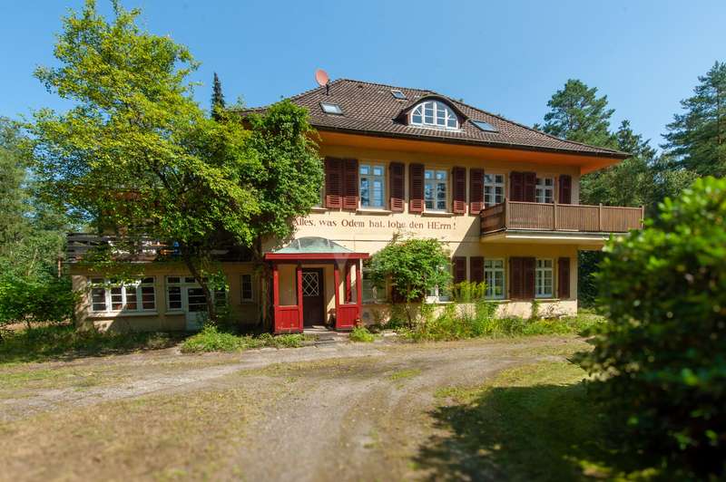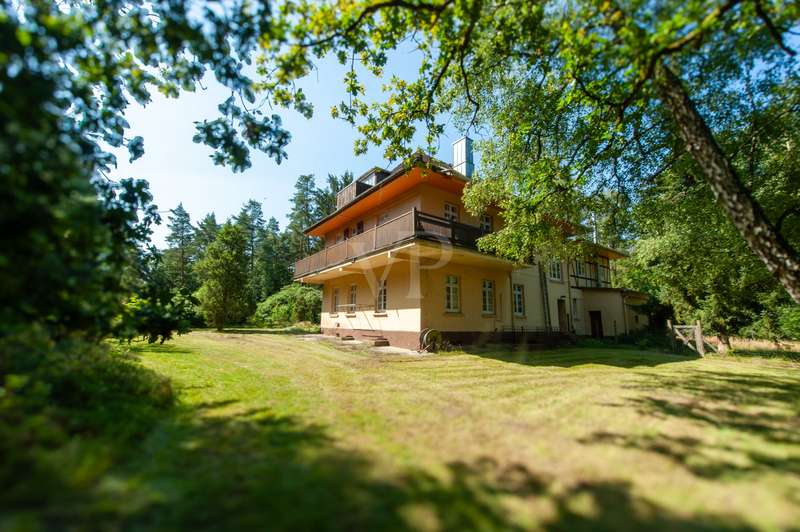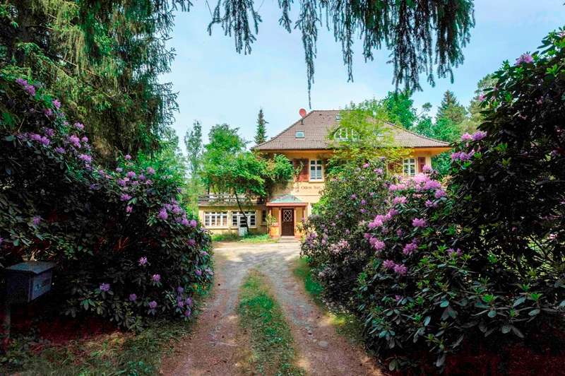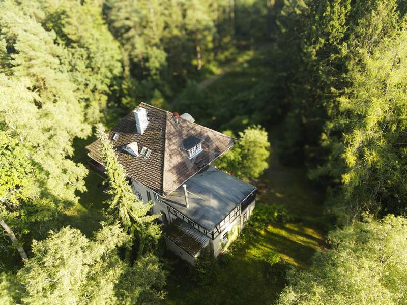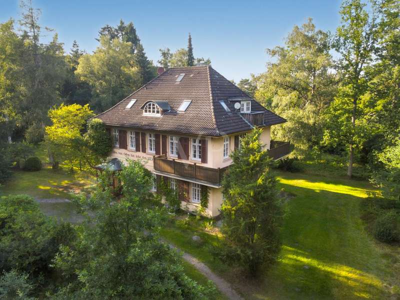 The Art Nouveau hunting villa dating from 1929 is situated on a 2.1 hectare plot with a sparse stock of old trees. The main house was converted by an architect in 1991 into three separate apartments, an apartment and a fireplace room. The apartments were extensively refurbished and modernized in keeping with their style. In 2012, an energy-efficient refurbishment was also carried out with wooden box-type windows, insulation of the air gap in the exterior masonry and insulation of the upper floor ceiling. The living space of the main house is approx. 340 square meters and is divided into a total of 13 rooms, including 8 bedrooms and 5 bathrooms. Two large balconies and a terrace invite you to relax outdoors. Three individual garages, a carport and space for 6 additional parking spaces are available for vehicles. An additional utility room, a workshop and a woodshed provide ample storage space for garden tools and other equipment. The heating system is an oil condensing boiler from 2008, supplemented by a hot water tank from 2023. The guest house on the property dates from 1957 and has 6 rooms with approx. 100 square meters and simple furnishings. It is heated by gas heating with a liquid gas tank. In contrast to the main house, this was built as a timber frame construction and has a pitched roof. The location of the property is particularly attractive, as the house is situated about 200 meters from the road in a forest clearing and the 2.1 hectare plot is not visible from the road. The property therefore offers an idyllic oasis of calm and is ideal for nature lovers and those seeking peace and quiet. Originally built by a Bremen banker and not listed as a historical monument, this Art Nouveau hunting villa presents itself as a unique and historic country house with generous interior design, modern comforts and extensive grounds in a natural setting. In addition to the property offered here, there is the possibility of acquiring an approx. 2.39 ha woodland plot in the direction of the district road.