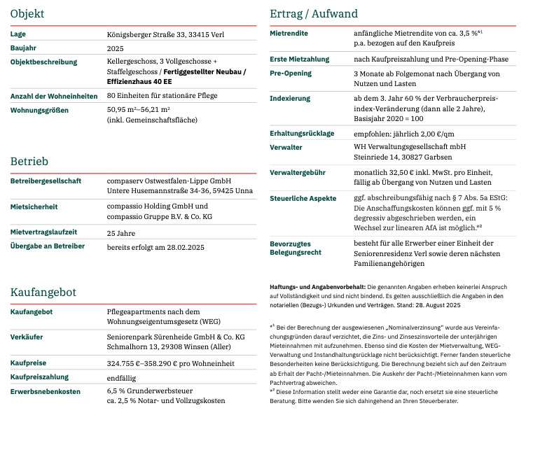 This property is presented to you by: Philipp Schremmer Office: 05201 - 15 88 02 0 Senior residence in KfW 40EE standard | 80 residential units | 25-year rental security | 50.95 m² - 56.21 m² living space The senior citizens' residence in Verl-Sürenheide offers investors a special opportunity: an investment in one or more of the 80 residential units combines the value stability of the real estate market with the growth potential of the care market secured by demographic change. 80 residential units ranging from 50.95 m² to 56.21 m² of living space (including communal areas) are being built on a plot of approx. 12,000 m² This real estate package is operated by "compaserv Ostwestfalen-Lippe GmbH, Untere Husemannstraße 34-36, 59425 Unna". The term of the contract is 25 years. This care property is also particularly attractive for investors in that it was built as a climate-friendly new build to the high-quality KfW 40EE standard. In addition, there are effective tax depreciation options for a purchase in 2025 thanks to the declining balance depreciation. This combination of sustainability, tax benefits and demographically driven demand makes the property a promising investment option in a growing market. This care property is particularly attractive for investors due to several positive factors. In addition to the inpatient nursing home, the compassio Group also operates a day care and assisted living facility next door. This means that three concepts for needs-based living in old age are offered "from a single source". This creates short distances and synergy effects - and contributes to the supra-regional attractiveness of the residence. Would you like more information? We would be happy to arrange an appointment with you. Only written inquiries with full address and telephone number can be processed. A viewing can only take place with a financing confirmation. If you need further assistance in this regard, we will be happy to put you in touch with our colleagues at VON POLL FINANCE.