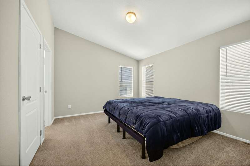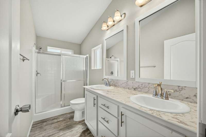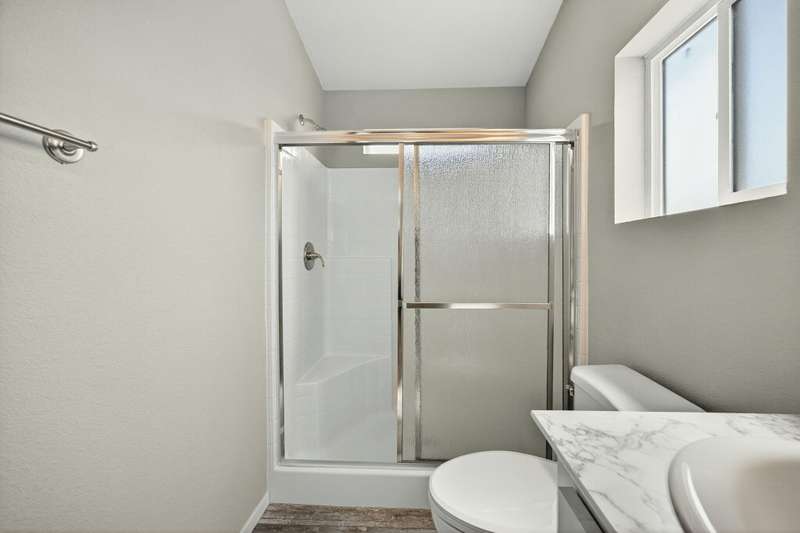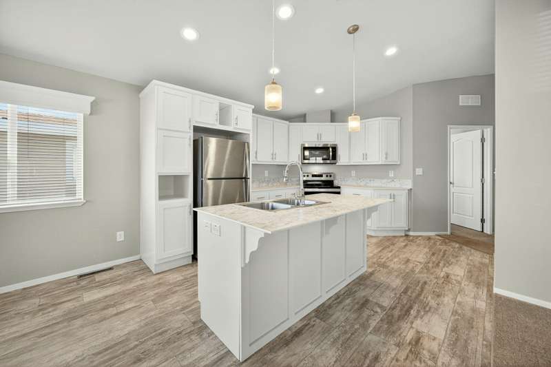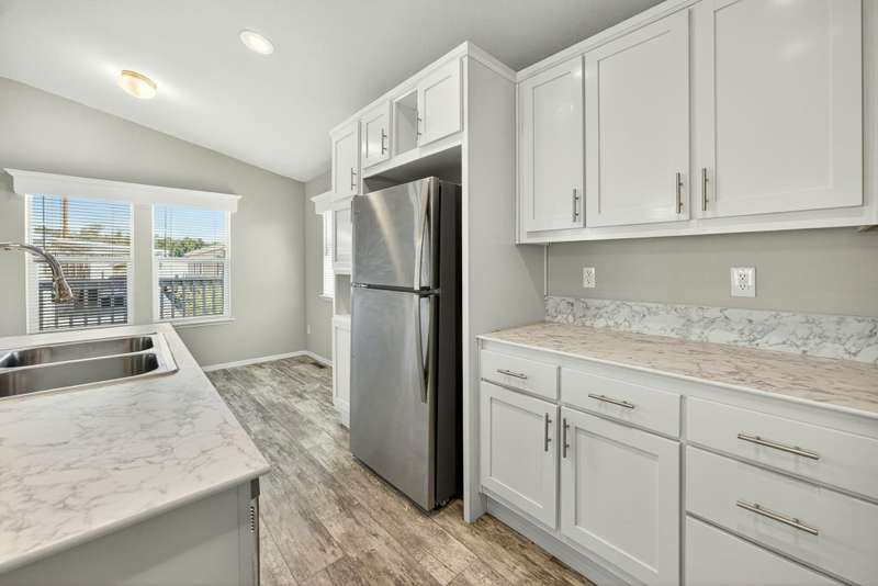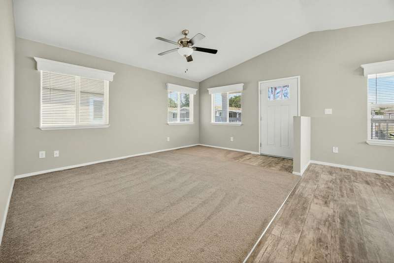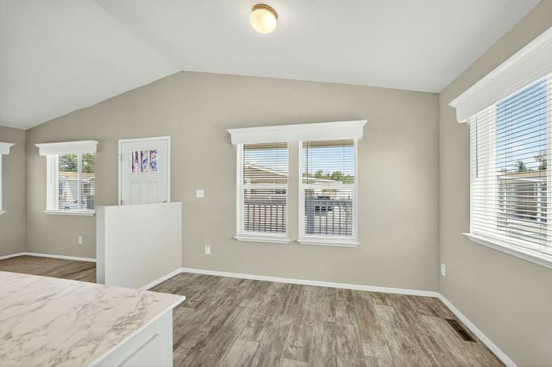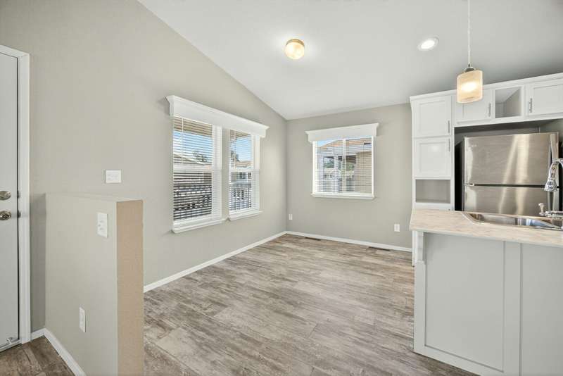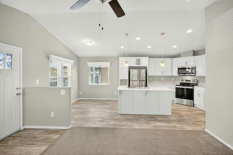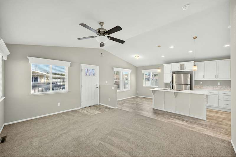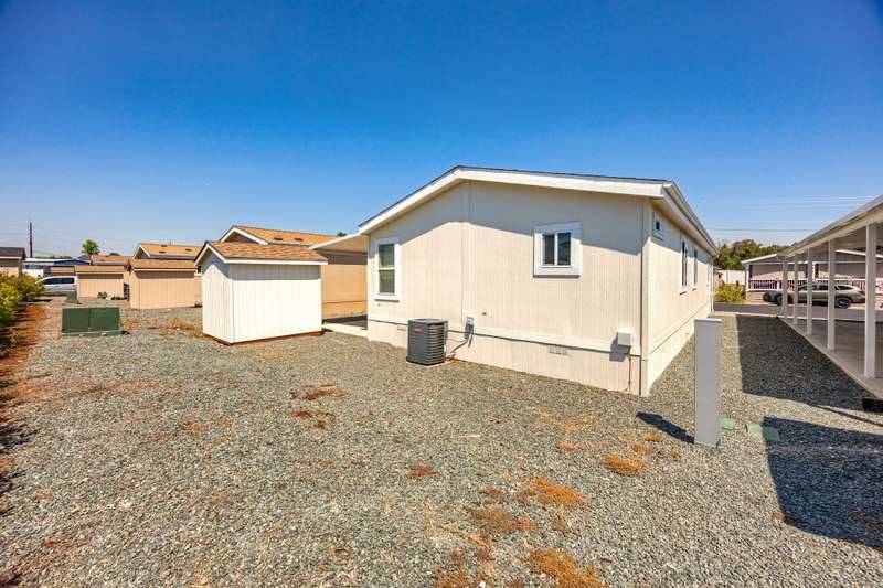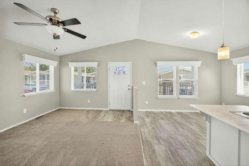 This lovely home is move-in ready! Located in the beautiful, all ages welcome, Medford Estates. A fabulous 4-bedroom, open floor plan with 2 walk-in closets. Vaulted ceilings and great natural light flow in the home. Solid surface countertops and laminate floors. This home comes with all the appliances, including the refrigerator. Covered porch out front to enjoy as well a carport. The carport should fit about 2 cars back to front. The lot is low maintenance landscaping with a storage shed. Enjoy the park's many amenities like a basketball court, billiards room, fitness center, pickleball, Dog park, playground, BBQ area, clubhouse, whirlpool and swimming pool.
