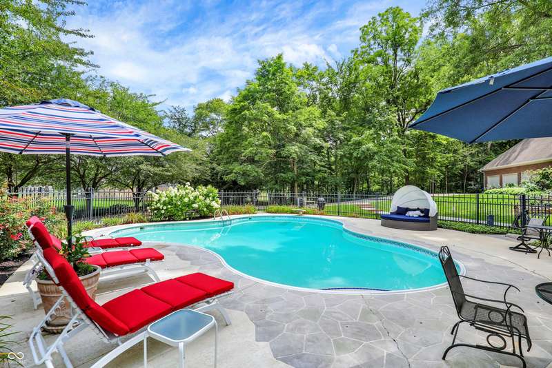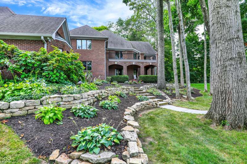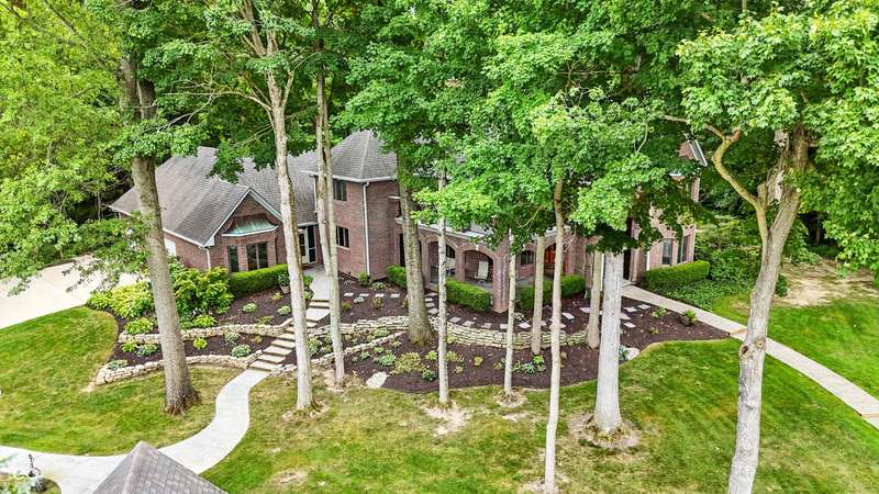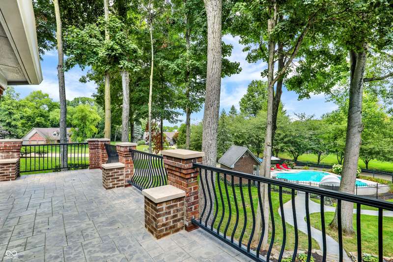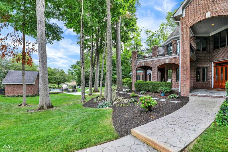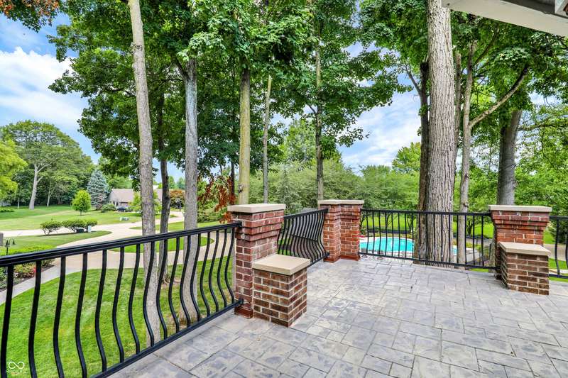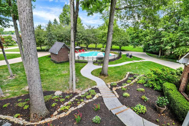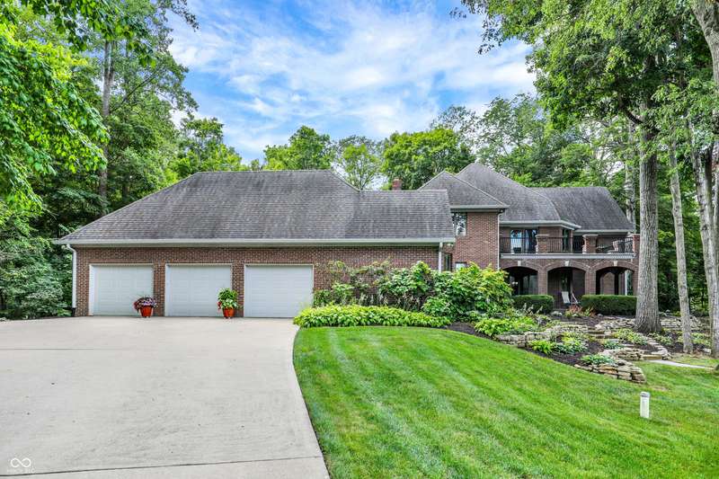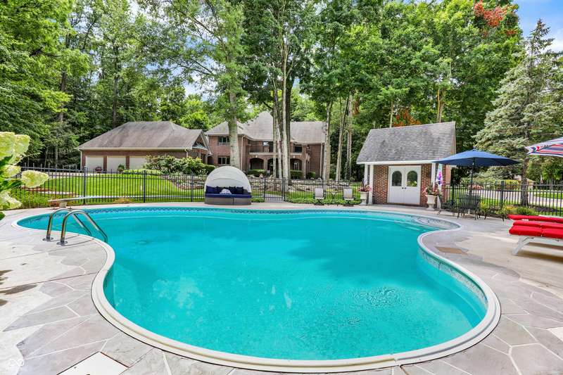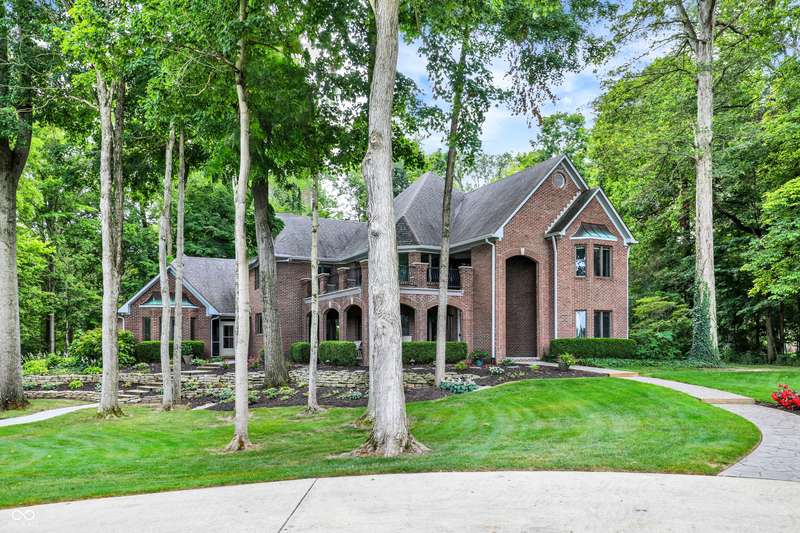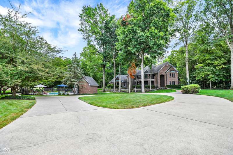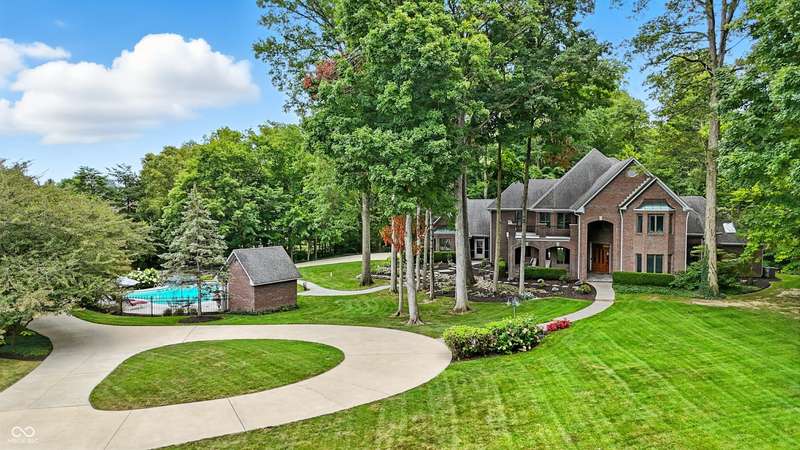This beautiful property is a special opportunity for those searching for their perfect place. It offers an ideal combination of location, appeal, quality, and functionality. Driving up the circular drive, you'll pass the pool house and arrive at this timeless full brick custom home, tucked away on 2.23 wooded acres. It features arched porches, a balcony overlooking the property, and beautifully landscaped gardens. The sidewalk leads to a functional front porch and a 20x15 entry that opens to the rest of this well-flowing home. The spacious yet cozy rooms include a great room with a soaring ceiling and a floor-to-ceiling stone fireplace. The formal dining room can accommodate the largest tables, while the custom kitchen offers plenty of character, space and charm. It shares space with a breakfast nook that provides views of the natural beauty of the private rear yard. The main floor master bedroom is a true suite, featuring an eye-catching sitting room and a private enclosed sun room. The en-suite bath includes a soaking tub, steam shower, attractive cabinetry, and a walk-in closet. Additionally, you'll find a 16x13 laundry room that can double as a sewing or craft room, along with a nicely trimmed office. Upstairs offers a large functional loft that separates two additional bedrooms and provides access to the balcony with the best views in the neighborhood. The finished basement offers 2 large entertaining areas, a 2 room exercise area along with 2 unfinished storage rooms. Outside is a nature lovers dream whether you're enjoying the rear patio space and hot tub or spending the hot summer days in the pool! The trees along the drive and the home are both nicely lit for a beautiful evening ambiance. All this within an easy commute to Downtown Indianapolis or into Hamilton County!