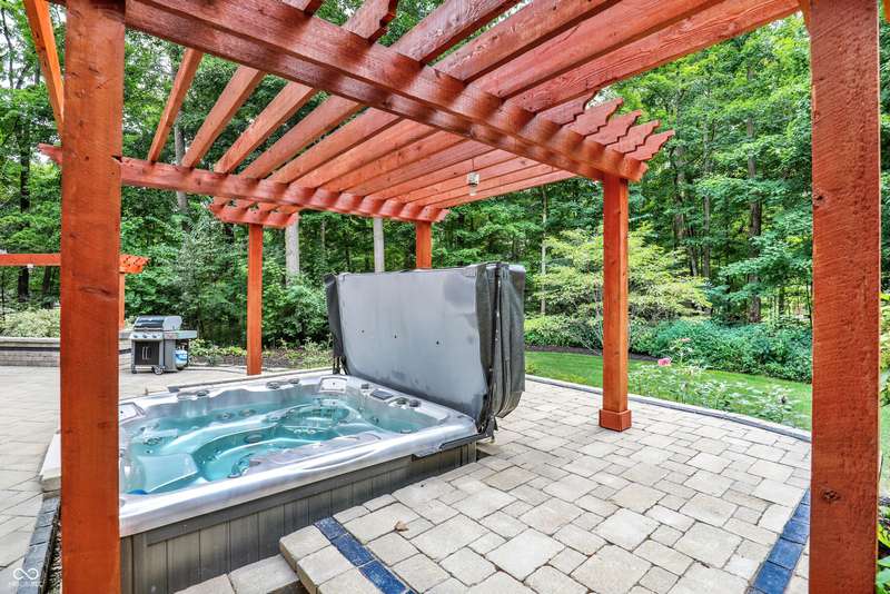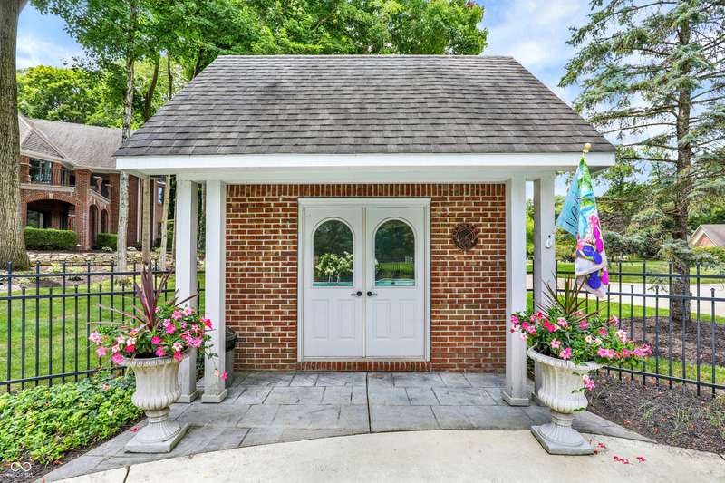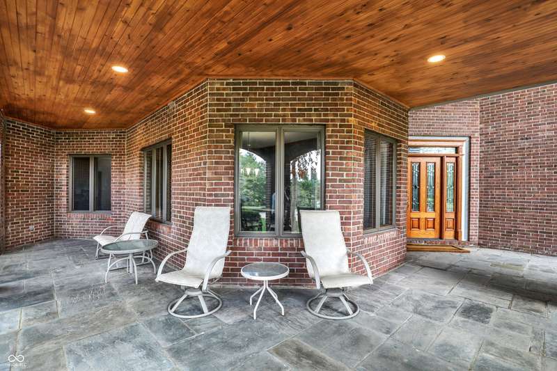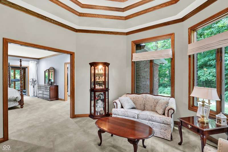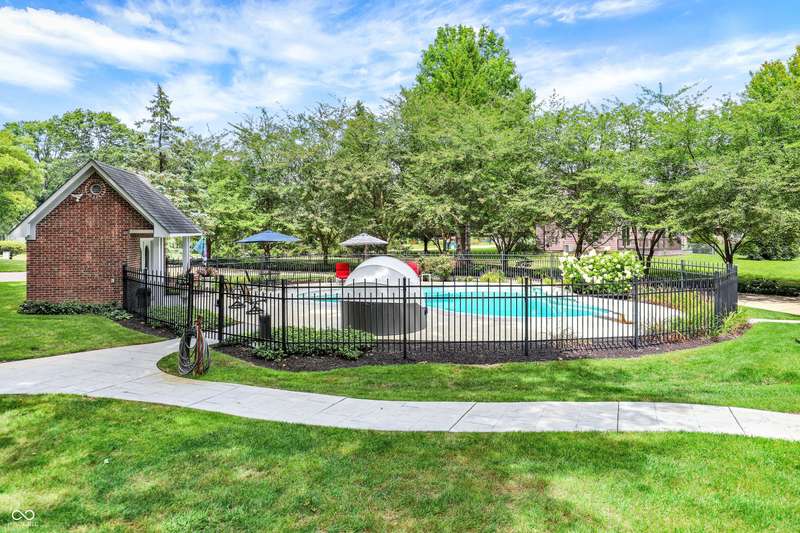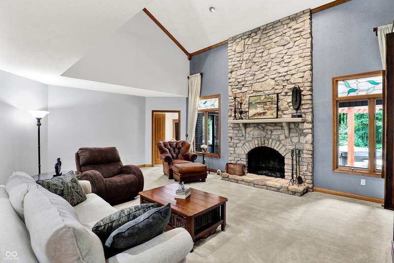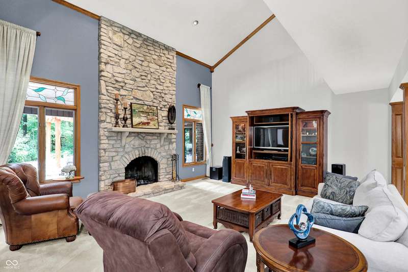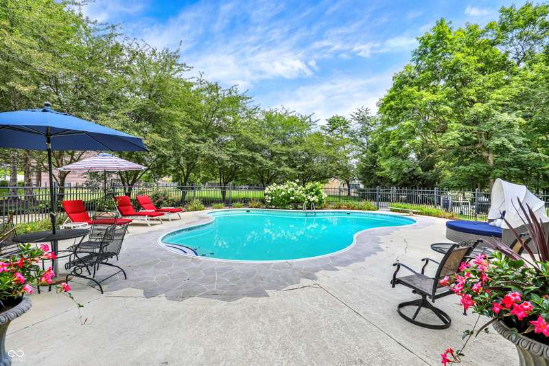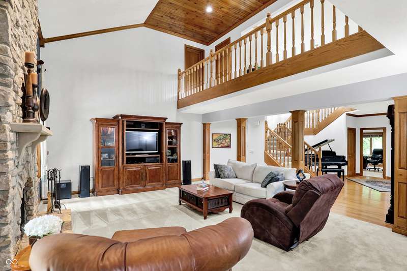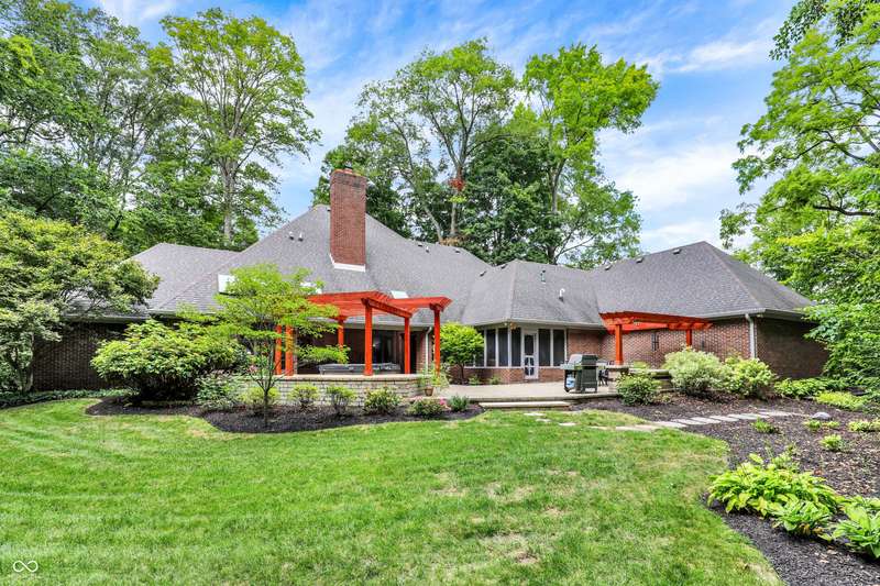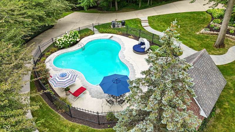 This beautiful property is a special opportunity for those searching for their perfect place. It offers an ideal combination of location, appeal, quality, and functionality. Driving up the circular drive, you'll pass the pool house and arrive at this timeless full brick custom home, tucked away on 2.23 wooded acres. It features arched porches, a balcony overlooking the property, and beautifully landscaped gardens. The sidewalk leads to a functional front porch and a 20x15 entry that opens to the rest of this well-flowing home. The spacious yet cozy rooms include a great room with a soaring ceiling and a floor-to-ceiling stone fireplace. The formal dining room can accommodate the largest tables, while the custom kitchen offers plenty of character, space and charm. It shares space with a breakfast nook that provides views of the natural beauty of the private rear yard. The main floor master bedroom is a true suite, featuring an eye-catching sitting room and a private enclosed sun room. The en-suite bath includes a soaking tub, steam shower, attractive cabinetry, and a walk-in closet. Additionally, you'll find a 16x13 laundry room that can double as a sewing or craft room, along with a nicely trimmed office. Upstairs offers a large functional loft that separates two additional bedrooms and provides access to the balcony with the best views in the neighborhood. The finished basement offers 2 large entertaining areas, a 2 room exercise area along with 2 unfinished storage rooms. Outside is a nature lovers dream whether you're enjoying the rear patio space and hot tub or spending the hot summer days in the pool! The trees along the drive and the home are both nicely lit for a beautiful evening ambiance. All this within an easy commute to Downtown Indianapolis or into Hamilton County!
