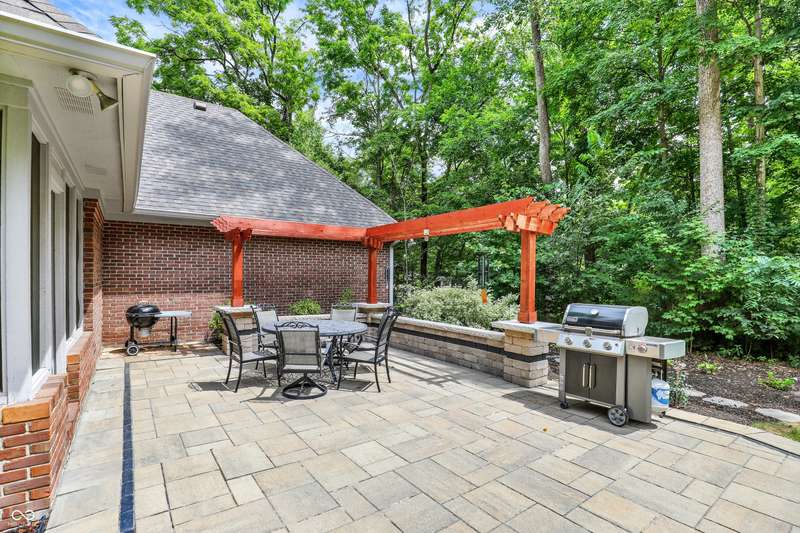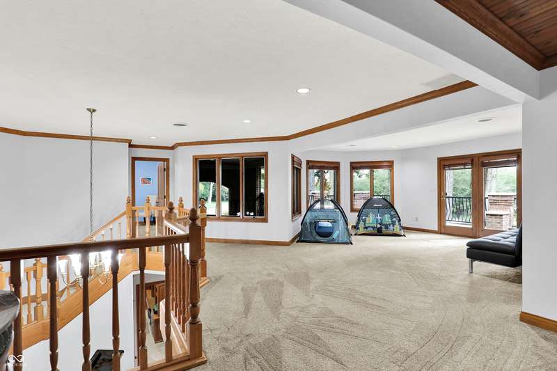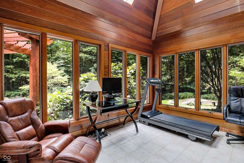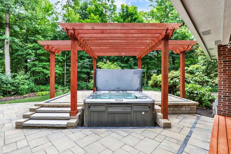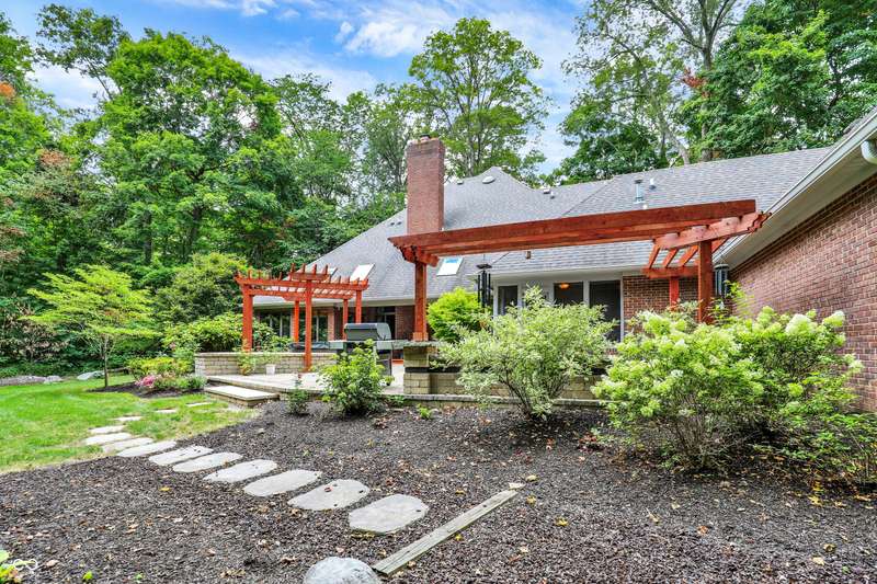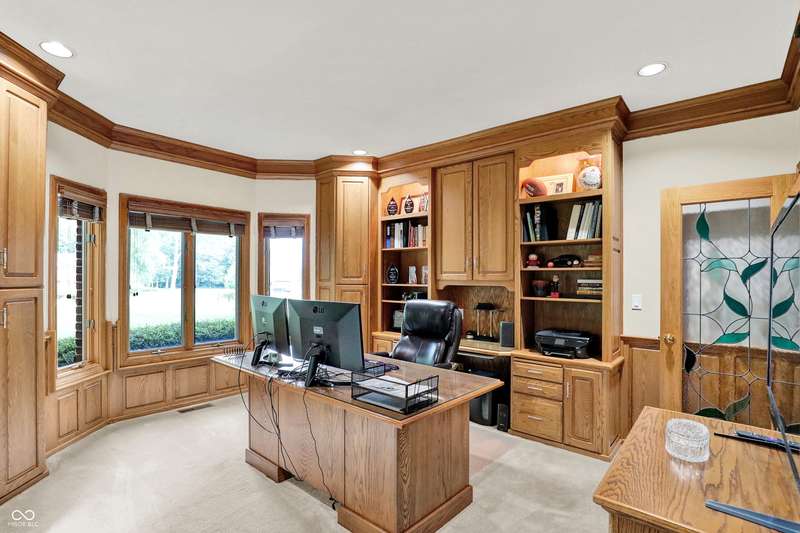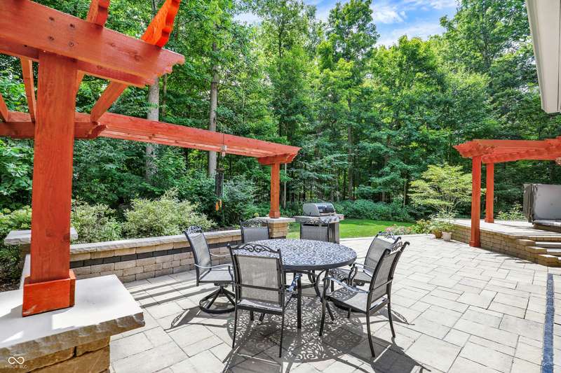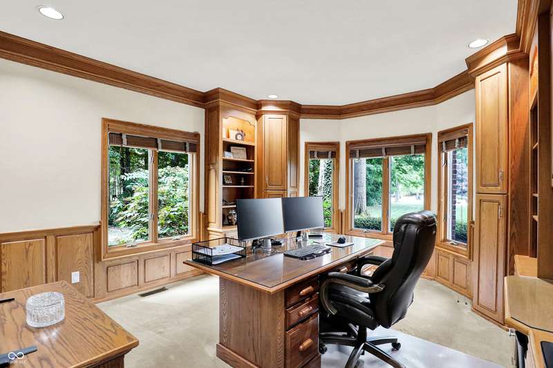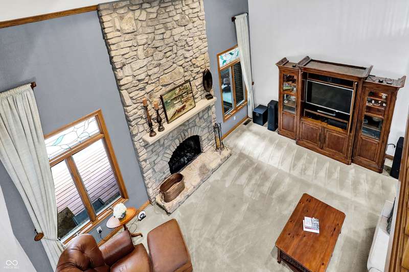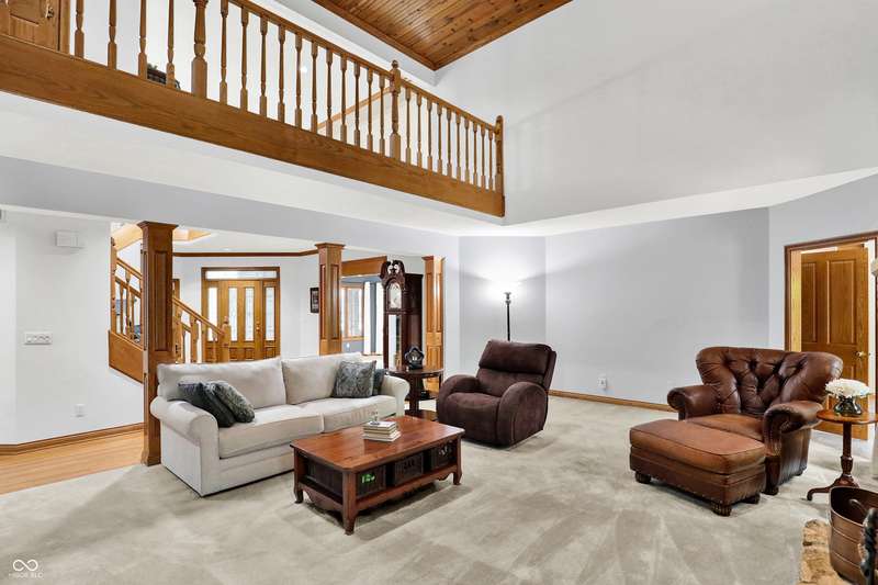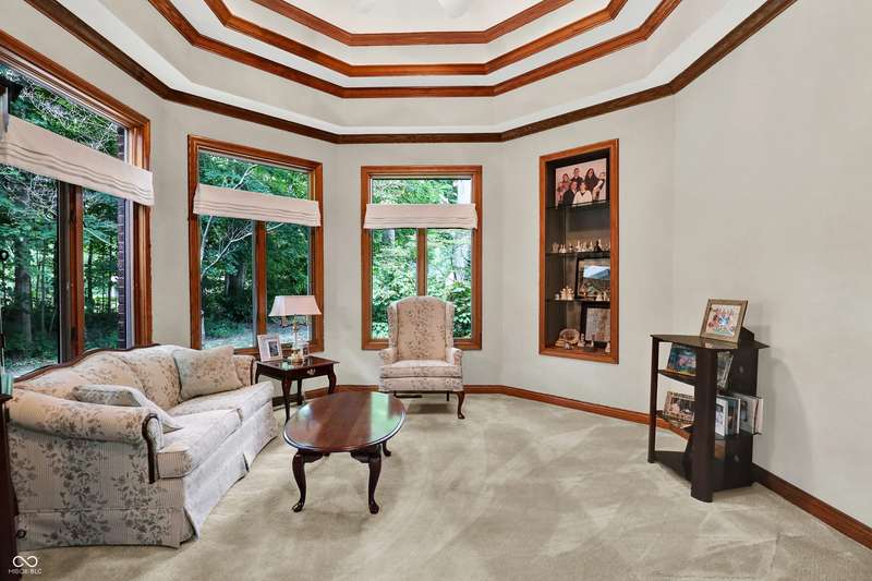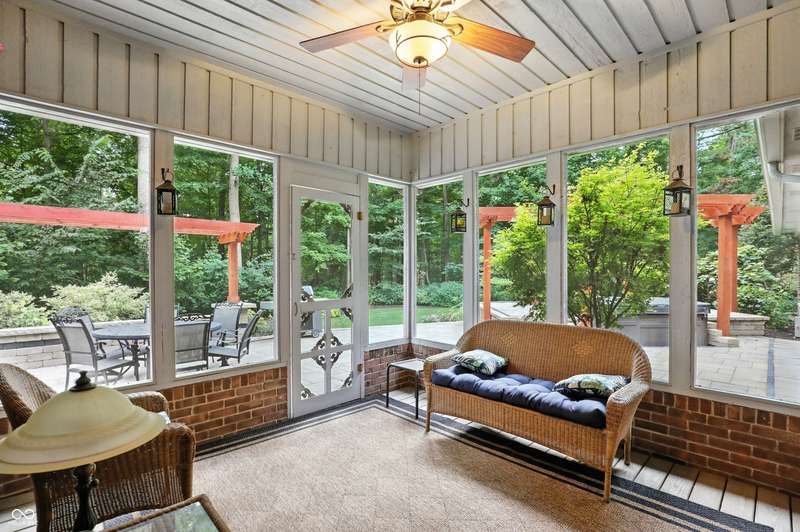 This beautiful property is a special opportunity for those searching for their perfect place. It offers an ideal combination of location, appeal, quality, and functionality. Driving up the circular drive, you'll pass the pool house and arrive at this timeless full brick custom home, tucked away on 2.23 wooded acres. It features arched porches, a balcony overlooking the property, and beautifully landscaped gardens. The sidewalk leads to a functional front porch and a 20x15 entry that opens to the rest of this well-flowing home. The spacious yet cozy rooms include a great room with a soaring ceiling and a floor-to-ceiling stone fireplace. The formal dining room can accommodate the largest tables, while the custom kitchen offers plenty of character, space and charm. It shares space with a breakfast nook that provides views of the natural beauty of the private rear yard. The main floor master bedroom is a true suite, featuring an eye-catching sitting room and a private enclosed sun room. The en-suite bath includes a soaking tub, steam shower, attractive cabinetry, and a walk-in closet. Additionally, you'll find a 16x13 laundry room that can double as a sewing or craft room, along with a nicely trimmed office. Upstairs offers a large functional loft that separates two additional bedrooms and provides access to the balcony with the best views in the neighborhood. The finished basement offers 2 large entertaining areas, a 2 room exercise area along with 2 unfinished storage rooms. Outside is a nature lovers dream whether you're enjoying the rear patio space and hot tub or spending the hot summer days in the pool! The trees along the drive and the home are both nicely lit for a beautiful evening ambiance. All this within an easy commute to Downtown Indianapolis or into Hamilton County!