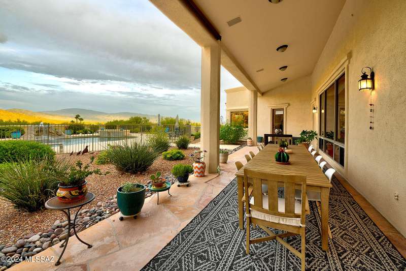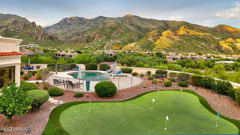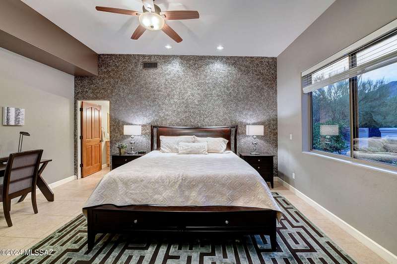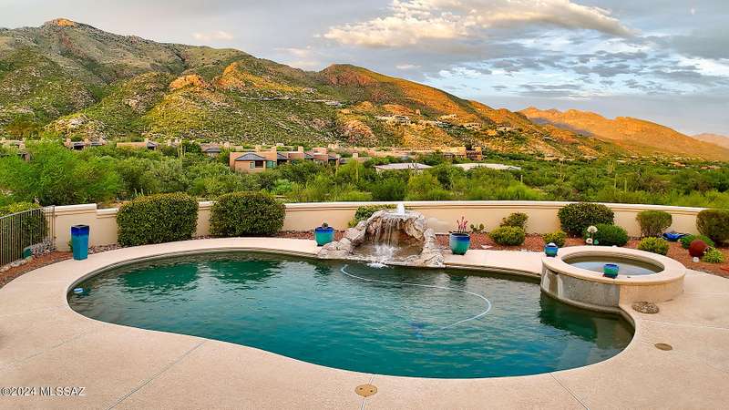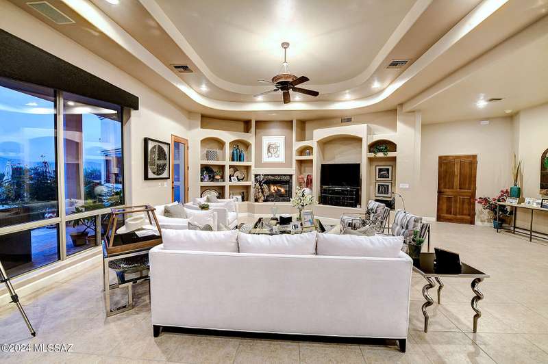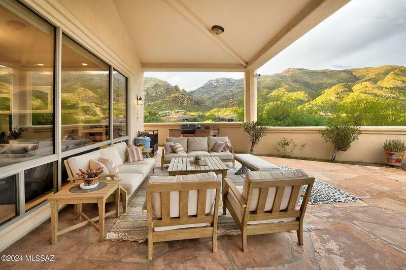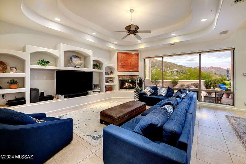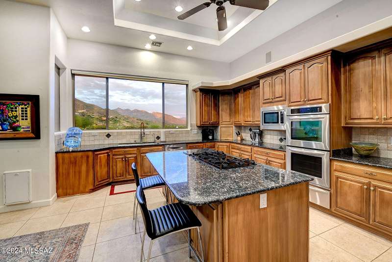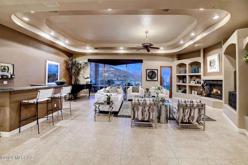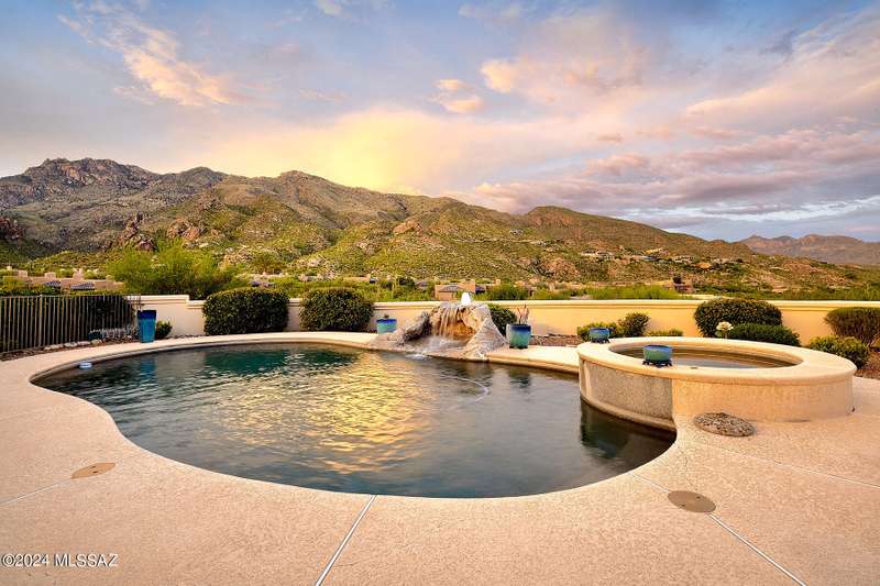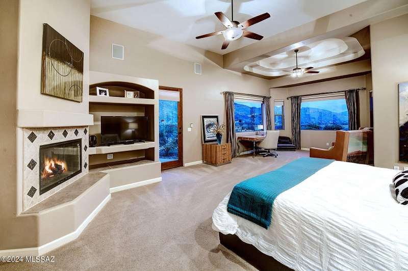 Stunning Mediterranean/contemporary in prestigious, gated Miramist at Ventana in the Catalina Foothills high above Tucson. Located on a cul-de-sac on a 1.45 acre hilltop lot, this 5,735 sq. ft., 5-bedroom, 5 1/2-bath home offers breathtaking views . . . picture windows focus on the center of Ventana Canyon itself, with views from the Catalina to the Rincon Mountains, of Sabino Canyon and city light views of Tucson. With no interior steps, enter into living room with soaring ceilings, walls of windows, formal dining room, fireplace and wet bar, leading into expansive family room/gourmet kitchen with fireplace, kitchen island granite counters and stainless steel appliances. Gracious primary suite is 17'7'' x 31'11'' with fireplace, dual vanities, generous primary closet and spa tub.