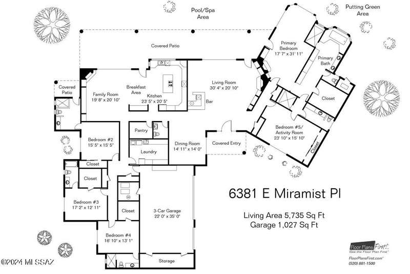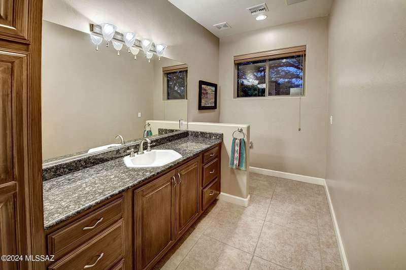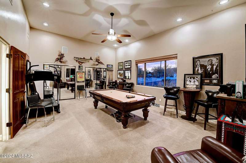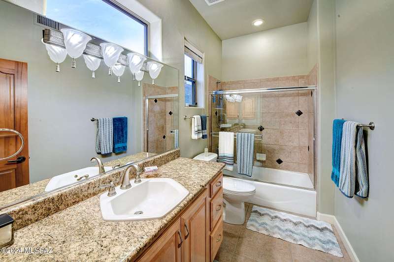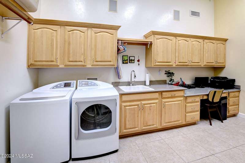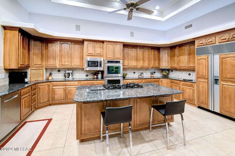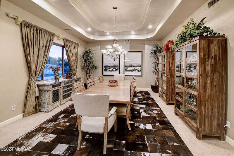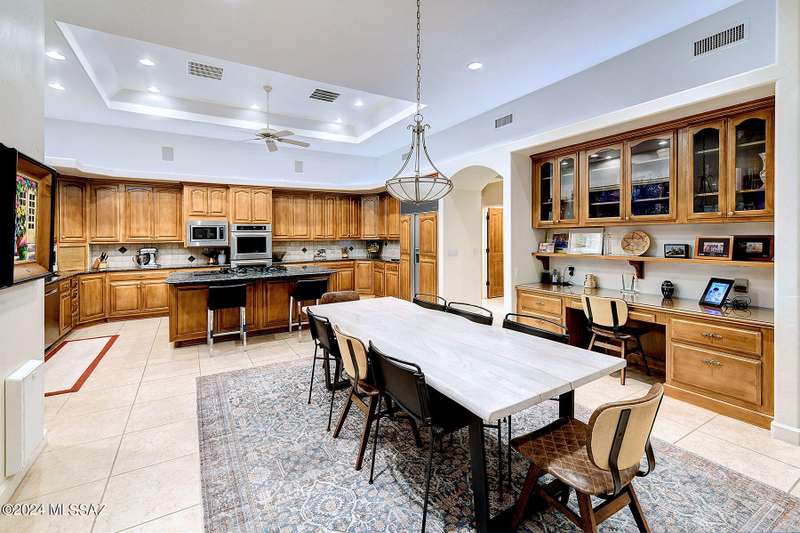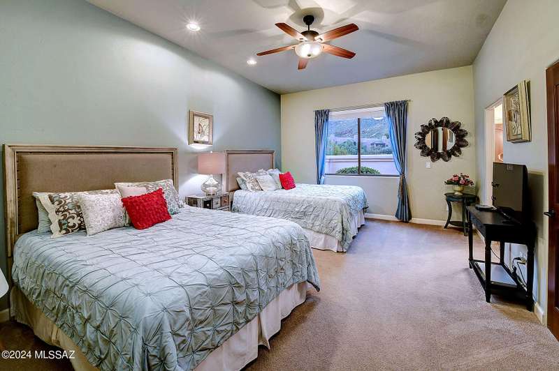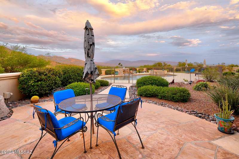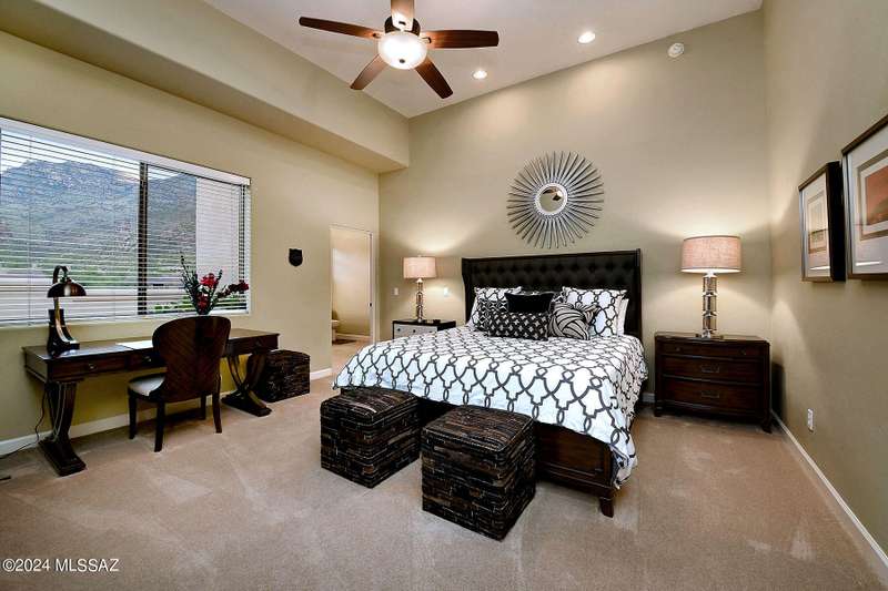 Stunning Mediterranean/contemporary in prestigious, gated Miramist at Ventana in the Catalina Foothills high above Tucson. Located on a cul-de-sac on a 1.45 acre hilltop lot, this 5,735 sq. ft., 5-bedroom, 5 1/2-bath home offers breathtaking views . . . picture windows focus on the center of Ventana Canyon itself, with views from the Catalina to the Rincon Mountains, of Sabino Canyon and city light views of Tucson. With no interior steps, enter into living room with soaring ceilings, walls of windows, formal dining room, fireplace and wet bar, leading into expansive family room/gourmet kitchen with fireplace, kitchen island granite counters and stainless steel appliances. Gracious primary suite is 17'7'' x 31'11'' with fireplace, dual vanities, generous primary closet and spa tub.