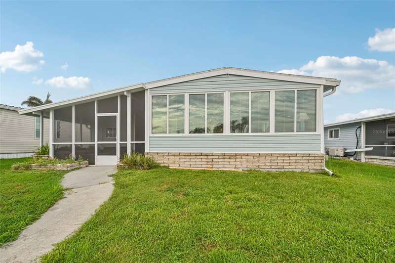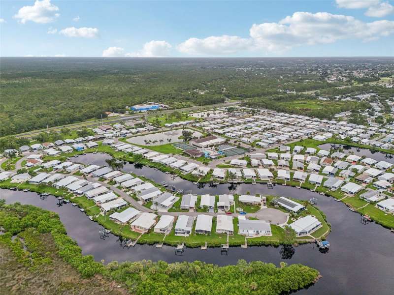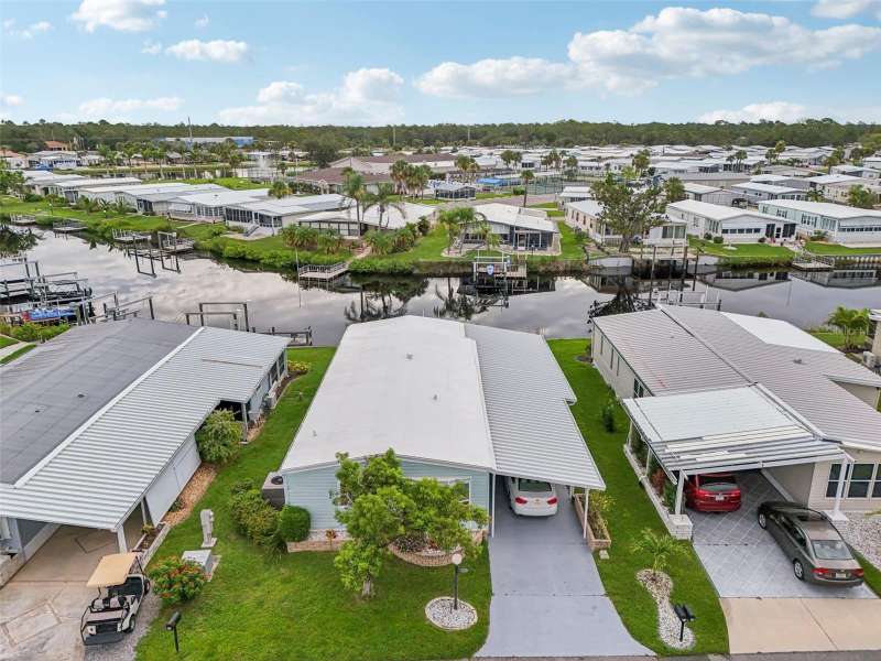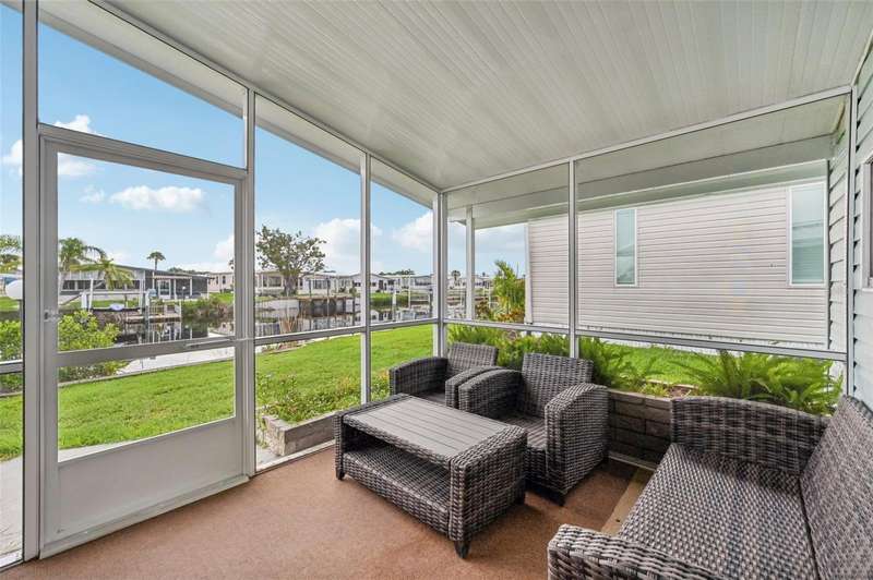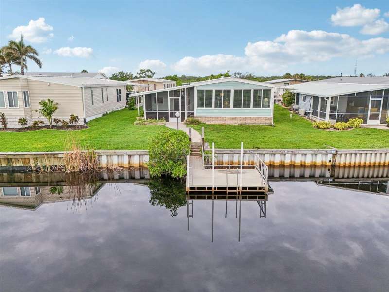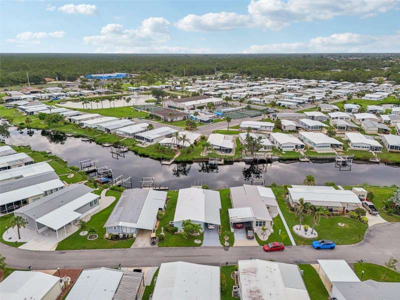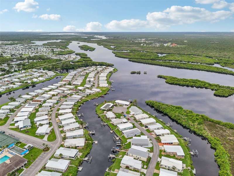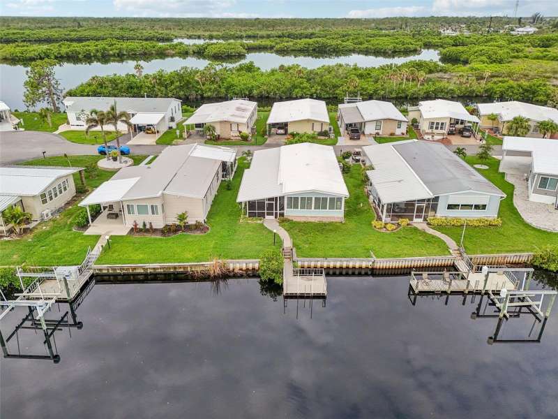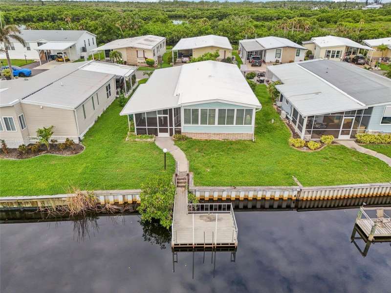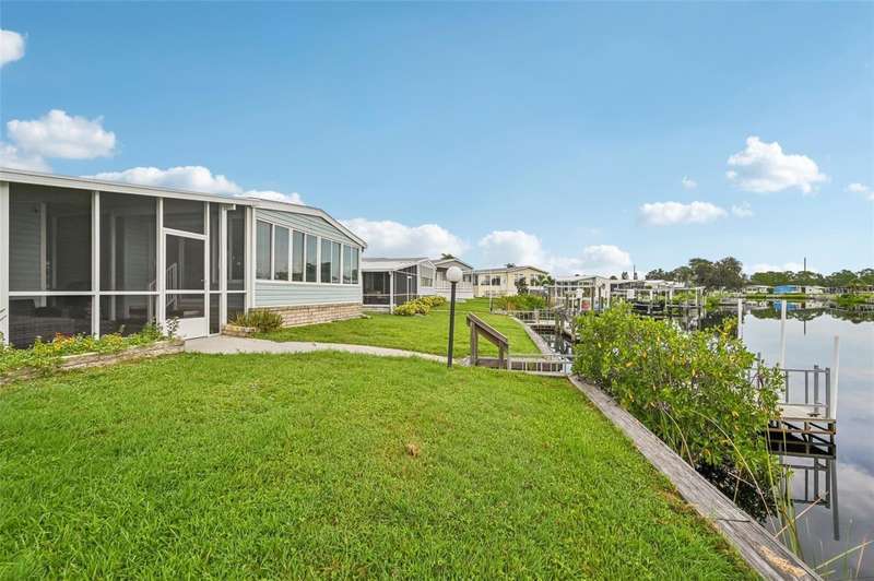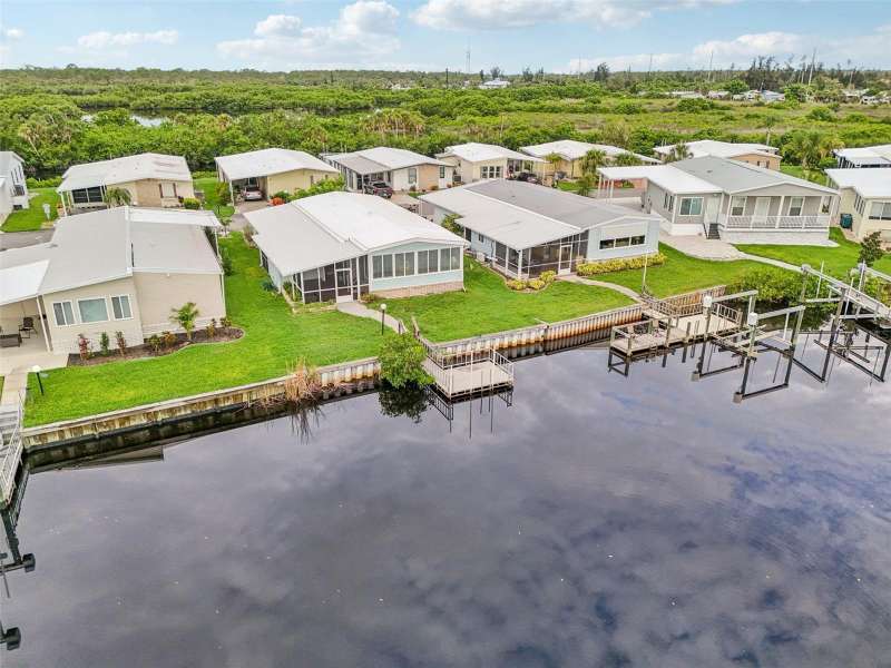 Welcome to this spacious 2 bedroom, 2 bathroom canal front manufactured home located in the sought-after boating community of Lazy River Village in North Port, Florida. Perfectly situated on the water with its own private dock, this home is being offered turnkey furnished and is located in the pet section of the community. It features an open floor plan ideal for both entertaining and everyday living. The remodeled kitchen flows seamlessly into the living area, where a long bank of windows frames beautiful canal views and fills the space with natural light. Vaulted ceilings add to the open, airy atmosphere, and new sliding doors lead to a screened-in lanai where you can relax and enjoy the tranquil water view. The primary suite includes a walk-in closet plus two additional closets for extra storage, while the guest bedroom also offers a walk-in closet and an updated vanity in the guest bath. Recent updates include new windows throughout, a new roof in 2023, a new carport in 2025, a 2019 AC system, and a hot water heater installed in 2023. Lazy River Village is a premier 55+ community known for its active lifestyle and beautiful waterfront setting. Residents enjoy access to a private marina, boat ramps, kayak launch, heated pool, tennis and pickleball courts, fitness center, and a wide range of social clubs and planned activities. With its friendly atmosphere and stunning natural surroundings, Lazy River Village is the perfect place to enjoy life on the water.