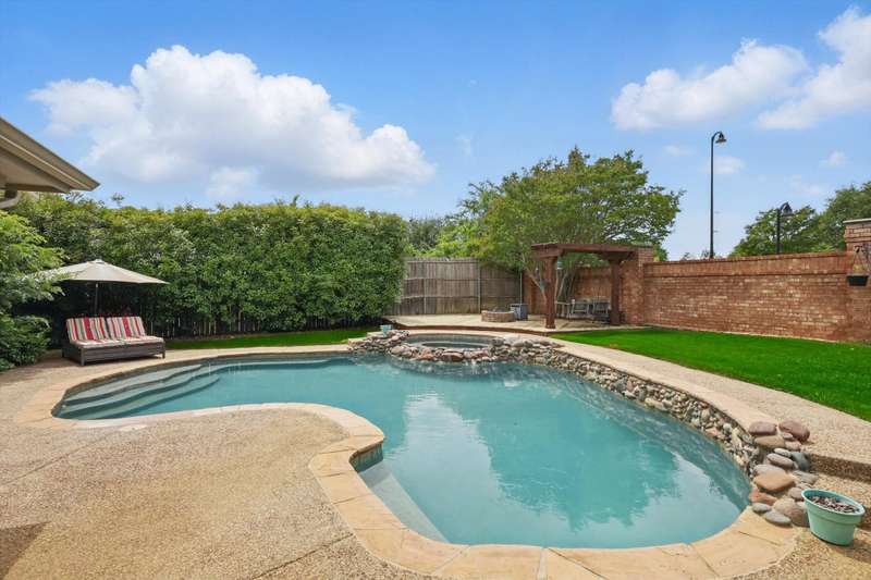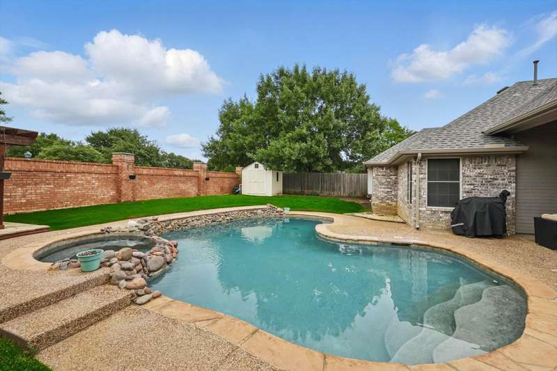 Welcome to 8133 Pecan Ridge Drive A North Richland Hills Gem in Keller ISD! From the moment you arrive, youll be captivated by the curb appeal of this beautifully maintained home. A spacious circle drive and fresh landscaping offer a warm welcome and provide the perfect parking solution for entertaining guests! Step inside to a generously sized living room with a cozy gas fireplace, ideal for relaxing evenings or lively gatherings. The kitchen is a dream for any home chef, featuring extensive counter space, abundant cabinetry, and modern appliances ready for your next culinary creation. The private primary suite is thoughtfully tucked away from the rest of the home, offering a peaceful retreat complete with a spa-like ensuite featuring dual sinks, two separate closets, a separate shower, and a jacuzzi tub for ultimate relaxation. Two additional bedrooms are located on the opposite side of the home, connected by a Jack-and-Jill style bathroom. A fourth bedroom, perfect for guests or a home office, is tucked away at the back of the house next to the third full bathroom. Enjoy year-round living in the sunroom, or take the fun outside to your private backyard oasis complete with a sparkling pool, pergola, fire pit, and a storage shed for all your outdoor needs. Think it can't get any better? Think again! This home also features a new roof and gutters (2022), HVAC system overhaul including ductwork (2023), pool and jacuzzi pump replaced (2022), and no carpet throughout the home (to name a few). Zoned for highly-rated Keller ISD schools including Liberty Elementary and with convenient access to shopping, dining, and your favorite local coffee spots, you do not want to miss your opportunity to own this move-in-ready beauty in a prime North Richland Hills location!