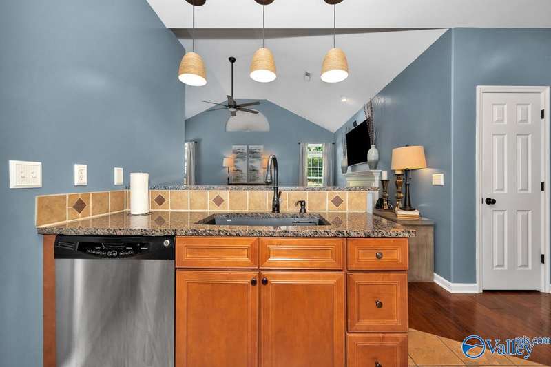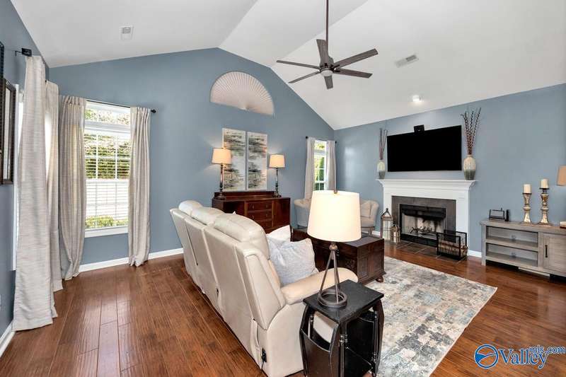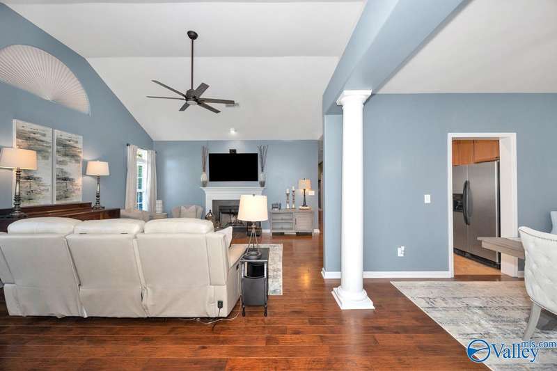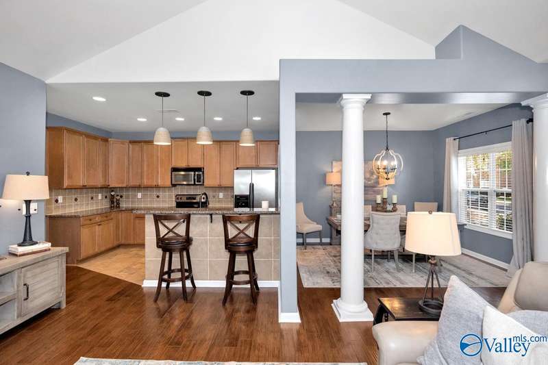 Prime end unit w/ unbeatable convenience! This spacious 2-bedroom, 2-bath townhome showcases beautiful hand-scraped hardwood flowing through the living spaces & thoughtfully updated kitchen & baths. Step into the elegant dining area w/ its striking column details & seamless flow into the family room, w/ soaring vaulted ceilings, a cozy fireplace & floor-to-ceiling windows that flood the space w/ sunlight. The kitchen boasts sleek granite counters, composite sink, stainless appliances, & tile backsplash. Retreat to the generous primary suite with ensuite featuring tile shower and granite countertops. Complete with a 2-car garage, community pool and clubhouse; don't let this one get away!