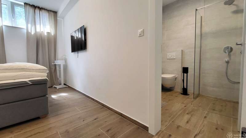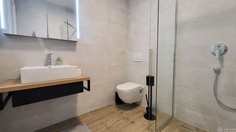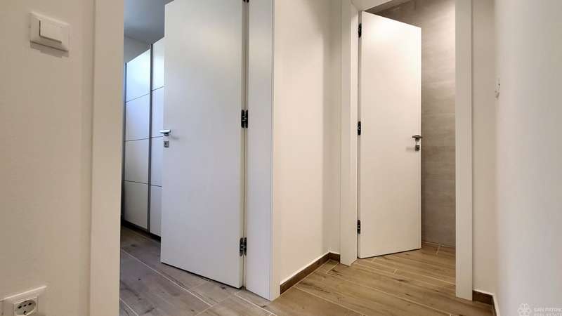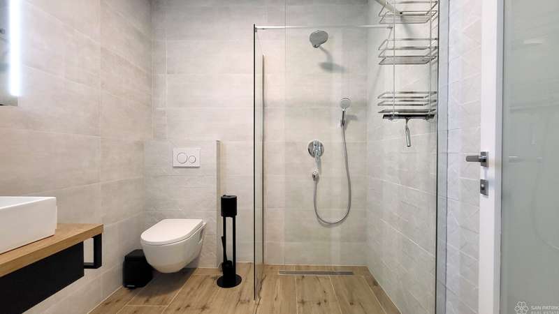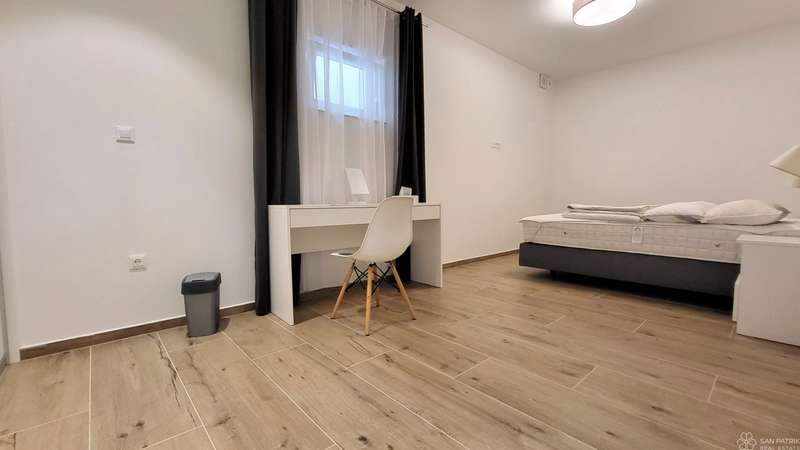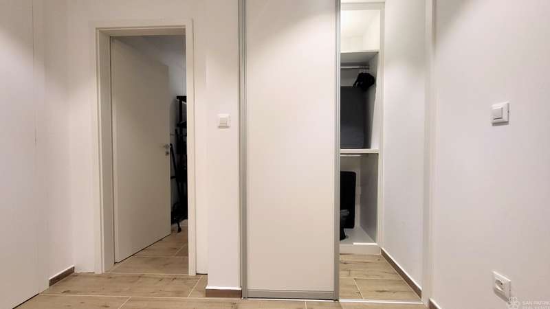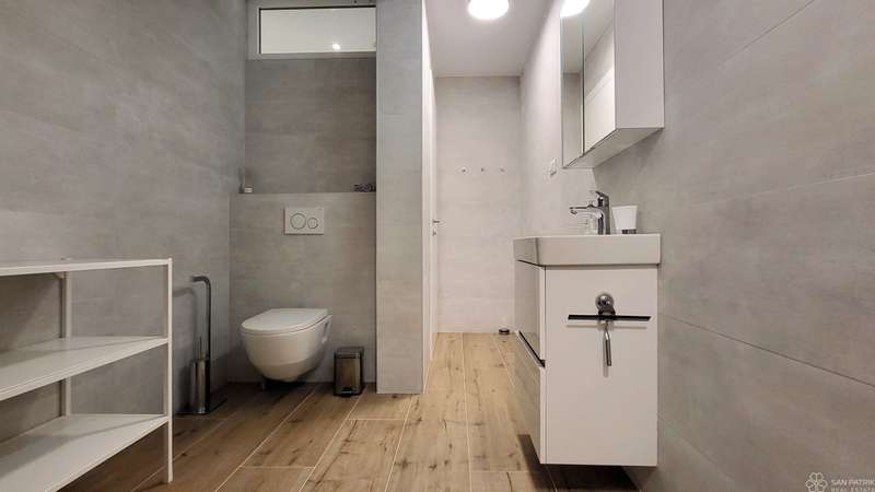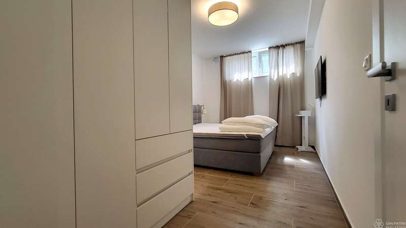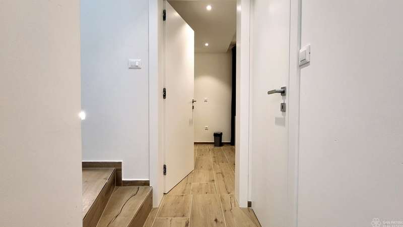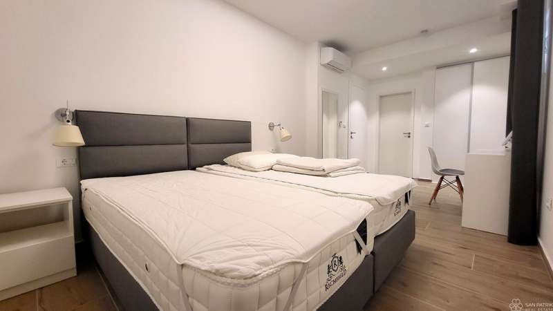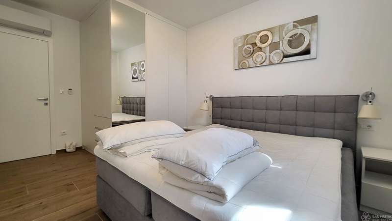 The apartment is fully furnished with high-quality furniture, including carpentry furniture. It is equipped with underfloor heating in all rooms, air conditioning, a ventilation system, PVC joinery, electric shutters and sun shades on the ground floor windows. The property also includes two parking spaces. The apartment has never been rented out to tourists, but has all the necessary documentation for tourist rentals, making it suitable for investment.