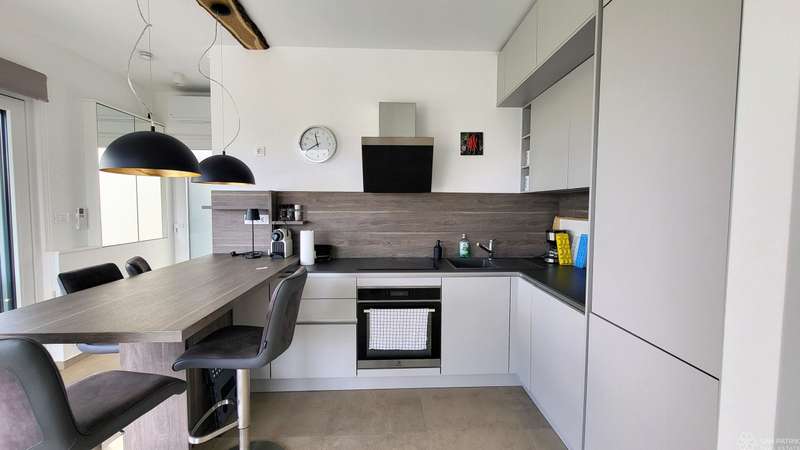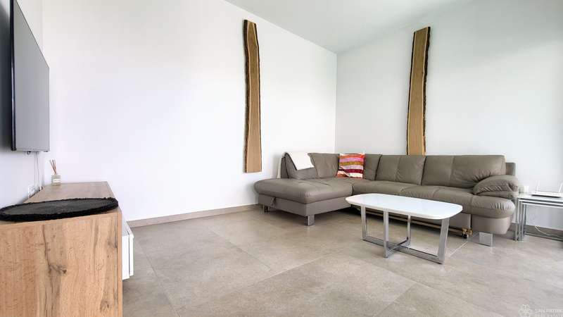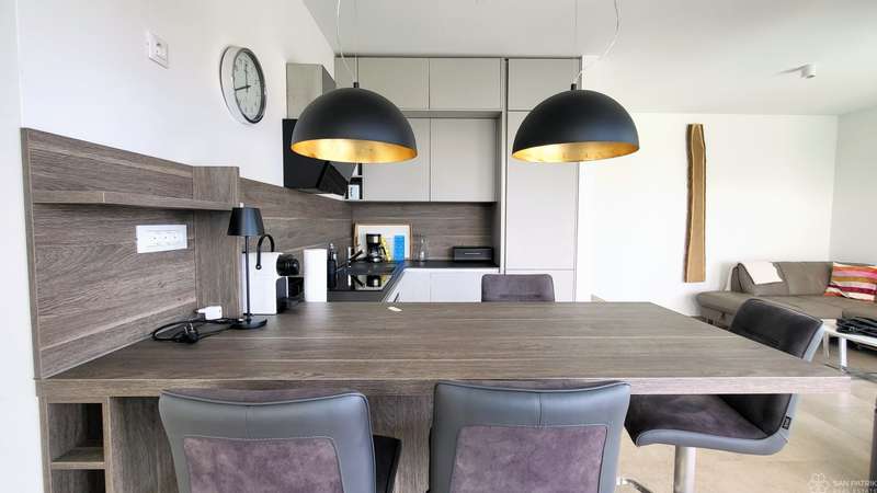 The apartment consists of 118 m2 of living space with a landscaped garden of 108 m2 and a private swimming pool measuring 12.5 m2. It is spread over two floors - a basement and a raised ground floor. The basement has a hallway, three bedrooms, two bathrooms and two storage rooms with a washing machine and dryer. The ground floor includes a fully equipped custom-made kitchen, a dining room and a spacious living room with access to a covered terrace of 14.93 m2.