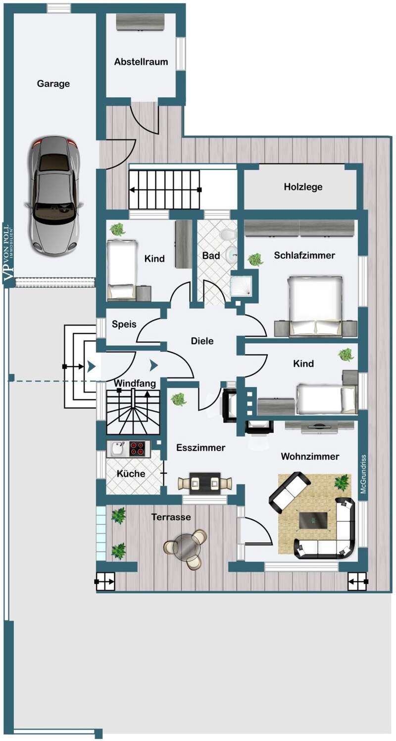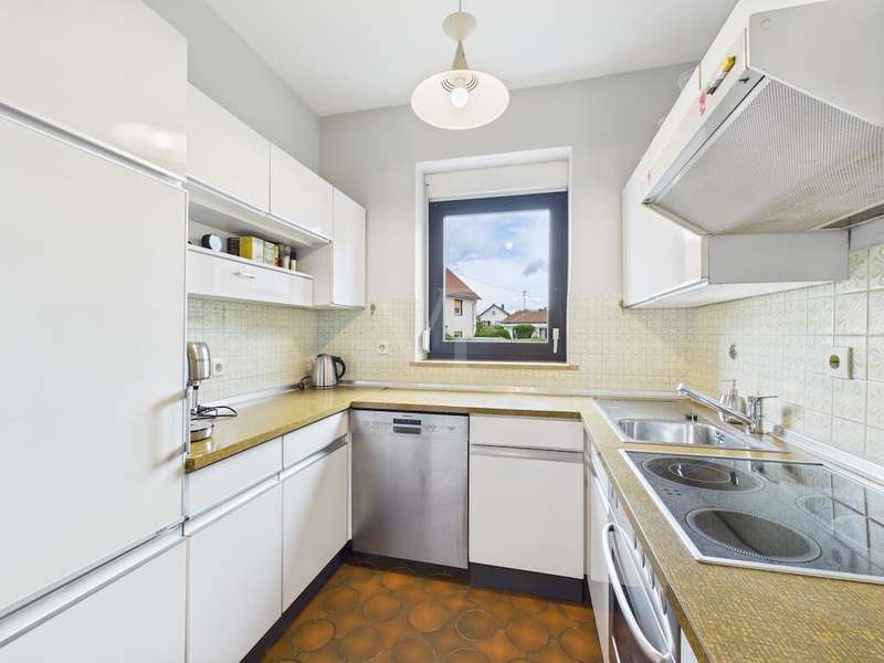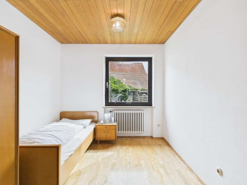 Spacious and comfortable detached house with attic granny apartment, incl. terrace, balcony, cellar, large garage with annex and ingrown, view-protected garden in a pleasant residential area. The detached house with a living space of approx. 171 m² and a plot size of approx. 584 m² was originally built in approx. 1960, extended in approx. 1966 and extended in approx. 1982. On the first floor is the family-friendly main apartment on one level with living room incl. covered terrace, kitchen, dining room, bedroom, two children's rooms, bathroom, pantry and hallway. The first floor is already available for occupation. With the addition of a storey in 1982, the property was extended by a very cozy attic apartment with living room incl. covered balcony, kitchen, dining room, bedroom, guest room, bathroom, storage room and hallway. The granny apartment has been rented to an elderly, very nice lady at a reasonable price since around 2011. In addition, the house has a basement in the area of the originally built residential building. There is a large hobby room, a cellar bar, the utility room with a covered external cellar staircase, a WC and the boiler room with tank room. In addition to the residential building, there is also a very large garage, approx. 10.43 m x 3.06 m, with an additional storage room for garden tools or similar. Please note: The basement of the property is in need of renovation due to basement damp.