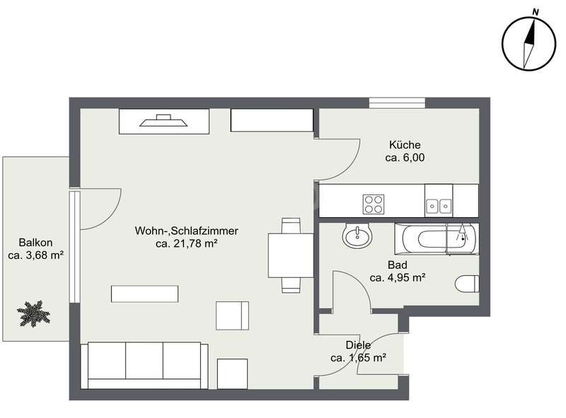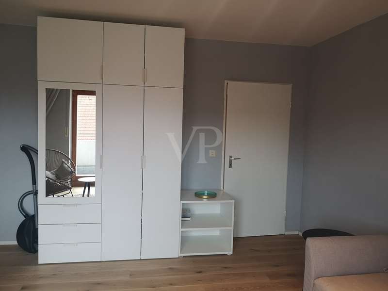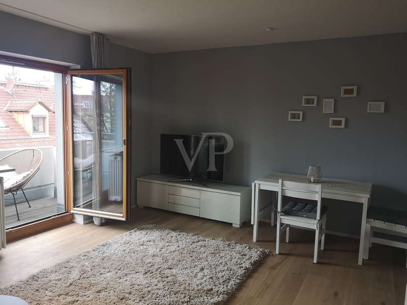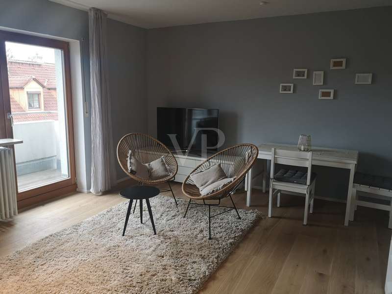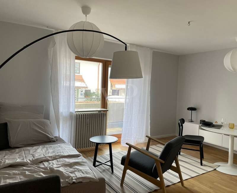 This stylishly furnished and high-quality renovated 1-room apartment is located on the second floor of a well-kept apartment building in a quiet yet central location in Ismaning. On around 36 m², it combines modern design, high-quality materials and a pleasant living atmosphere. Moving in is possible from December 1, 2025. Upon entering the apartment, a small, inviting hallway opens up, leading into the elegantly designed bathroom and the light-flooded living and sleeping area. The bathroom was modernized during the renovation in 2021 and fitted with high-quality tiles and stylish fittings. The living and sleeping area forms the heart of the apartment. The balcony doors allow plenty of natural light into the room and create a bright, friendly atmosphere. The parquet flooring laid throughout emphasizes the high-quality character and creates a warm feeling of living. The modern furnishings, which are coordinated with the floor plan, give the apartment a stylish, timeless character. The living room leads out onto the balcony with a view of the greenery and into the separate, bright kitchen with window and high-quality surfaces. As part of the renovation, all the walls and ceilings were also replastered and repainted, giving the apartment a fresh appearance. The apartment is rented fully furnished. A garage is also available. The monthly rent is made up as follows: €900 basic rent + €50 for the garage + €150 service charges. The rental contract is limited to two years. Ismaning impresses with its excellent infrastructure, proximity to Munich and wide range of leisure and shopping facilities. Ideal for singles or commuters looking for modern living in a quiet and sought-after location.