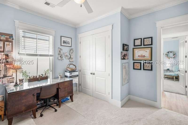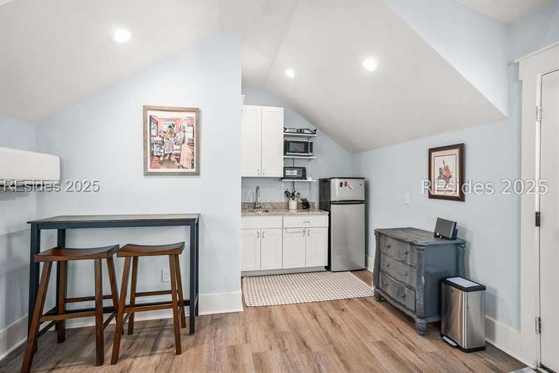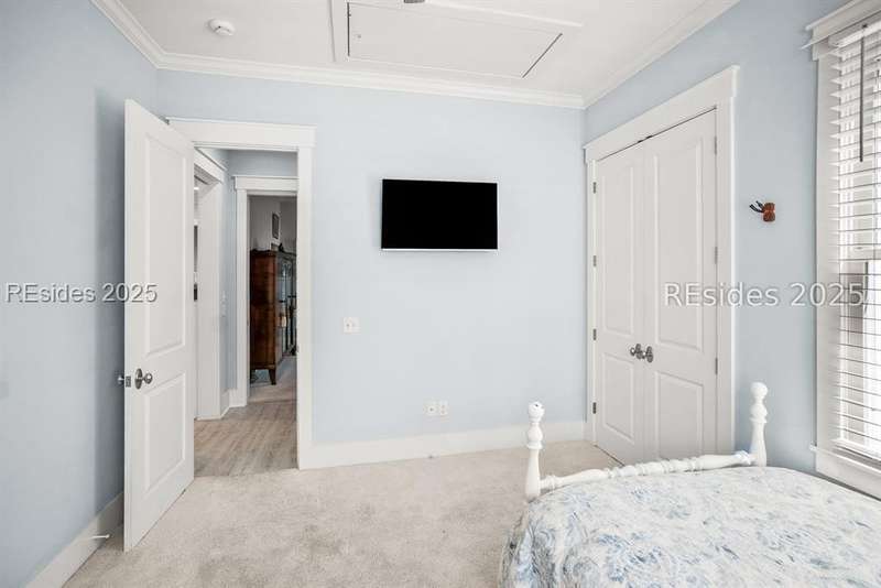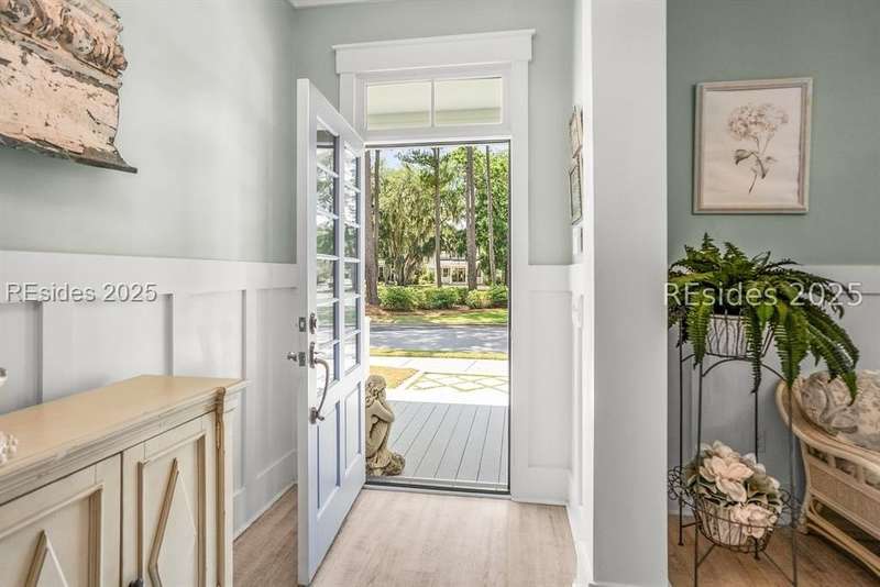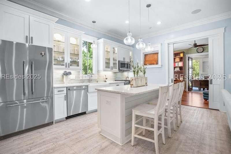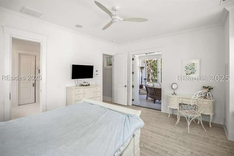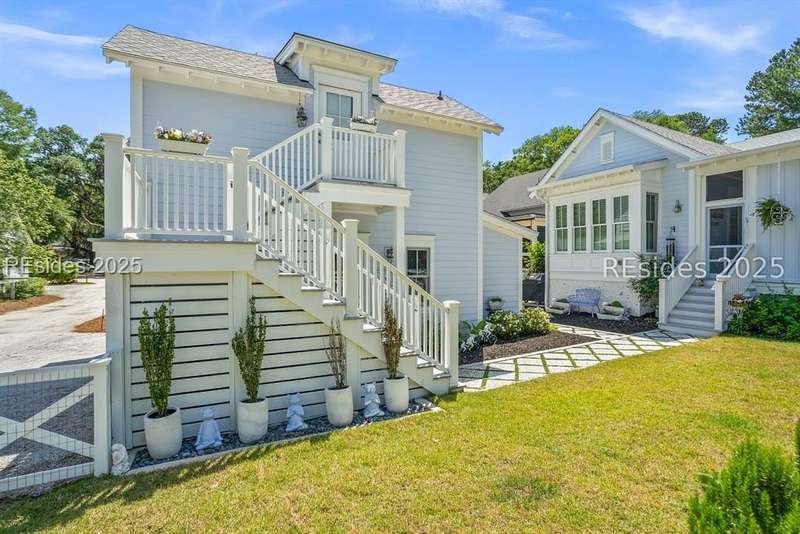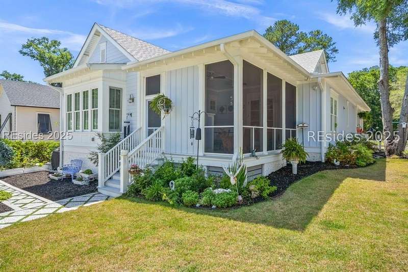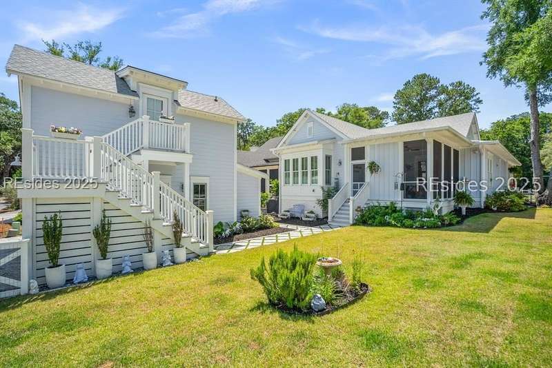 The ''Sea Glass House'', built 2021 on enviable corner lot overlooking Park, pond & ancient oaks. Light-filled main residence 2,300 fully customized sf. 10' ceilings, pocket doors, hand-crafted trim. 3 oversize BR/baths, show-stopper library, large walk-in pantry w/ exterior door for easy unloading. Primary suite is a tranquil haven w/oversized bay window overlooking pond, ensuite bath w/ zero entry shower/soaking tub & French doors open to screened-in porch w/ FP. Charming 1 BR/1-bath/kitchenette guest suite above detached garage. Beautifully maintained grounds, fenced yard, whole-house generator, outdoor shower. Gym/pool quick walk. Easy access to downtown Beaufort (Southern Living's #1 Best small town) & Hunting Island. More beautiful than fotos, priced to Sell - Prepare for a WOW