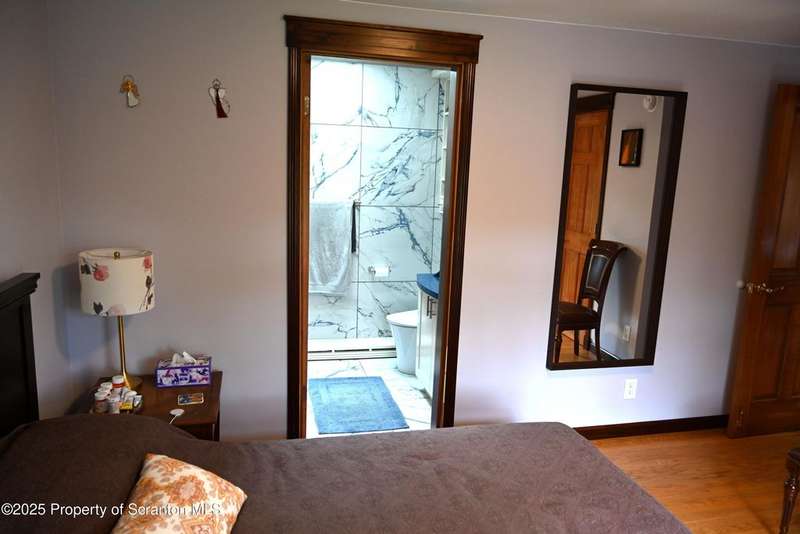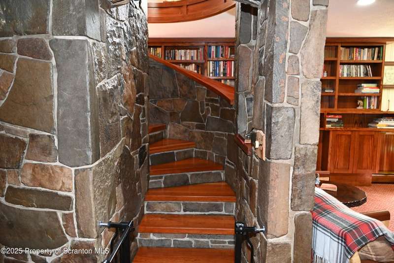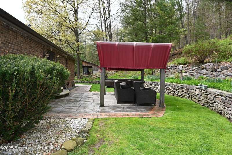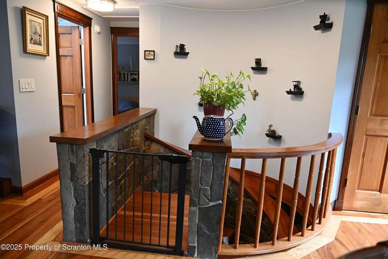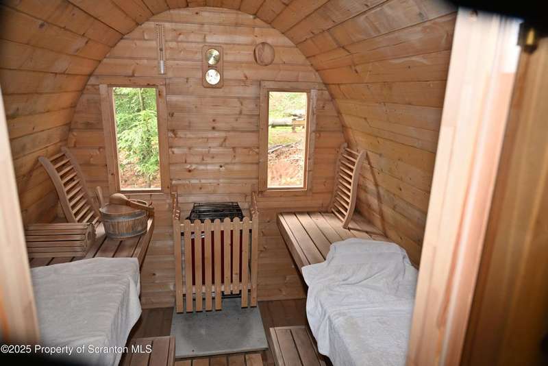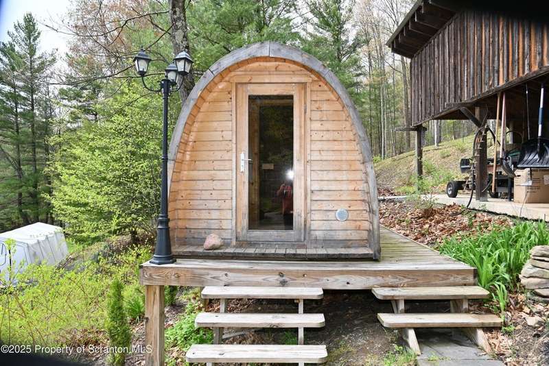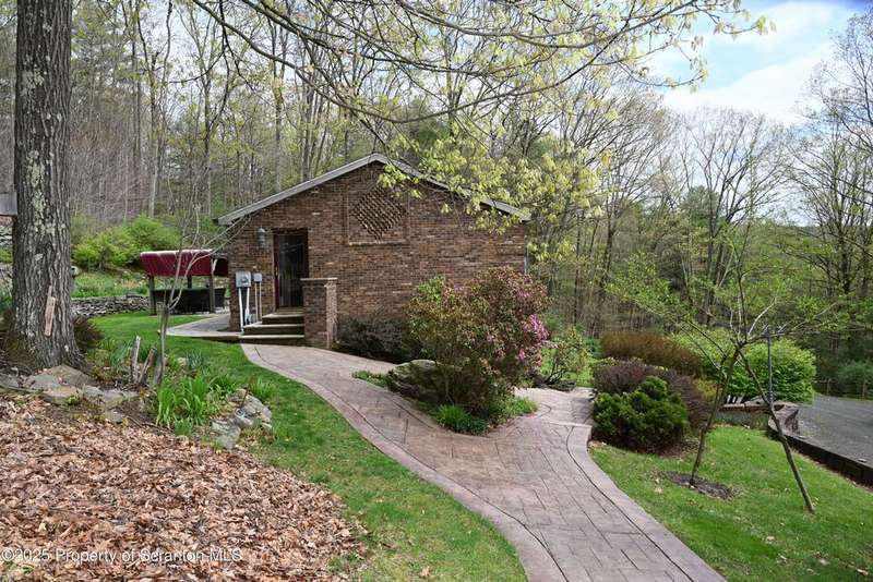 Nestled on over 9 acres of mostly wooded land, this exceptional property offers a rare blend of privacy, quality craftsmanship, and modern comfort. From the moment you arrive, you'll be captivated by the professionally built Brick with Stone House, featuring a welcoming stamped concrete sidewalks & patio perfect for outdoor relaxation and entertaining. Step inside to discover a home meticulously maintained and thoughtfully updated. The heart of the home boasts a custom-made kitchen, featuring beautiful red oak cabinetry, complemented by gleaming cherry and red oak floors that flow throughout the main living areas. Enjoy the luxury of 3 bedrooms & 2 1/2 brand new bathrooms & a custom laundry room with a convenient pocket door. The inviting peaceful family room and Library located in the finished lower level has new carpet that offers a cozy retreat with a fireplace as its centerpiece. A gorgeous circular stone staircase adds a touch of elegance as it gracefully leads you to the main floor. Beyond the main residence, discover a haven of outdoor amenities. Relax and rejuvenate in the outdoor sauna, cultivate your green thumb in the greenhouse, or gather around the fire pit for memorable evenings under the stars. The property features added fruit trees and thoughtful landscaping, enhancing its natural beauty. For the hobbyist or those needing extra space, there's a two-car detached heated garage currently a Wood working shop with the potential for a mother-in-law suite above, offering flexible living arrangements. Peace of mind comes standard with a whole house generator, updated electrical, septic, and a brand new roof and gutters.Heating is efficient and cost-effective with an outdoor wood furnace or hot water baseboard. Property has quality custom woodwork throughout, a testament to its enduring construction. Located just minutes away from I-81, This remarkable property has been refurbished and is move in ready with $100,000+ of renovations, OGM do not convey