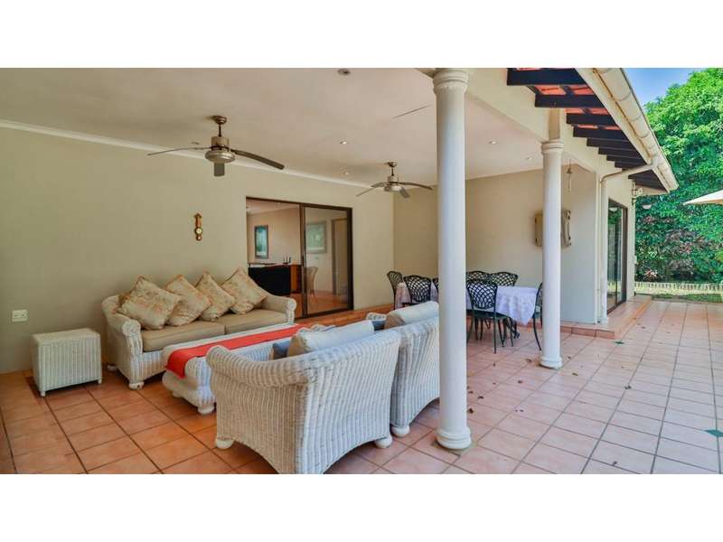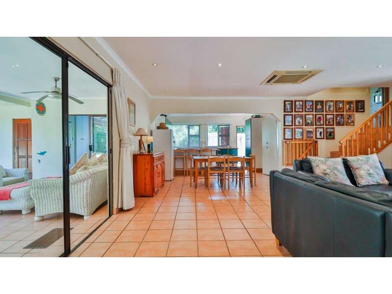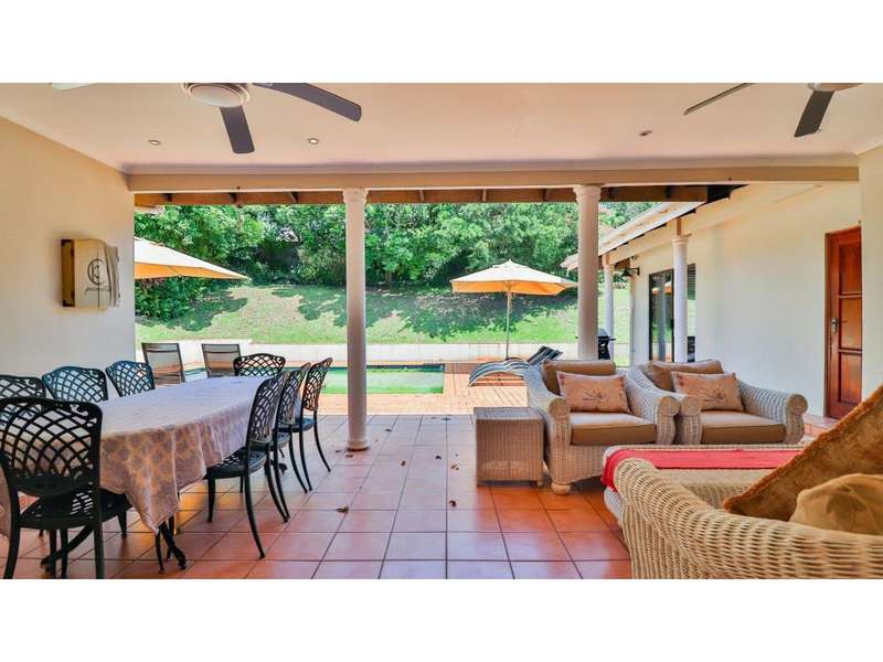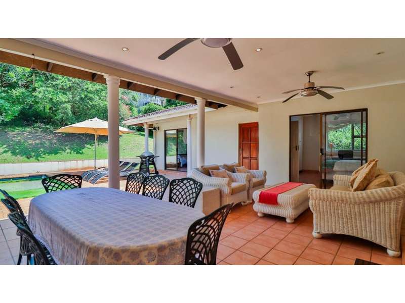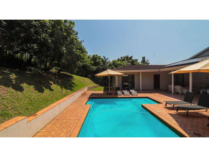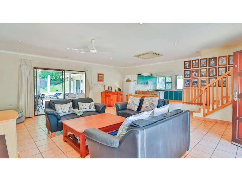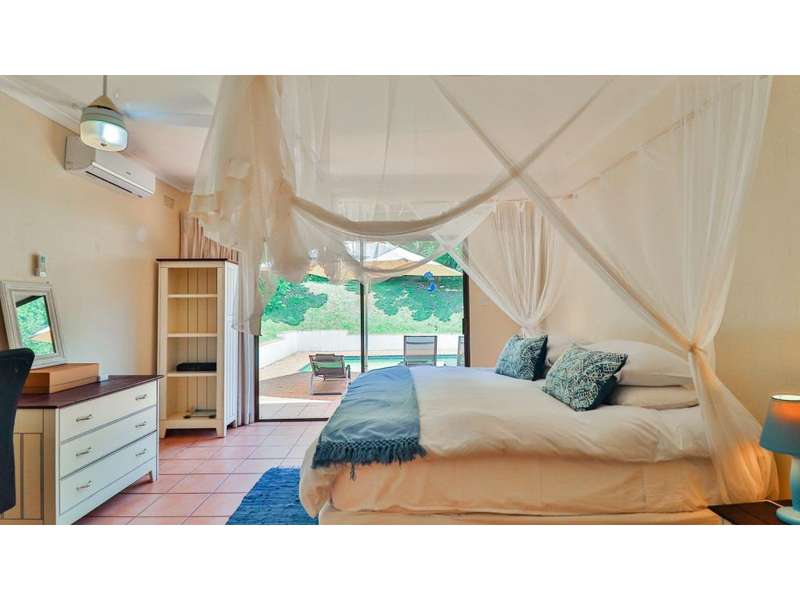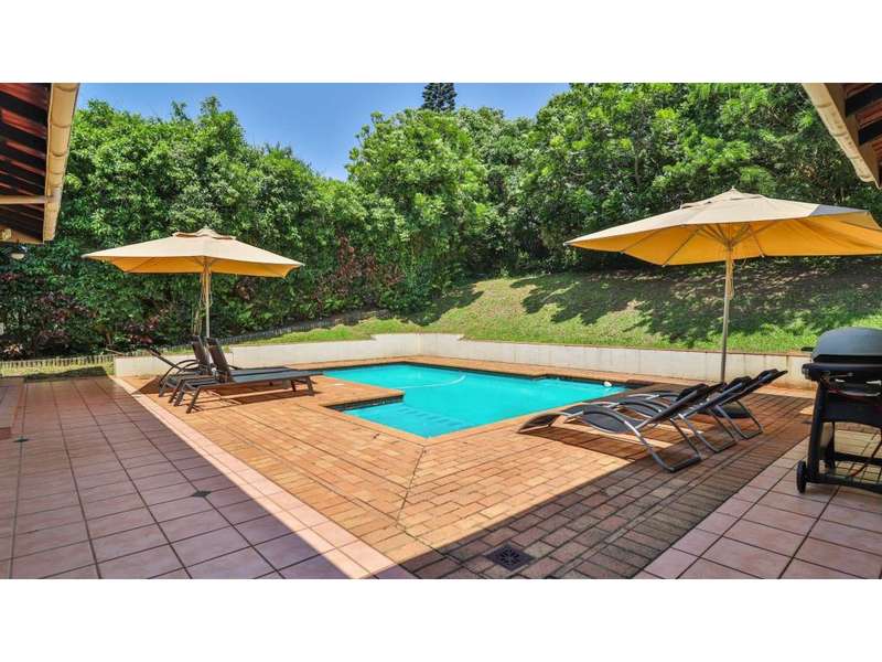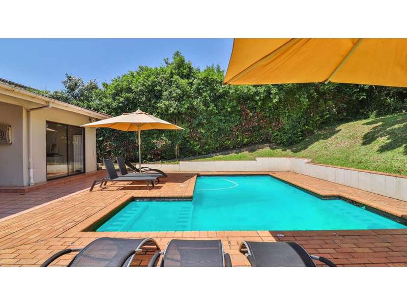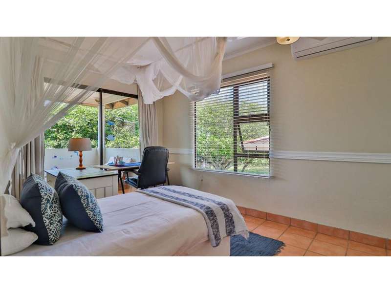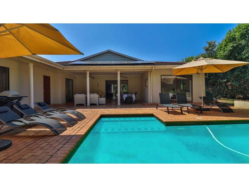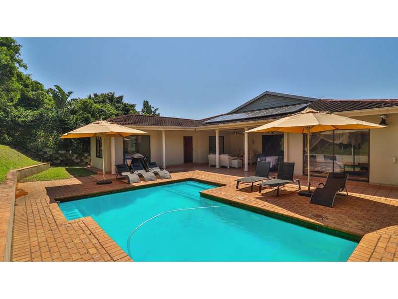 Exclusive to Chas Everitt - This easy-living home, ideally located, just 200 meters from pristine beaches and captivating rock pools, offers an incredible sense of flow and unparalleled privacy. The majority of the home is thoughtfully designed on a single level, featuring a spacious and inviting open-plan living area that harmoniously combines a lounge, dining area, and a generously sized kitchen with a convenient scullery. Up a short flight of stairs, the master suite awaits, boasting a roomy bedroom, a full bathroom, and an adjoining space perfect for a tranquil office or additional bedroom. This private sanctuary opens onto a protected balcony, offering partial glimpses of the ocean beyond the lush vegetation. The main living area leads to a generous en-suite bedroom with direct access to the inviting pool area. Two additional bedrooms, both with sliding doors that flow out to the pool area, share a well-appointed bathroom. The property also includes a private and neat flatlet, complete with a living area, bedroom, and en-suite shower, basin, and toilet. To ensure year-round comfort, all bedrooms are air-conditioned, while the main living area features ducted aircon and a ceiling fan. The home is further equipped with a solar and inverter system, a comprehensive security system, including a full alarm system, CCTV, electric fencing, automated gate, and garages. This exceptional property offers the perfect blend of modern convenience and coastal tranquility. There is the option of purchasing the cleared and level vacant stand adjoining to this property. The stand is fully fenced with Clear-Vu fencing with an electric fence.