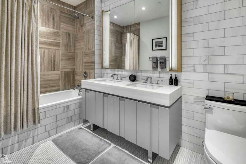 The dining island features a stunning Caesarstone countertop and waterfall edge detail. Sophisticated matte white oak millwork is complemented with bright white lacquer cabinets. A suite of stainless steel Bosch appliances and LED lighting completes the package. The bath is an artistic sanctuary with custom dual-sink lacquer cabinetry and distinctive Zebra-Mink marble wall tiles and accents.