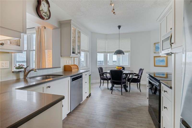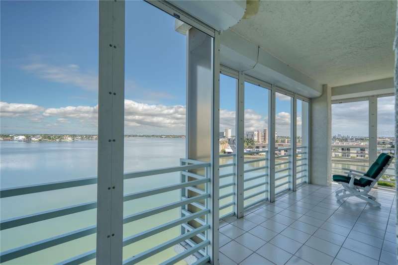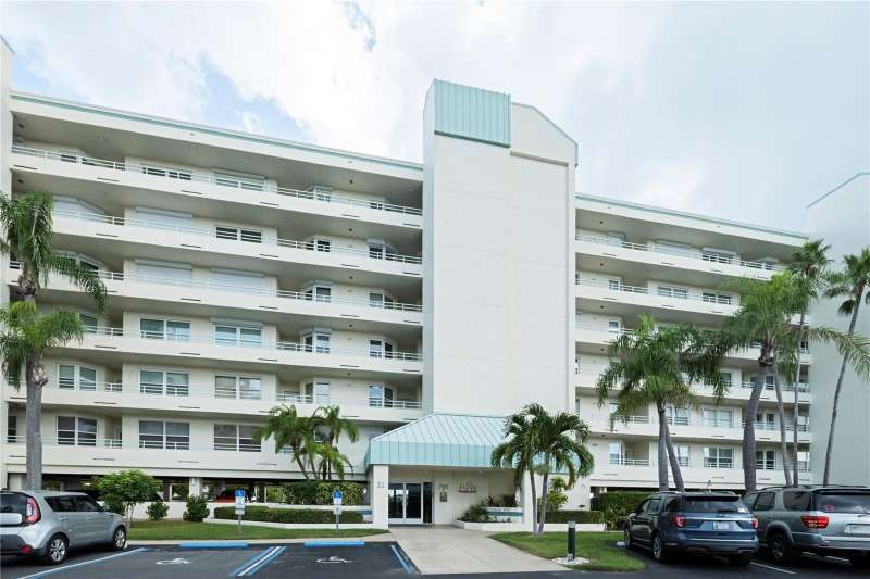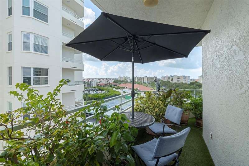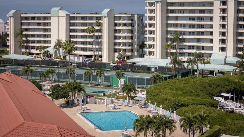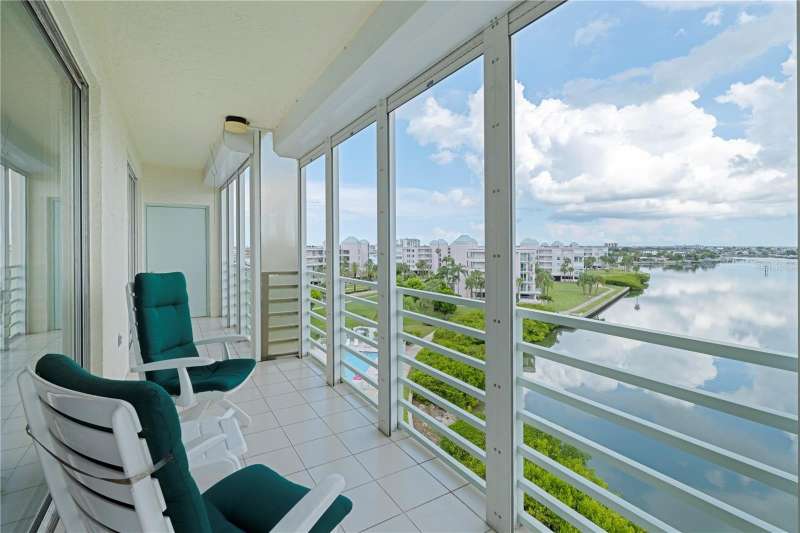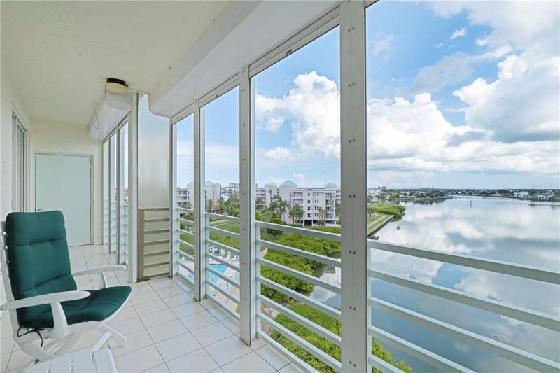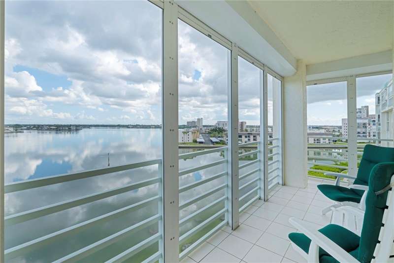 This fifth floor luxury condo has breathtaking views of Boca Ciega Bay. It’s located on a 24 hr Guard Gated island community developed by award winning JMC Communities. This desirable corner unit comes with two balconies, the living room with unobstructed wide water views and the kitchen with dining area overlooking the Marina and clubhouse pool. This is a two bedroom, two bath unit with a den/office/bonus room. All rooms were completely remodeled in 2018. The kitchen has solid wood shaker cabinets with quartz countertops, roll out drawers (soft close) and stainless steel appliances. The main living area is an open floor plan, 9' ceilings throughout and inside laundry. The remodeled primary bathroom features newer stone ceramic tile flooring, a frameless glass shower door, and a newer vanity with granite countertop. The walk in closet is customed designed with glass door enclosed wardrobes. The guest bathroom has been totally updated with newer shower tile, newer vanity with granite counter top, and a new frameless glass shower door. Other improvements include a new HVAC system installed in 2024, a new water heater in 2024, and Hurricane impact windows. There are Hurricane shutters on all of the openings for added protection and peace of mind. The building passed the milestone inspection. The roof on the building was replaced in 2024. The reserved parking space is under the building #119 (is the coveted space by the lobby door). Harbourside is a guard gated (24 hour) complex with many amenities including pool, his and hers fitness centers, shuffleboard, pickleball, tennis, hot tub, electric car charging stations, car wash stations, recently renovated clubhouse with many social events throughout the year, library, card room, billiards room, arts and crafts room, wood working area, yoga and water exercise classes. There is a 1.5 mile walkway around the complex along the waterfront which is lit up for nightly walks. Come see what resort living in Florida is all about. You can live your tropical, island dream here in Harbourside.
