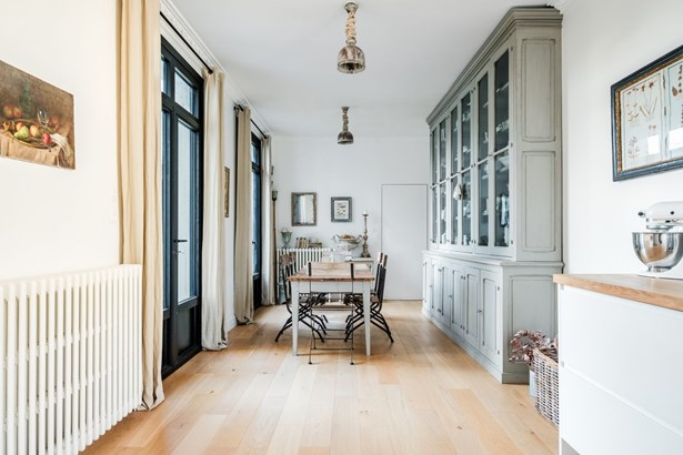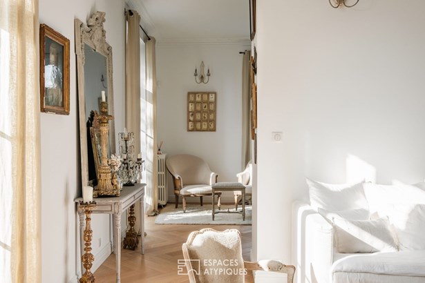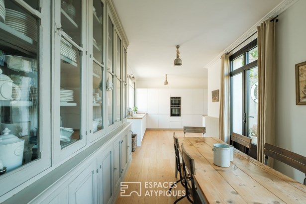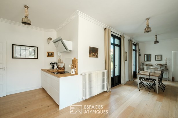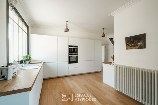 At the back, the hallway distributes the kitchen and the living room. The rooms are bright with pleasant volumes and a view of the garden. The family kitchen with premium services and light shades will delight fine gourmets.