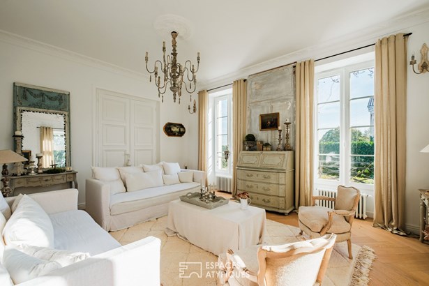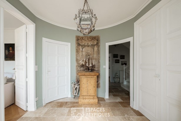 The old elements, such as the fireplaces, the parquet floors and the moldings, have been preserved, thus contributing to the charm and character of the residence. After a flight of steps, the main entrance opens onto a large space with a sublime travertine floor which distributes on one side, an office and on the other a living room.