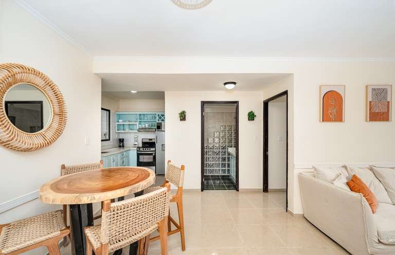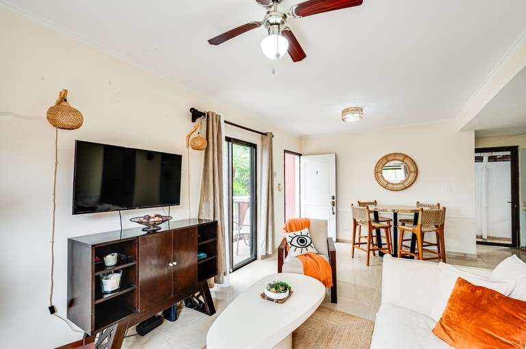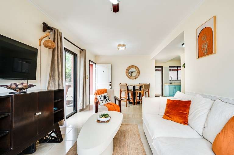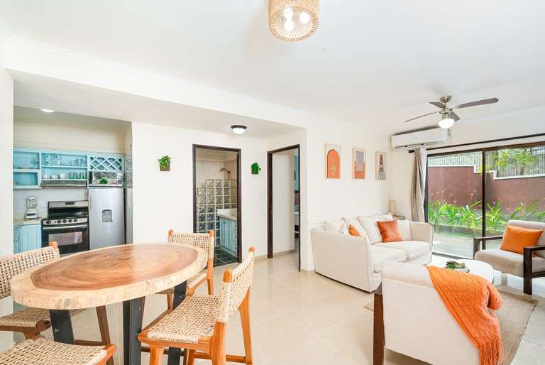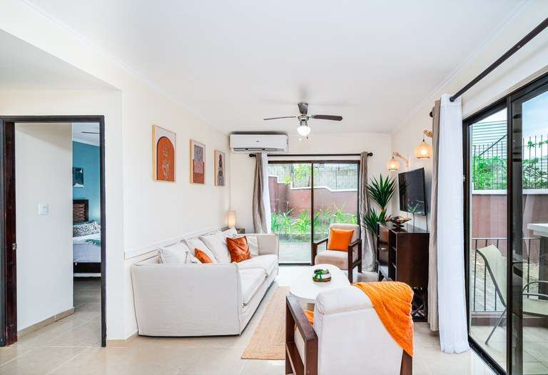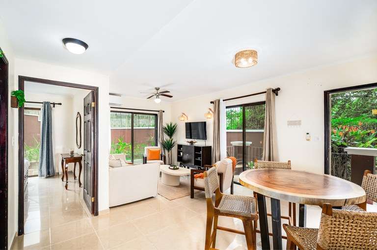 Located on the ground floor of the secure and gated Balcones del Pacifico community, this home combines convenience, comfort, and privacy. Step inside to find a bright, open-concept layout featuring a welcoming living area and a cozy kitchen that connects effortlessly to the lush outdoor terrace. Surrounded by tropical gardens, the spacious terrace offers excellent privacy and is ideal for morning coffee, afternoon reading, or relaxing evening cocktails. It also provides direct access to the beautifully maintained community pool, creating a seamless indoor-outdoor lifestyle.
