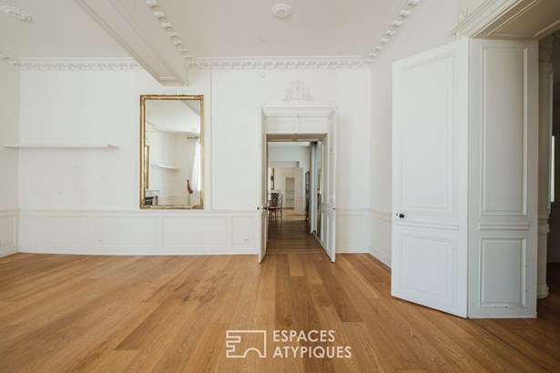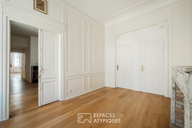 Within a remarkable building, whose architecture leaves no one indifferent, opens a 150 sqm space that combines generous volumes and noble materials. From the entrance, the tone is set: more than 3 meters of ceiling height, a vast entrance hall and that rare atmosphere that only exceptional places can offer.