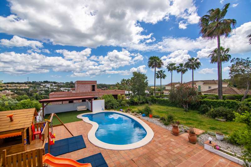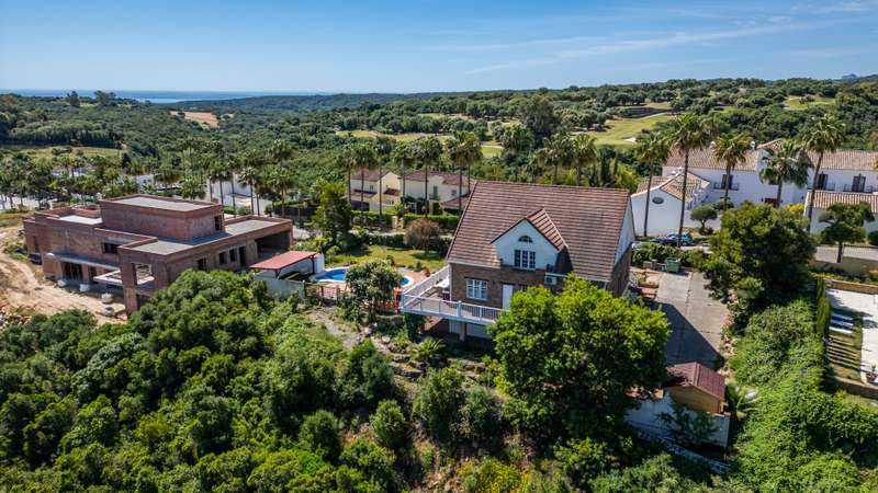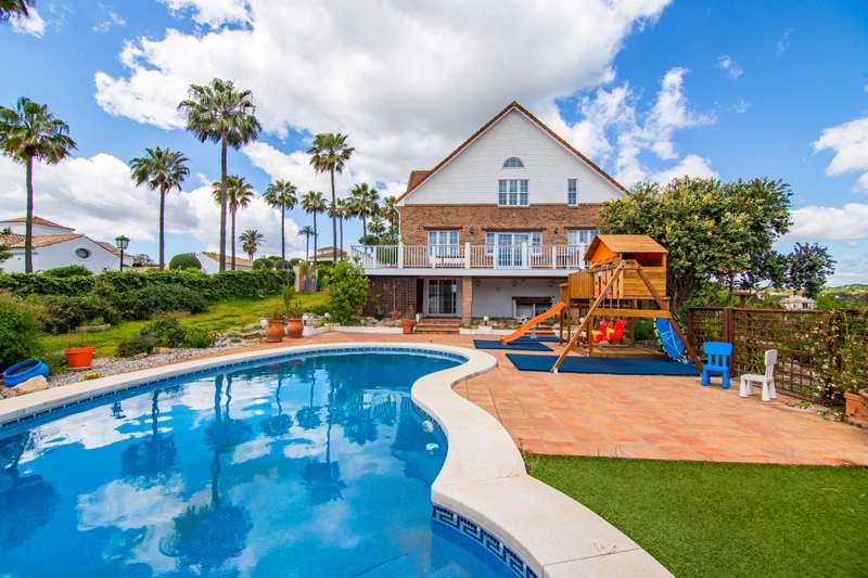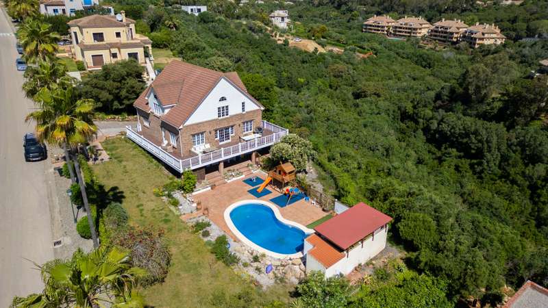 This independent and welcoming villa is located in the exclusive Zone F of Sotogrande Alto. With a built area of 294.42m² and a plot of 1,780m², this property offers all the amenities to enjoy a sophisticated lifestyle. The villa stands out for its design and unique architecture in the purest Alpine style. The wooden interior features impressive ceilings and an interior structure that creates a warm and inviting atmosphere. On the main floor, there are two bedrooms, one of them with a walk-in closet, a bright living room, a modern kitchen, and an open-plan dining area, perfect for entertaining family and friends. This floor opens onto a terrace-viewpoint where you can relax and enjoy the stunning panoramic views and the sea. The upper floor houses the master suite, which includes a private bathroom and a study area, ideal for working from home. On the lower floor of the villa, there is a guest bedroom, a laundry area, an additional kitchen, and a room that can be used as a gym or games room. There is also a private, enclosed garage with capacity for one vehicle, with additional private parking available outside the property as well. The exterior of the property is equally impressive. The villa features a private pool at the foot of a porch with a swing sofa, ideal for enjoying the Mediterranean climate. Next to the pool, there is a children's playground with padded flooring, perfect for children to play safely. From the villa, you can enjoy incredible panoramic views of the sea and Sotogrande. In addition, its privileged location places it close to renowned golf courses such as Valderrama, Almenara, or San Roque Club Golf and the International School, making it an ideal option for families. Security is a priority in this development, with 24-hour surveillance service. This villa offers luxury, comfort, and tranquility in a privileged location. Do not hesitate to contact us for more information and to schedule a visit.