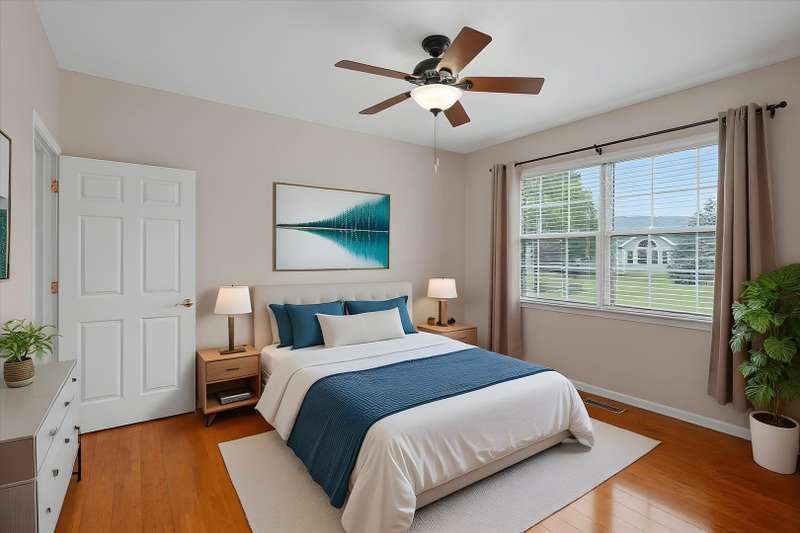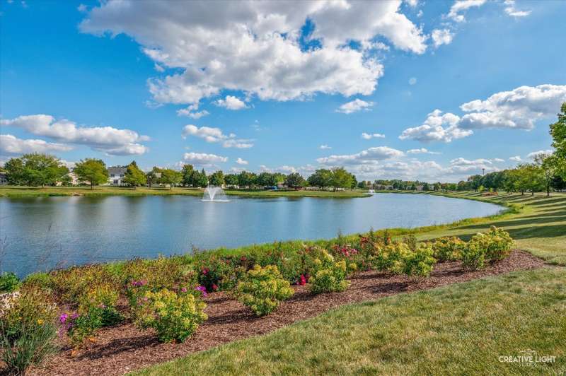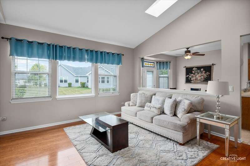 Welcome to this 2-bedroom, 2-bath ranch townhome in the sought-after 55+ community Carillon Lakes. Beautiful hardwood floors create a luxurious feel throughout the dining room, living room, and bedrooms. White trim and classic white 6-panel doors with brushed nickel lever handles add a fresh, modern touch throughout the home. The spacious living room features a vaulted ceiling, two skylights that fill the space with natural light, and views of open space. The open floor plan leads seamlessly into the kitchen with tile floors, stainless steel stove, dishwasher, refrigerator, microwave, an under-sink reverse osmosis system, and a cozy eating area with bay window. Step outside to enjoy the private patio with a privacy fence and peaceful views. The primary suite offers hardwood floors, a ceiling fan, walk-in closet, and a private bath with walk-in shower and grab bars. The second bedroom also features hardwood floors and a large bay window. This guarded, gated community offers resort-style living with a clubhouse, indoor and outdoor pools, fitness room, Pickle Ball, Bocce Ball, 3-hole golf course with putting green, ponds, fishing, and an auxiliary pool for visiting guests under 18. Major updates include: furnace & A/C (2019), water heater (2020), washer (2021), garage door opener (2022), reverse osmosis system (2022), roof (2024), and gutters (2024) garbage disposal (2025). Move-in ready and maintenance-free, this home combines comfort, convenience, and community.