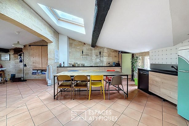 A small courtyard-side balcony offers a peaceful outdoor setting, sheltered from the hustle and bustle of the city. The immediate surroundings include local shops, neighborhood cafes, and heritage sites, creating a lively and authentic atmosphere. The building, built of Bordeaux stone, reflects the typical architecture of the city center.