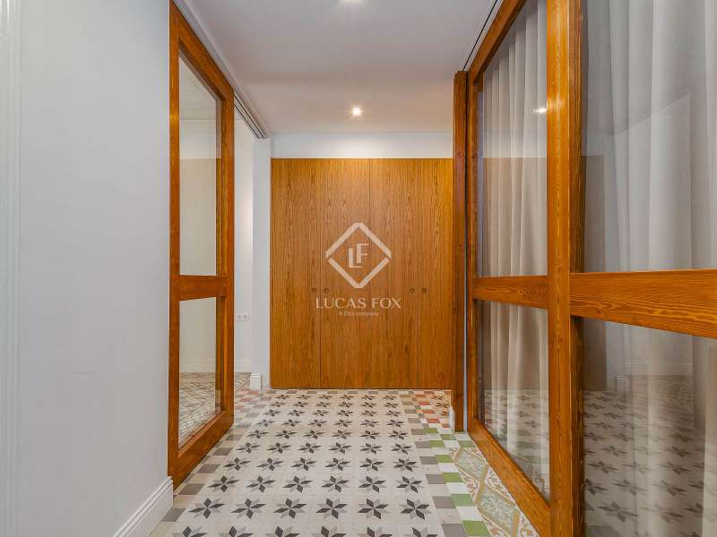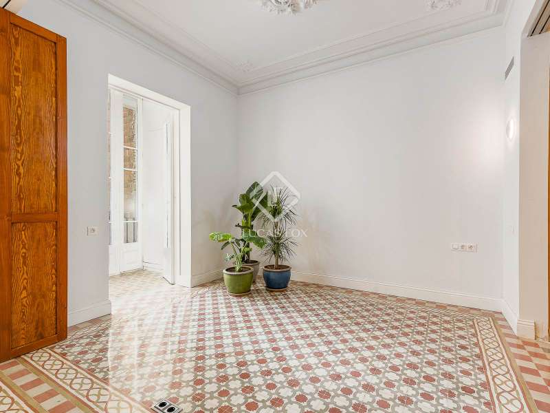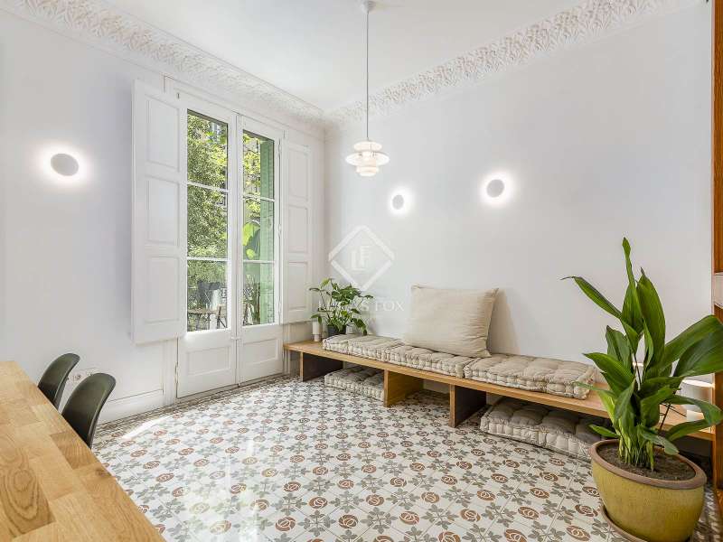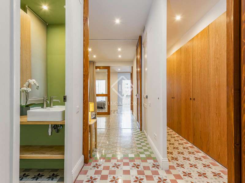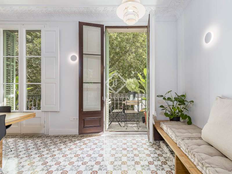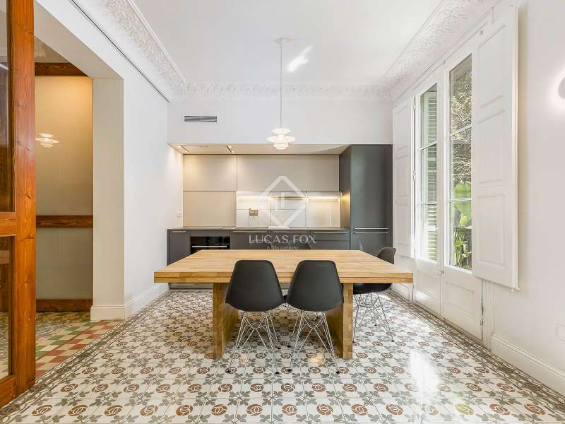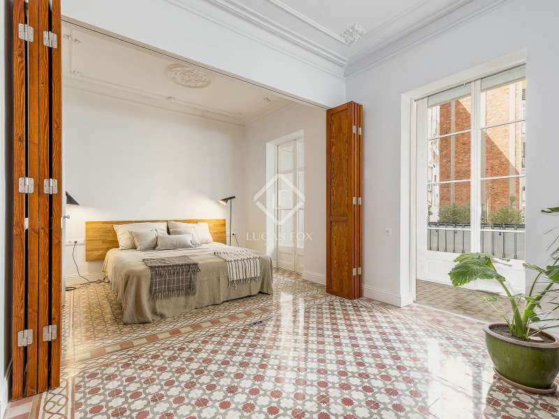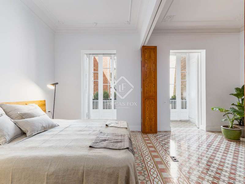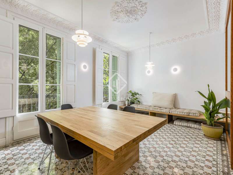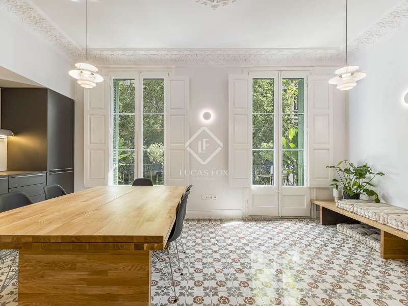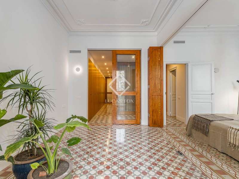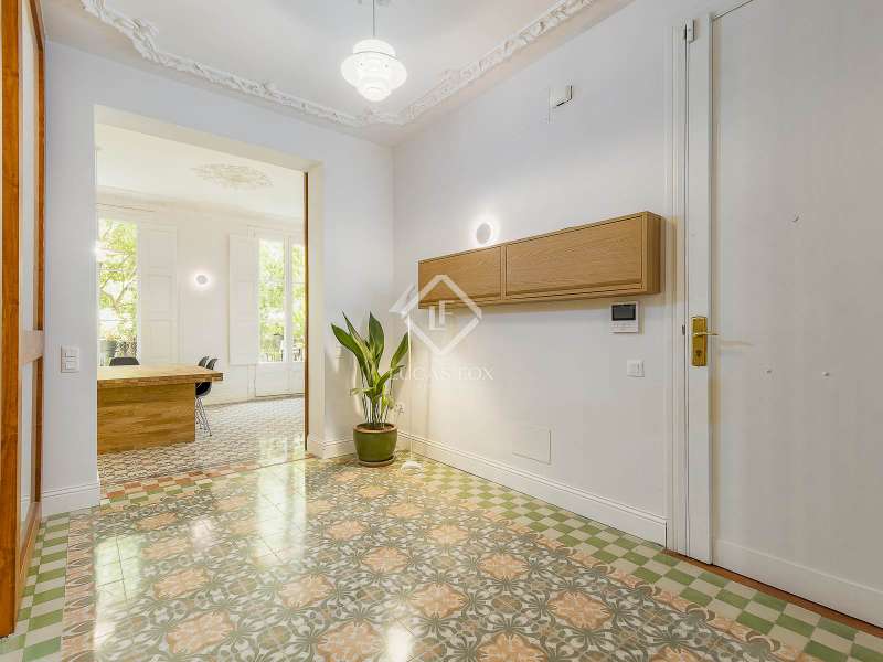 This newly renovated principal floor apartment, located in the highly desirable Eixample Left neighbourhood, offers an exceptional opportunity to experience the charm of one of Barcelona's most sought-after areas. Positioned at the intersection of Muntaner and Carrer Córcega, just steps from Avinguda Diagonal and the coveted Carrer Enric Granados, this property seamlessly combines historic elegance with modern living. Set in a classic stately building with a lift, the 108 m² apartment has been meticulously renovated, preserving its noble character while incorporating high-quality finishes. The apartment features stunning mosaic tile floors throughout, adding to its unique, timeless appeal. The classic wood details and modern touches create a refined yet comfortable atmosphere. The apartment consists of three bedrooms and two complete bathrooms, each designed with a contemporary flair. The main bedroom, facing the street, is particularly striking with its large sliding doors that allow natural light to flood the room and offer views of the lively city. This spacious room provides ample flexibility to create a walk-in wardrobe or workspace. The second double bedroom and smaller single bedroom overlook a serene inner courtyard, offering quiet, peaceful retreats. The smaller bedroom could easily be adapted as a study or transformed into a dressing room, complementing the main suite. The bright, open-plan living and dining area serves as the heart of the apartment, bathed in natural light from the gallery. The modern kitchen, featuring top-of-the-line appliances, flows effortlessly into the living space and includes a private laundry and pantry area for added convenience. The apartment also offers two balconies: the front-facing one enjoys views of the vibrant neighborhood, perfect for a morning coffee, while the rear balcony overlooks the inner courtyard, providing a peaceful spot for al fresco dining or relaxing. Additional features include ducted air conditioning and separate heating systems, ensuring comfort throughout the year. The apartment is surrounded by upscale restaurants, trendy cafés, boutique shops, and artisanal bakeries, and is well-connected, with multiple metro stations, bus lines, and the airport shuttle just a 5-minute walk away. Whether as a stylish, move-in-ready home or an investment in one of Barcelona’s most prestigious neighbourhoods, this apartment represents a prime opportunity. Please contact us for further details or to arrange a viewing.