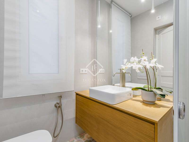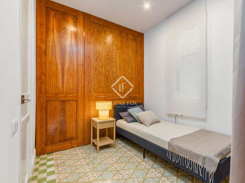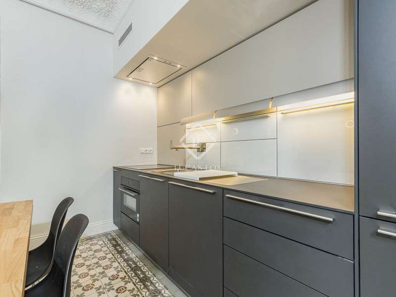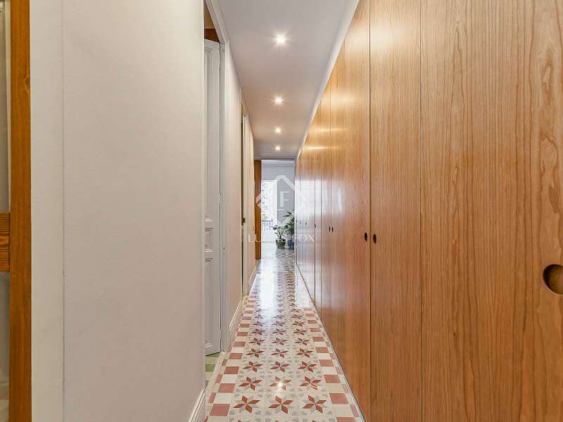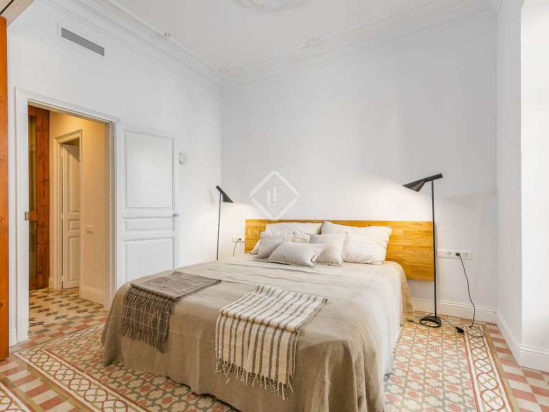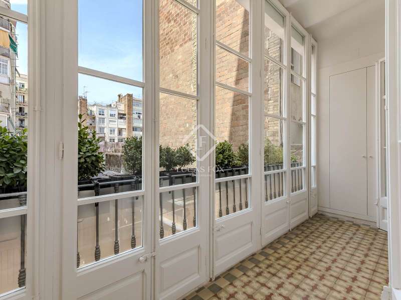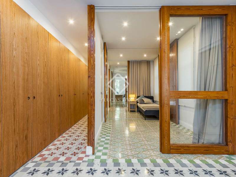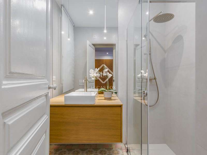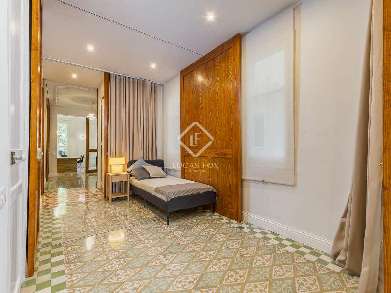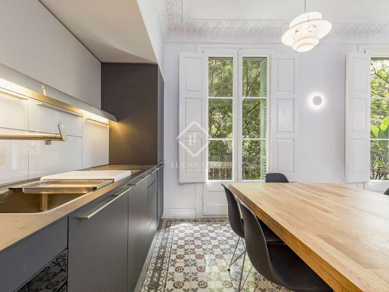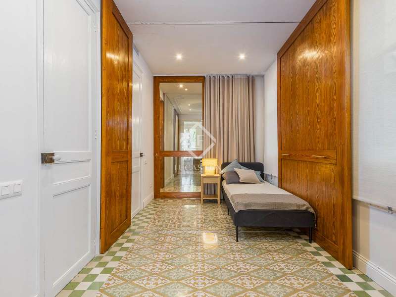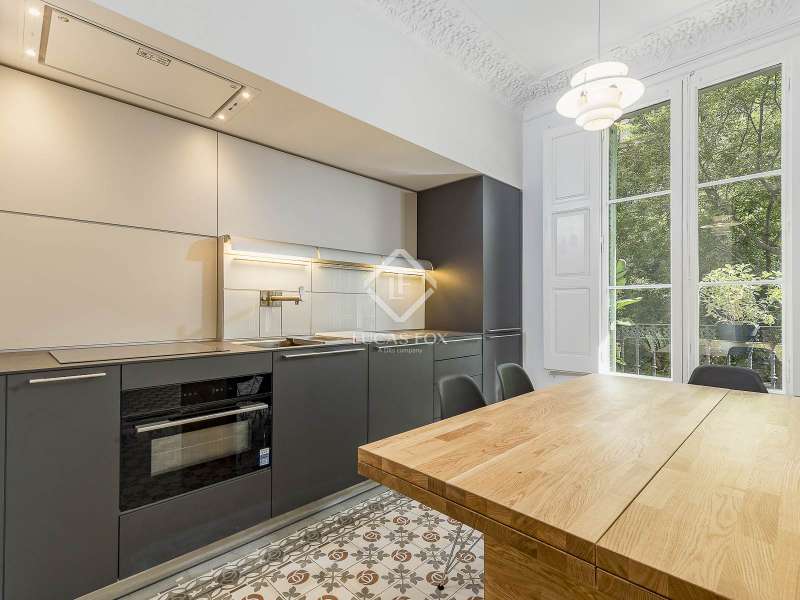 This newly renovated principal floor apartment, located in the highly desirable Eixample Left neighbourhood, offers an exceptional opportunity to experience the charm of one of Barcelona's most sought-after areas. Positioned at the intersection of Muntaner and Carrer Córcega, just steps from Avinguda Diagonal and the coveted Carrer Enric Granados, this property seamlessly combines historic elegance with modern living. Set in a classic stately building with a lift, the 108 m² apartment has been meticulously renovated, preserving its noble character while incorporating high-quality finishes. The apartment features stunning mosaic tile floors throughout, adding to its unique, timeless appeal. The classic wood details and modern touches create a refined yet comfortable atmosphere. The apartment consists of three bedrooms and two complete bathrooms, each designed with a contemporary flair. The main bedroom, facing the street, is particularly striking with its large sliding doors that allow natural light to flood the room and offer views of the lively city. This spacious room provides ample flexibility to create a walk-in wardrobe or workspace. The second double bedroom and smaller single bedroom overlook a serene inner courtyard, offering quiet, peaceful retreats. The smaller bedroom could easily be adapted as a study or transformed into a dressing room, complementing the main suite. The bright, open-plan living and dining area serves as the heart of the apartment, bathed in natural light from the gallery. The modern kitchen, featuring top-of-the-line appliances, flows effortlessly into the living space and includes a private laundry and pantry area for added convenience. The apartment also offers two balconies: the front-facing one enjoys views of the vibrant neighborhood, perfect for a morning coffee, while the rear balcony overlooks the inner courtyard, providing a peaceful spot for al fresco dining or relaxing. Additional features include ducted air conditioning and separate heating systems, ensuring comfort throughout the year. The apartment is surrounded by upscale restaurants, trendy cafés, boutique shops, and artisanal bakeries, and is well-connected, with multiple metro stations, bus lines, and the airport shuttle just a 5-minute walk away. Whether as a stylish, move-in-ready home or an investment in one of Barcelona’s most prestigious neighbourhoods, this apartment represents a prime opportunity. Please contact us for further details or to arrange a viewing.