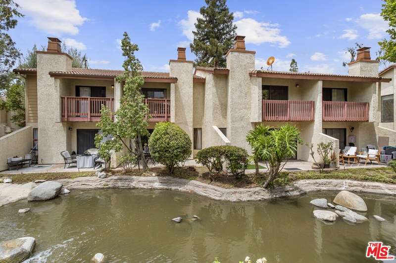 Move-in-ready townhome located in the highly desirable Warner Center of Woodland Hills. A peaceful retreat surrounded by lush landscaping, ponds, and mature trees, this home blends modern design with serene living. An updated kitchen with stainless steel appliances opens to the living room with a cozy fireplace and sliding doors leading to a private patio overlooking tranquil water features- the perfect spot to unwind to the sound of flowing water. A guest powder room adds convenience on the main level. Upstairs features two bedrooms and a full bathroom with a shower. The primary suite offers vaulted ceilings, a private balcony, and a separate vanity with sink for added comfort. Additional features include in-unit stackable laundry, central heat and air, and beautiful flooring throughout. Parking includes one shared garage space, an assigned spot in front of the unit, and ample guest parking. The Warner Woodlands community offers resort-style amenities with a pool, spa, sauna, two tennis courts, and tranquil walking paths surrounded by water features and greenery. A perfect blend of calm and convenience in the heart of Warner Center.