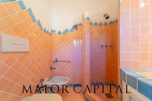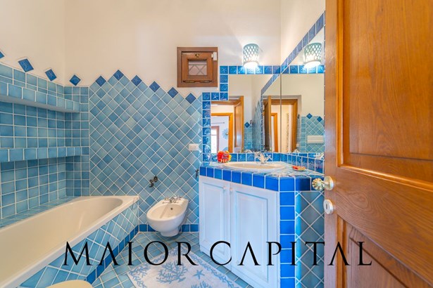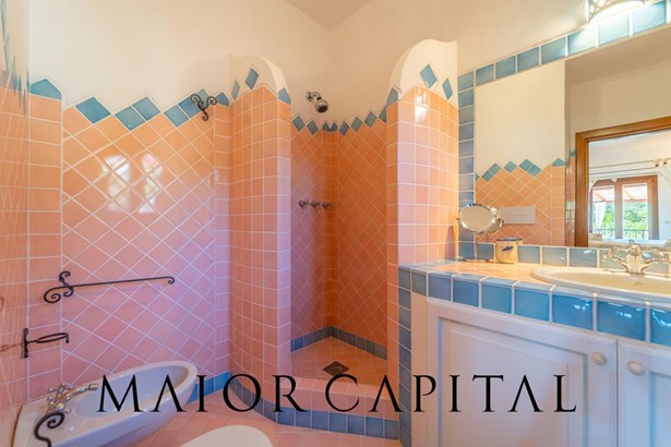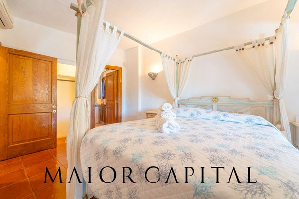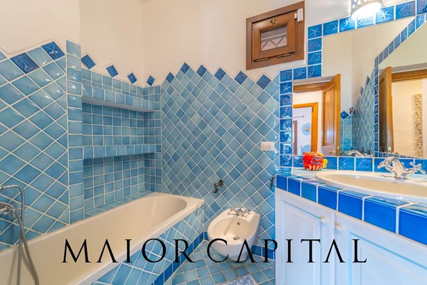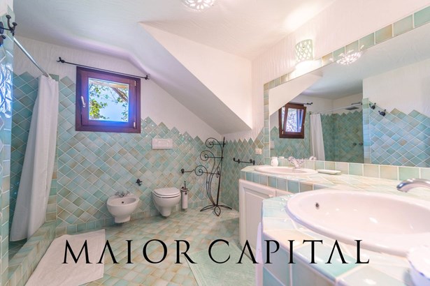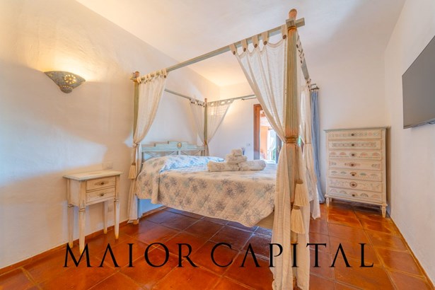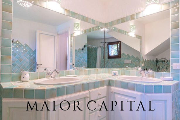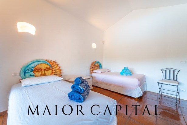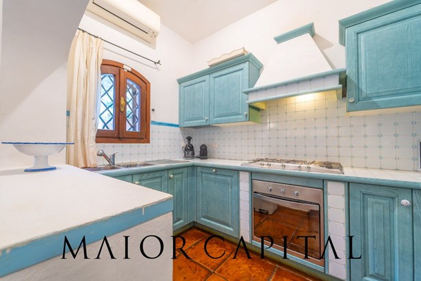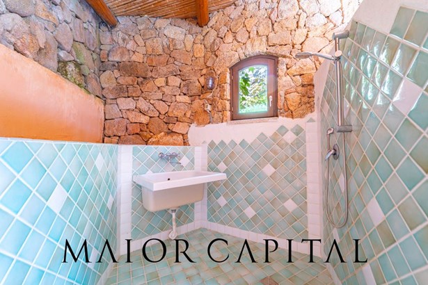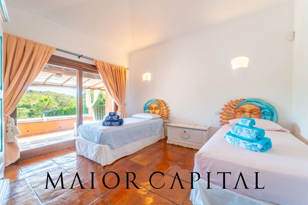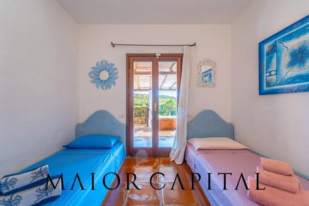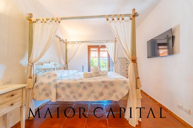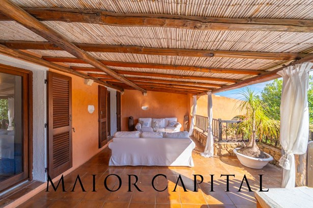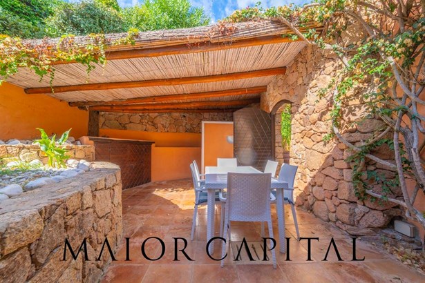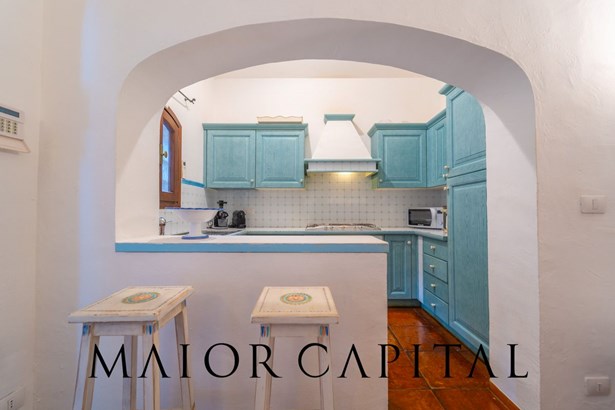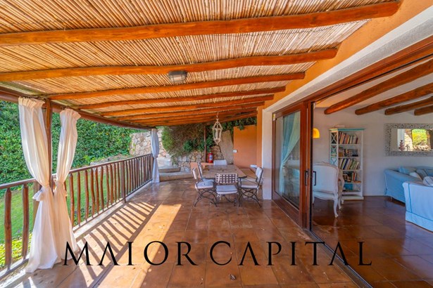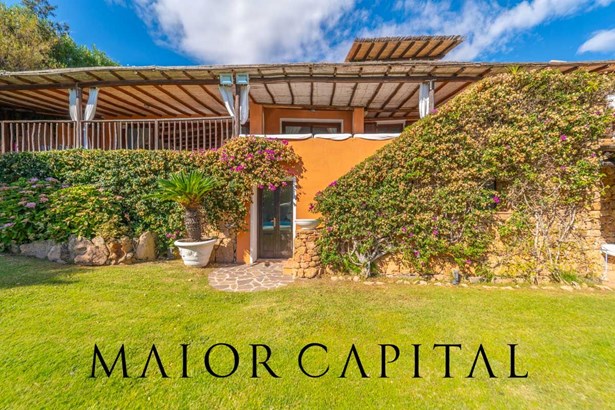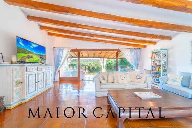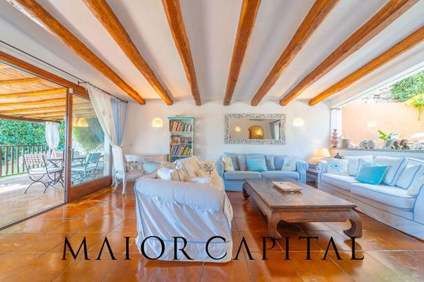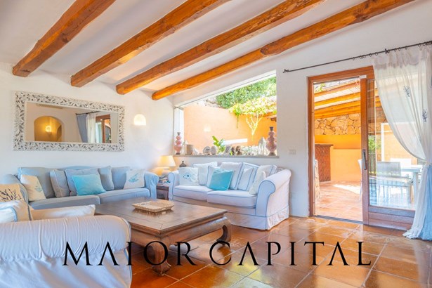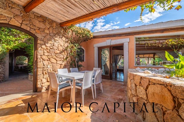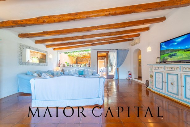 Spread over two levels, the villa combines elegance and Sardinian authenticity. The bright and welcoming rooms are characterised by the typical Costa Smeralda architectural style, with exposed beams and terracotta floors. The living room opens onto a large covered veranda with panoramic views of the surrounding greenery, perfect for relaxing in any season. The separate, fully equipped kitchen reflects the colours and materials of the local tradition. The sleeping area includes a master bedroom with en-suite bathroom, as well as two additional bedrooms and a shared bathroom, while the semi-basement, accessible from the outside, has two further double bedrooms and a bathroom, ideal for guests or staff.