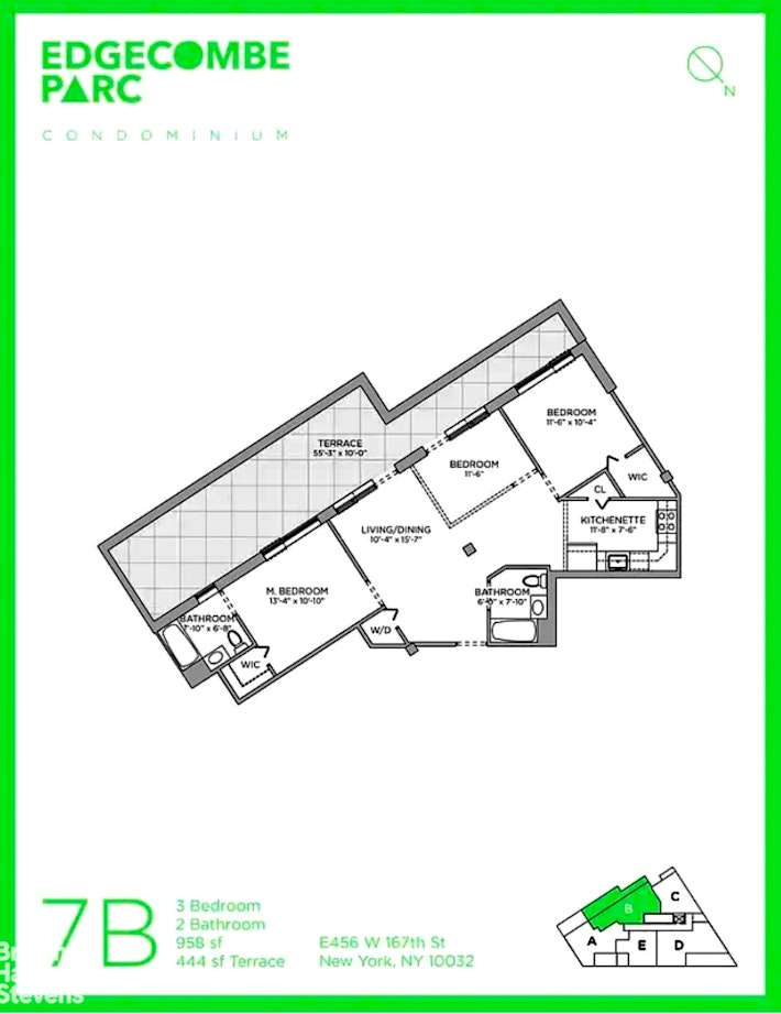 Enjoy This Top Floor 958 SF 2 Bedroom/2 Bath Doorman Condo with an extenive 444SF Terrace in Washington Heights. Unit 7B Offers Washer/Dryer, DW, Red Oak Hardwood Floors, GE Profile Series Stainless Steel Appliances. The Terraces extends the entire length of the aparemtns & is Perfect for Entertaining. Unobstructed Southern Views South to the of the Empire State Building. Edgecombe Parc is a Full Service Condominium Built in 2012. Included in Common Charges are a Gym that Opens to a Large Garden Patio, Roof Terrace & Bike Storage. Handicap Accessible & Conveniently located 3 Blocks from Columbia Presbyterian & the 168th Street Subway stop Servicing the A-C-1 trains. Approx.15 minutes from Columbus Circle Via A Train & 8 Block to the Entrance of the Cross Bronx Expressway for an Easy Weekend Out of the City.