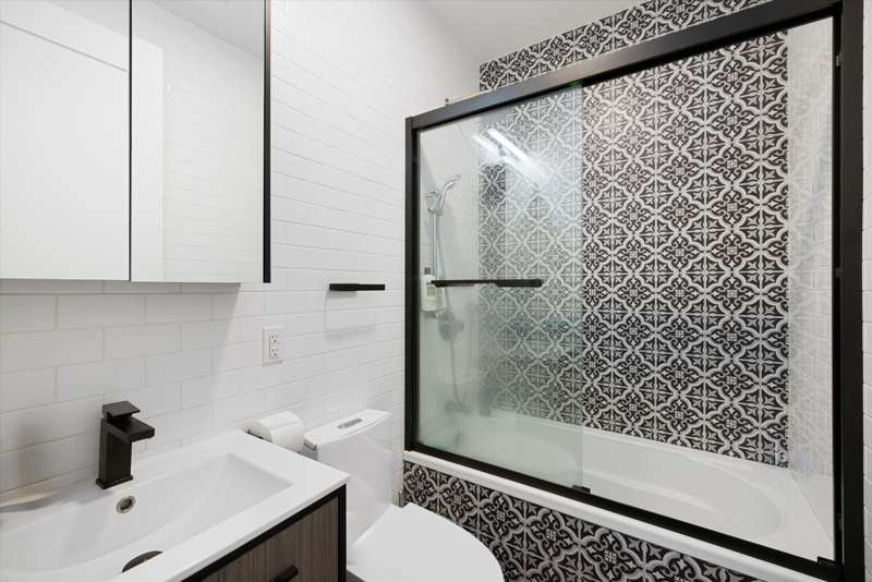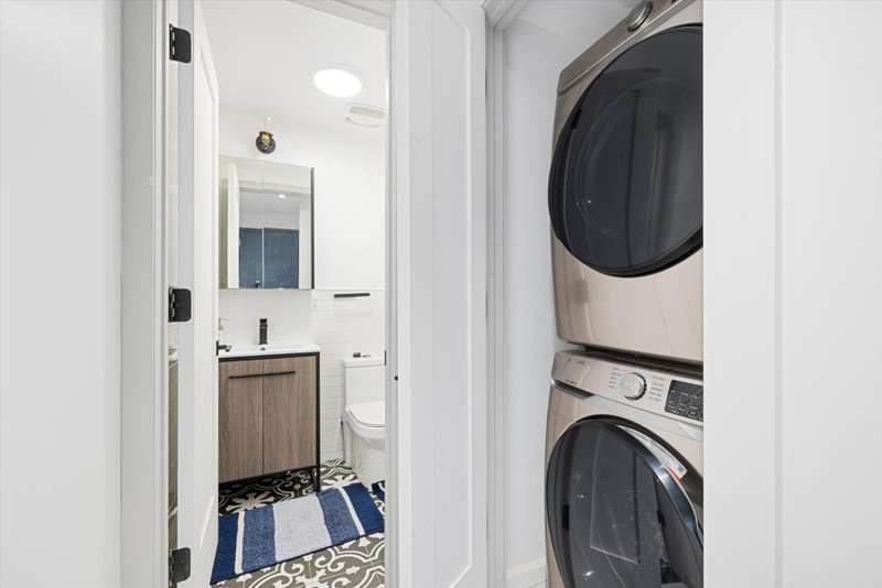This recently renovated unit is a flexible and unique space complete with hardwood flooring, in-unit laundry, and a versatile layout. The upper floor is comprised of a bright living space with two large North facing windows, an brick accent wall and an updated eat-in kitchen, appointed with stainless steel appliances, including a microwave and a dishwasher. The full bathroom is completely modern with sleek finishes alongside a luxurious soaking tub.