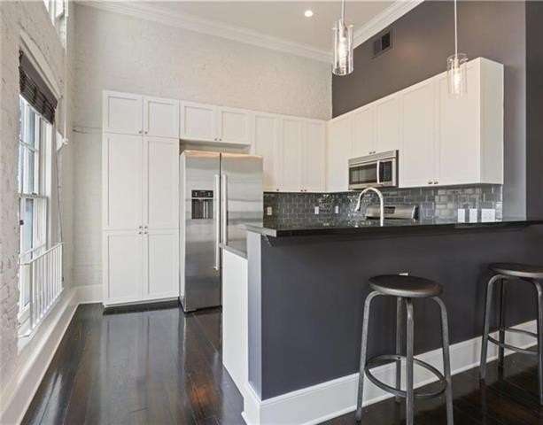 Gorgeous French Quarter 1 BR, 1.5 bath penthouse condo in a mint condition building that was completely renovated in 2017 is now available for lease! Tenant's choice: furnished or unfurnished! Great location across Decatur Street from House of Blues and blocks to Jackson Square and all the best restaurants and entertainment. Professionally designed unit has high ceilings and a wall of windows w/original transoms above to allow light to flood this beautiful, bright and open space. Original hardwood floors, custom cabinetry, eat in kitchen w/Bosch appliances, gas range and stone countertops. Large bedroom w/custom closets. Marble primary bath with rain shower, half bath for guests, and in unit Bosch washer & dryer. Video monitored security building. Small-medium pets considered on case by case basis w/extra security deposit. Water, sewer & garbage costs included in monthly rent. Please see floor plan for room dimensions.