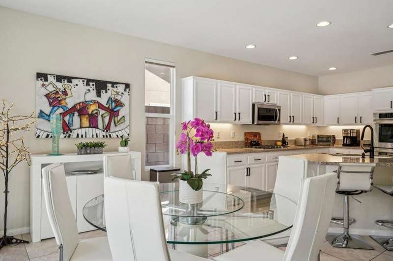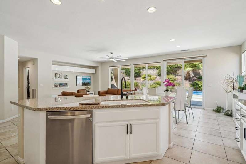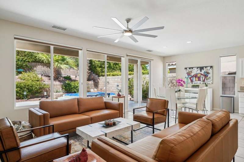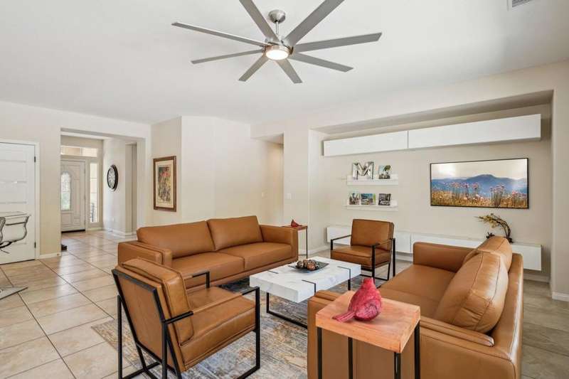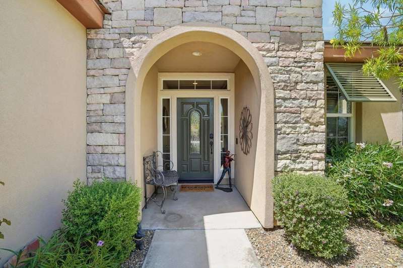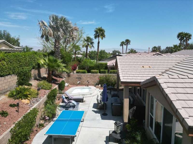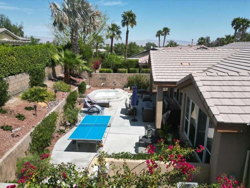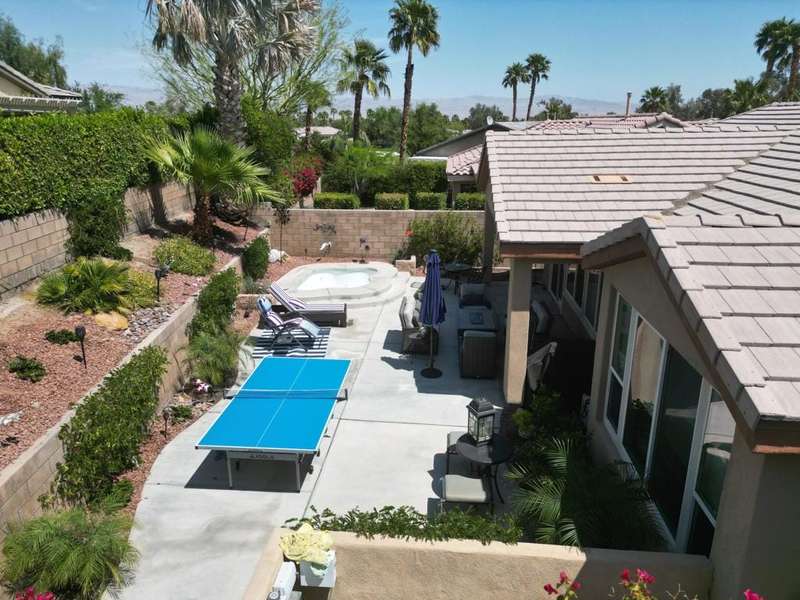 Welcome to the coveted Trilogy La Quinta--an exclusive 55+ resort-style enclave cradled by breathtaking mountain vistas! This highly sought-after Monterey plan with charming Tuscan facade offers 2 bedrooms, 2 baths, a versatile den/office (easily a 3rd bedroom with stylish barn doors), and 1,693 sq ft of open-concept elegance. Bask in the natural light of the great room, featuring custom window treatments, recessed lighting, tile flooring, and a sleek media niche. The entertainer's kitchen dazzles with stainless steel appliances, slab countertops, gas cooktop, double built-in ovens, microwave, a generous prep island with bar seating, and a walk-in pantry. Guests will appreciate the comfort, and privacy afforded them, and the primary suite is a serene escape with plank flooring, a bay window, and spa-like en suite complete with dual vanities, expansive shower, and walk-in closet. Enjoy a full laundry room with deep sink and ample cabinetry. Step outside to your private oasis with covered patio, professional landscaping, retaining wall, and an oversized concrete deck ready for gatherings under the stars. Just a quick 5-minute golf cart cruise to the Santa Rosa Clubhouse and all the resort amenities it offers--this home is desert living at its finest!