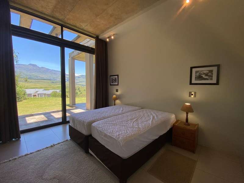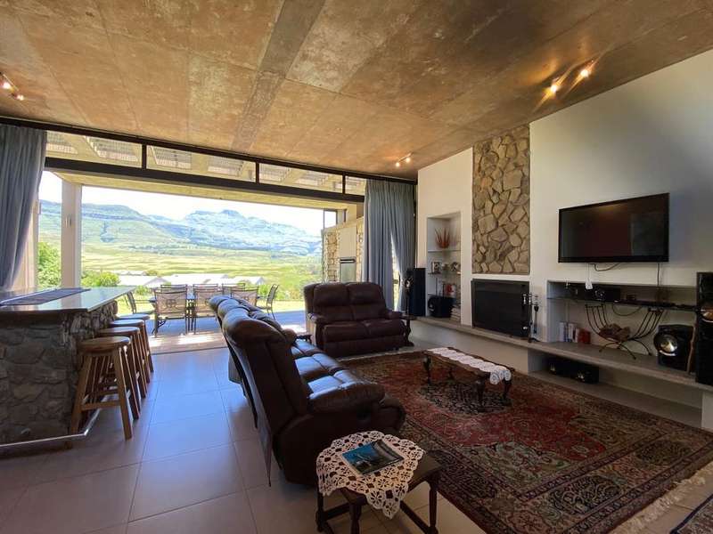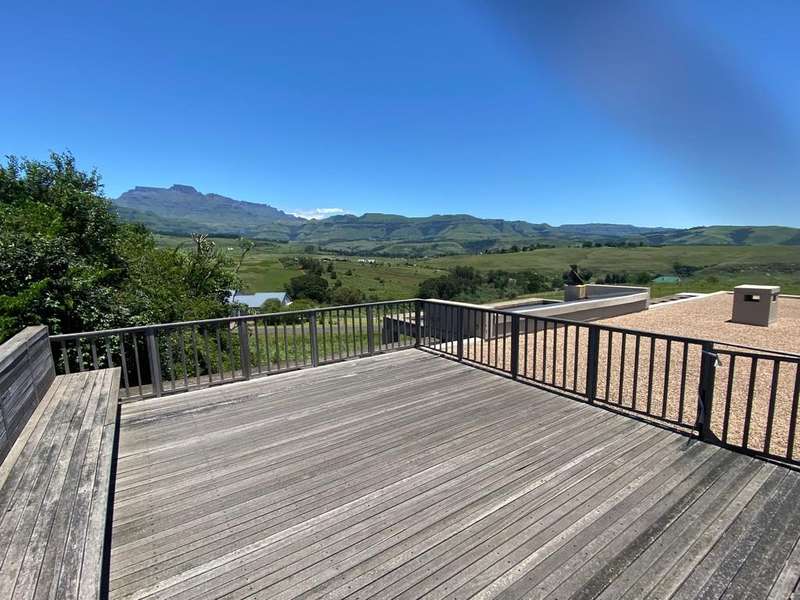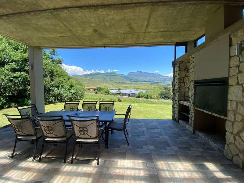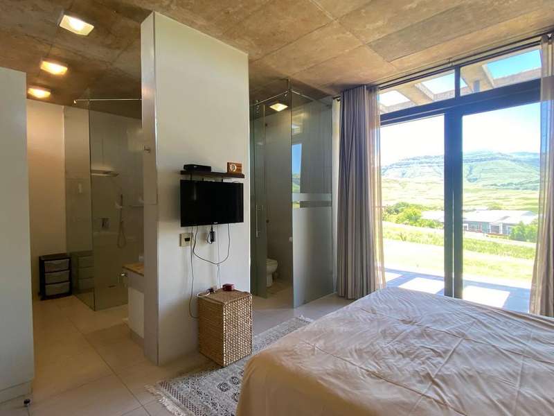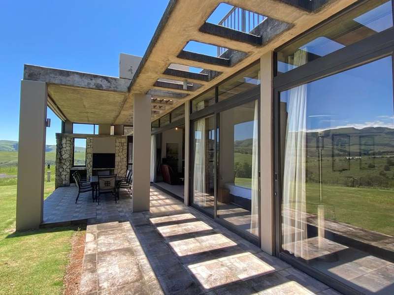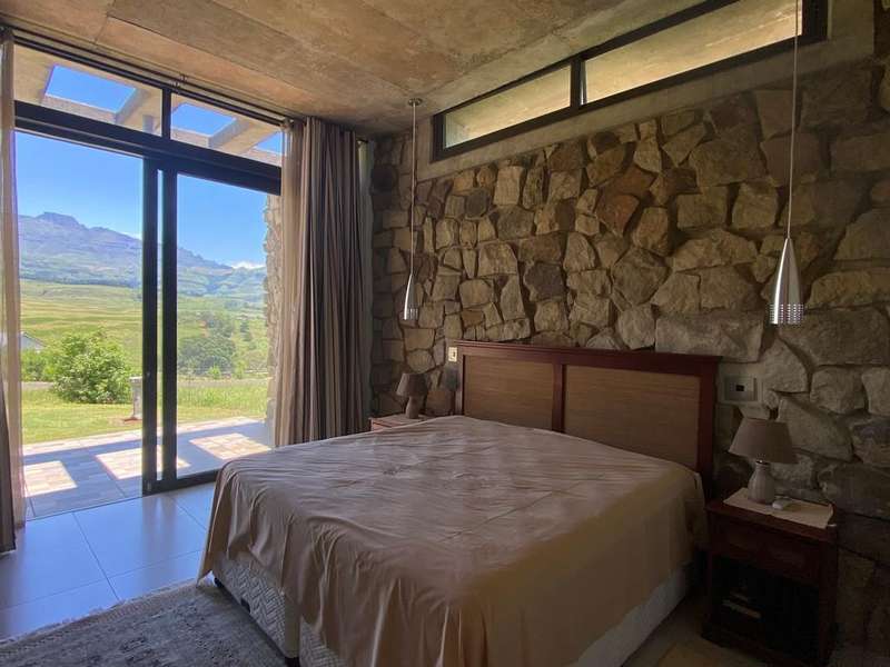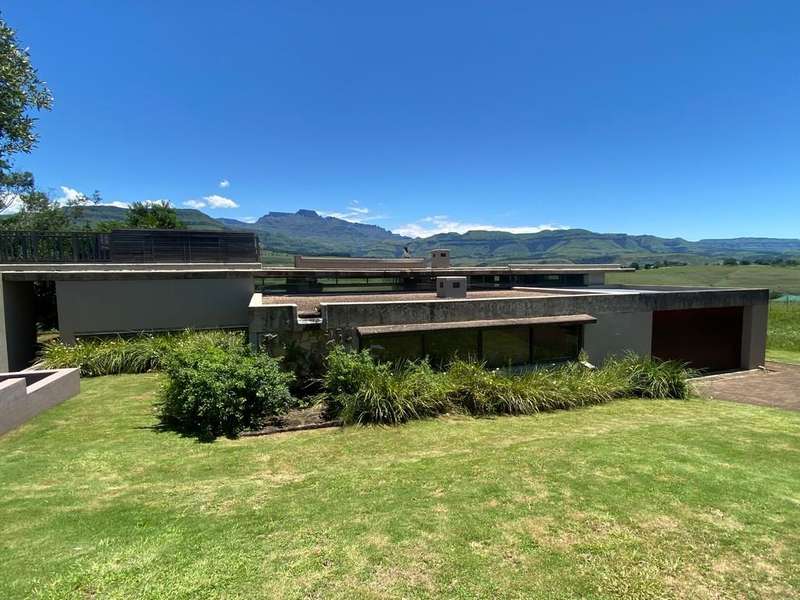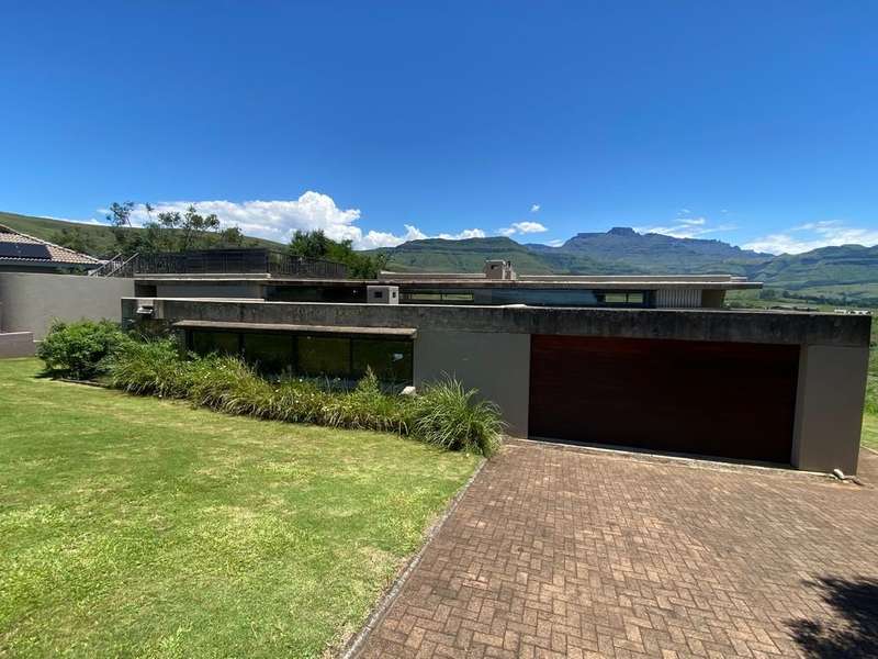 Architectural gem in the heart of the Drakensberg. This home has been designed to stand out above the rest, with the breath taking views of nature and the Drakensberg taken into consideration with its high ceilings and extra length windows and doors overlooking the mountains. As you step into this home, you are greeted by open, natural light filled spaces and the exposed concrete ceilings definitely make a bold statement. The open plan living/dining area has sliding glass doors that open all the way and flow to the covered patio and garden. The bar area and built in braai, makes for the perfect space to entertain your family and friends. Light up the fireplace in the lounge during the cold winter months. The kitchen has more than enough cupboard space, with beautiful granite counter tops, a gas hob and under counter oven. The scullery is tucked away with more cupboard space and also serves as the laundry room. All three bedrooms have stunning rock cladded feature walls and sliding glass doors leading out to the garden and views of the mountain. The main bedroom suite is air-conditioned and has a modern open bathroom design. with a large shower, bath and walk in cupboards. A family bathroom services the two guest bedrooms. The stand out feature of the property is the reinforced concrete roof that covers the entire house. Stairs lead up to a large sun-downers deck on top of the roof and promises the most breathtaking views. The double automated garage has direct access into the house. This house has been designed and built with both functionality and style in mind and no expense was spared to accomplish this masterpiece. Cathkin Estate is a secure eco estate that spans over 1000 hectares of grasslands, forests and streams, making it the largest game reserve in the Drakensberg. Development cover less than 5% of the estate. It is home to indigenous species of fauna and flora, most notably the endangered Oribi antelope. Enjoy nature by hiking or mountain biking or even casting a line in one of many trout filled dams. The estate is access controlled and the villages and the electric fence line that surrounds the entire estate is patrolled. No pets allowed. A once off non-refundable capital development fund levy is payable by the purchaser (12 months levy) Contact me to arrange a viewing appointment.