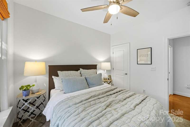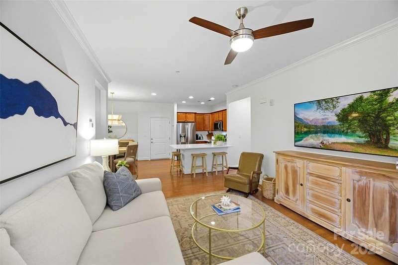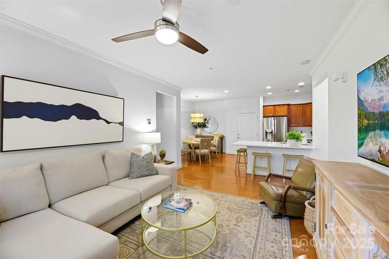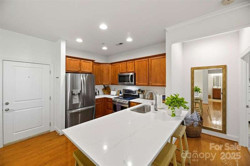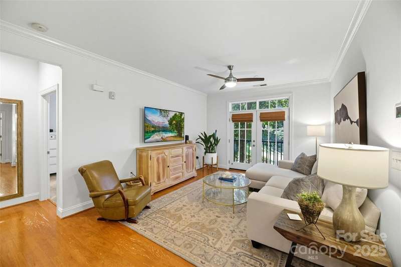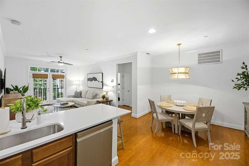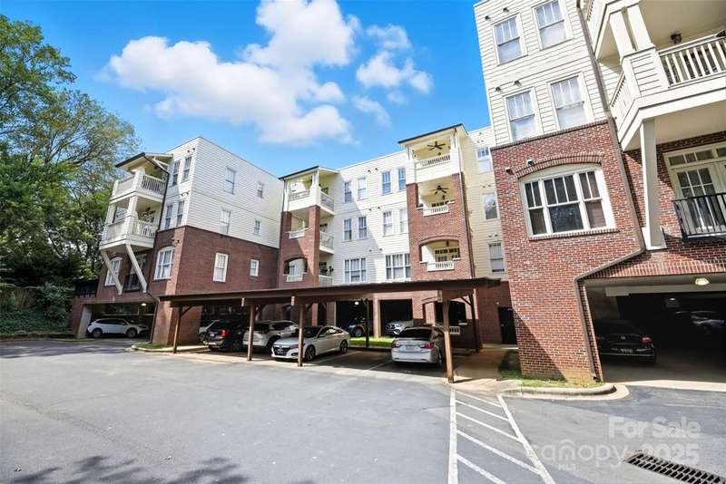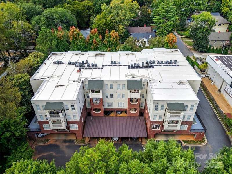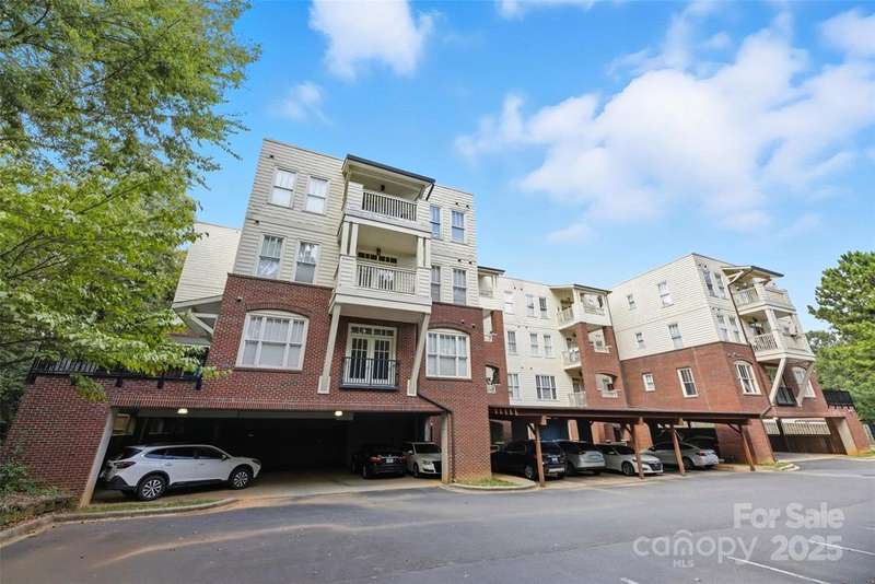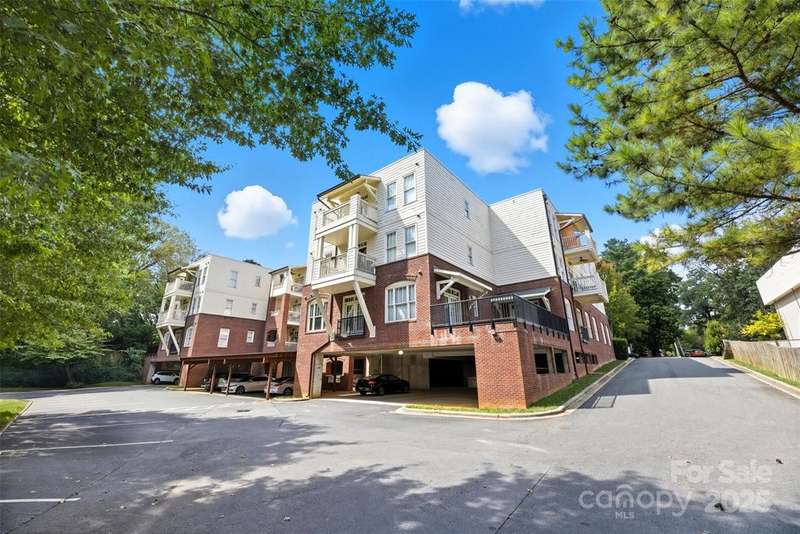Don't miss this opportunity to live in the heart of charming Elizabeth! This beautifully maintained first-floor condo offers a desirable split floor plan and hardwood floors throughout the main living areas. Ample windows flood the space with natural light, creating an open and welcoming atmosphere. The kitchen features stainless steel appliances, quartz countertops (2022), tile backsplash (2022), and a spacious breakfast bar for casual dining or entertaining. The primary suite boasts a walk-in closet, en suite bath with dual sinks, and direct access to a large balcony through double French doors. This area is ideal for morning coffee or winding down in the evening. The guest bedroom is located on the opposite end of the unit and is conveniently beside the second full bath and in-unit laundry, offering privacy and functionality. Additional upgrades by the current owner include fresh interior paint (2021) window treatments (2021) Washer and dryer (2021) and new HVAC system (2024). All appliances convey, making this home move-in ready. Nestled on a picturesque, tree-lined street, the building includes private parking and elevator access-all within minutes of Charlotte's best dining, hospitals, shops, and parks.