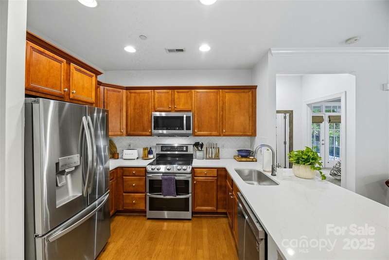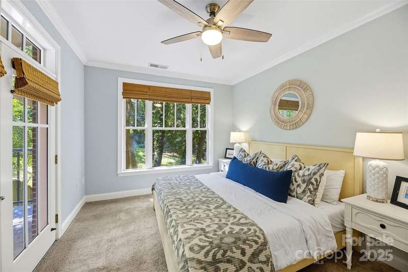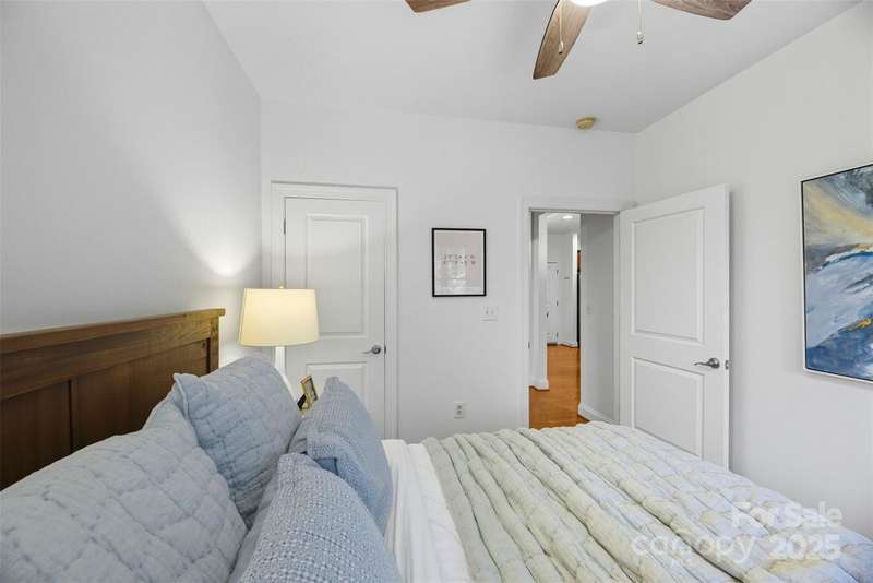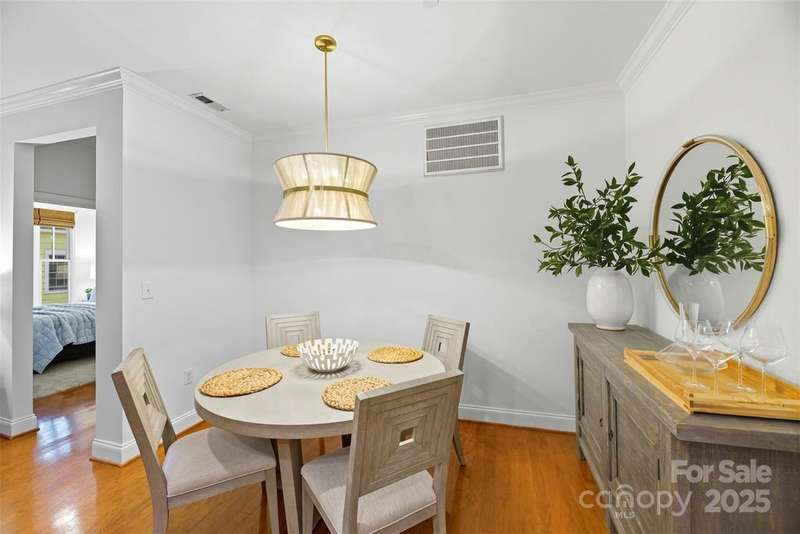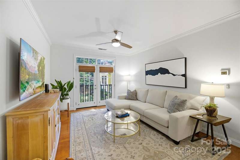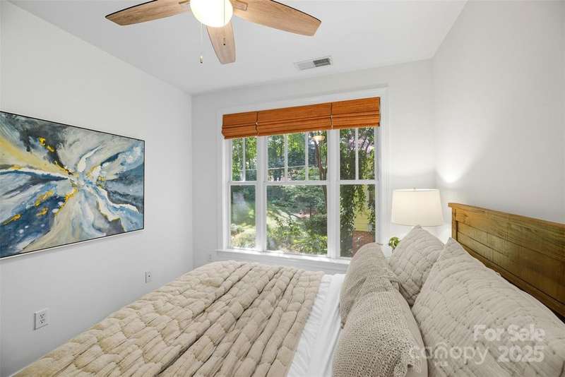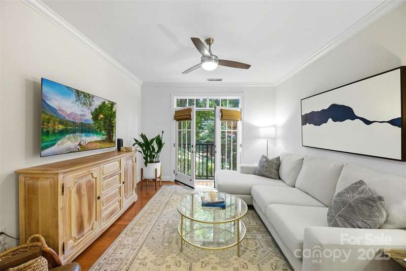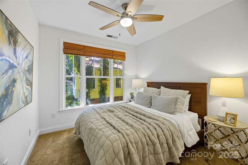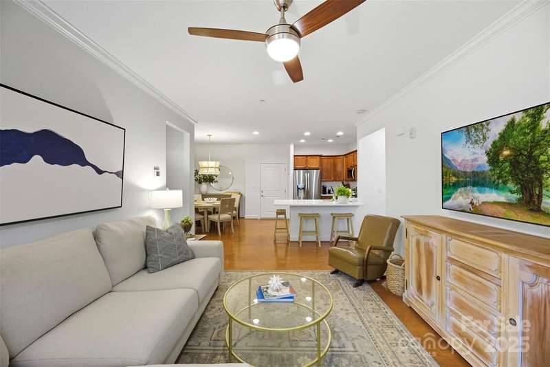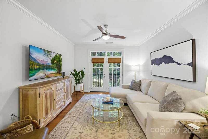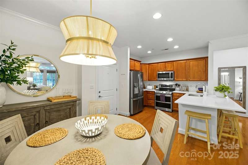Don't miss this opportunity to live in the heart of charming Elizabeth! This beautifully maintained first-floor condo offers a desirable split floor plan and hardwood floors throughout the main living areas. Ample windows flood the space with natural light, creating an open and welcoming atmosphere. The kitchen features stainless steel appliances, quartz countertops (2022), tile backsplash (2022), and a spacious breakfast bar for casual dining or entertaining. The primary suite boasts a walk-in closet, en suite bath with dual sinks, and direct access to a large balcony through double French doors. This area is ideal for morning coffee or winding down in the evening. The guest bedroom is located on the opposite end of the unit and is conveniently beside the second full bath and in-unit laundry, offering privacy and functionality. Additional upgrades by the current owner include fresh interior paint (2021) window treatments (2021) Washer and dryer (2021) and new HVAC system (2024). All appliances convey, making this home move-in ready. Nestled on a picturesque, tree-lined street, the building includes private parking and elevator access-all within minutes of Charlotte's best dining, hospitals, shops, and parks.