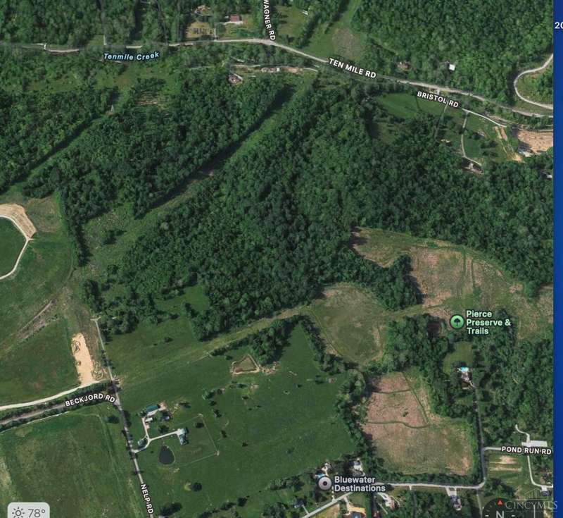 This 57-acre parcel in Pierce Township, Ohio, just 1.3 miles up the hill from U.S. Route 50, abuts Pierce Preserve Park and Trails. Water is available at the street, once servicing an old abandoned homestead, making it ideal for a private estate or residential development. Adjacent to a preserve with over 3 miles of hiking trails, native wildflowers, and wildlife, it offers natural beauty and recreation. Just 20 minutes from Cincinnati, the land blends rural charm with access to Ohio Pike's amenities, including shopping, dining, and parks like Locust Corner. With a historic homestead and versatile terrain, it's perfect for custom homesites or a community.