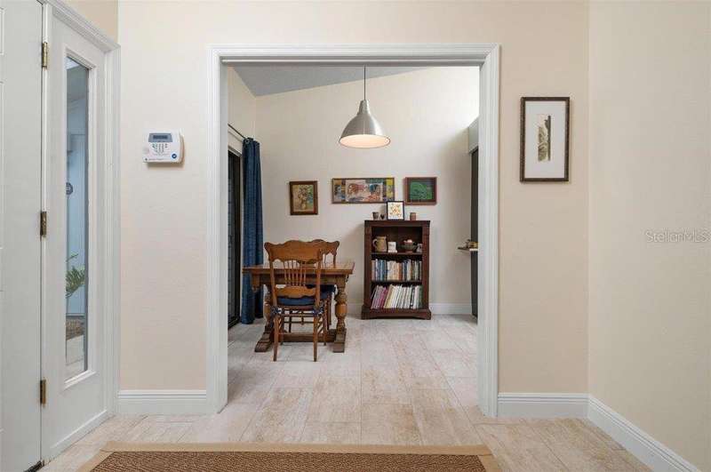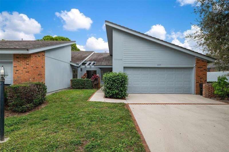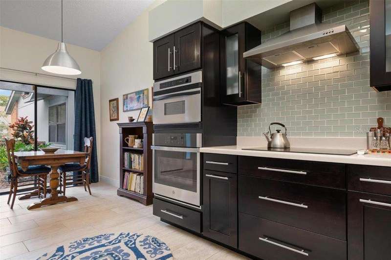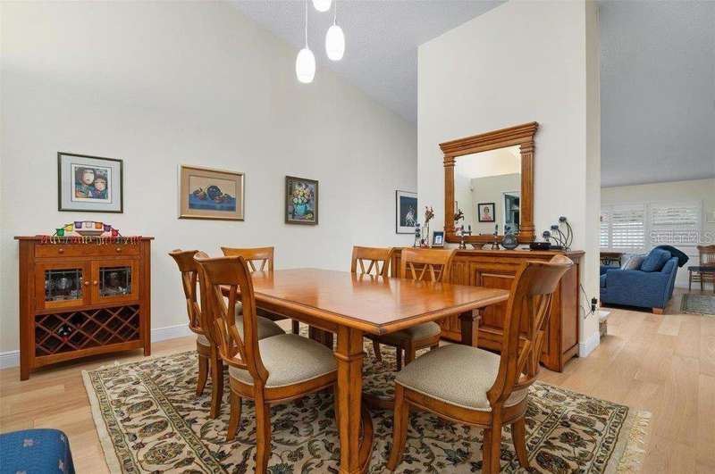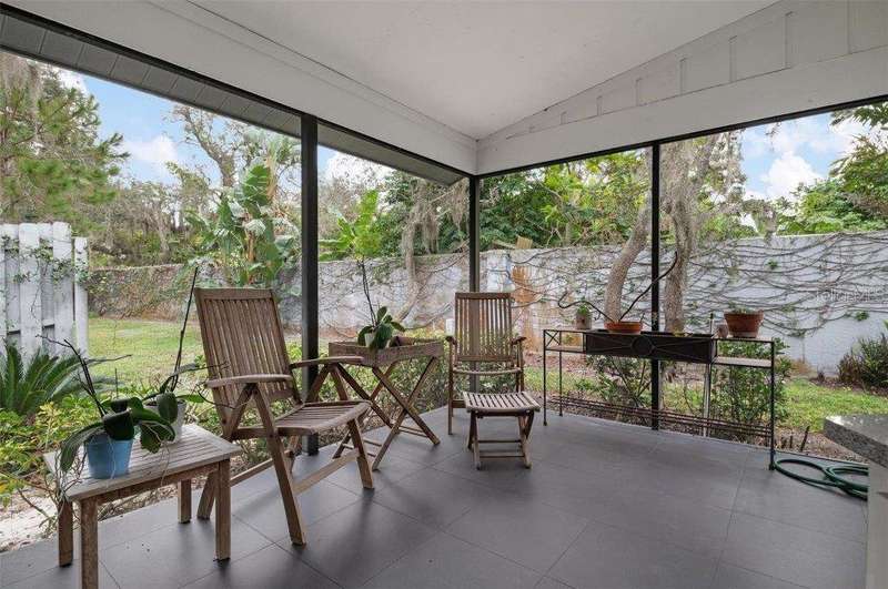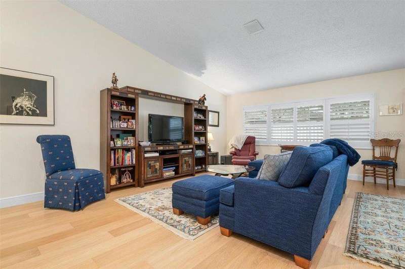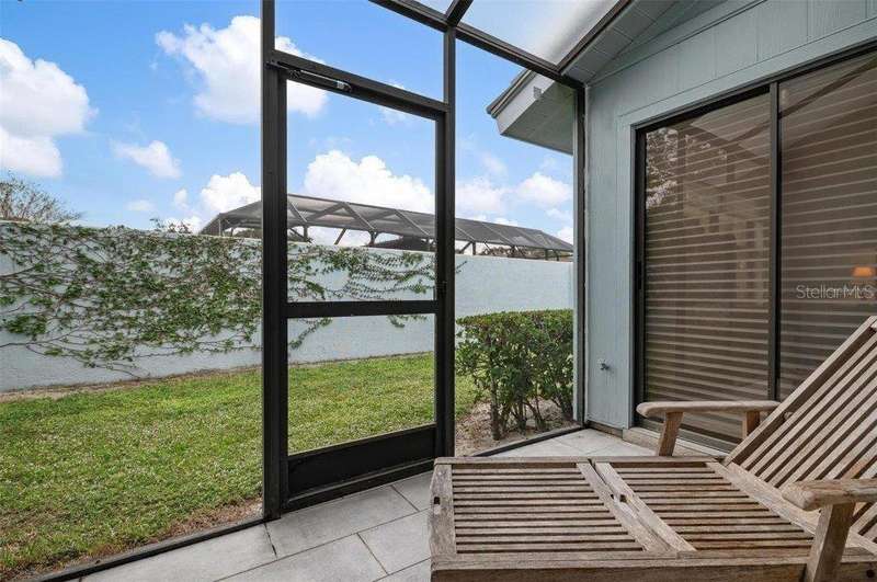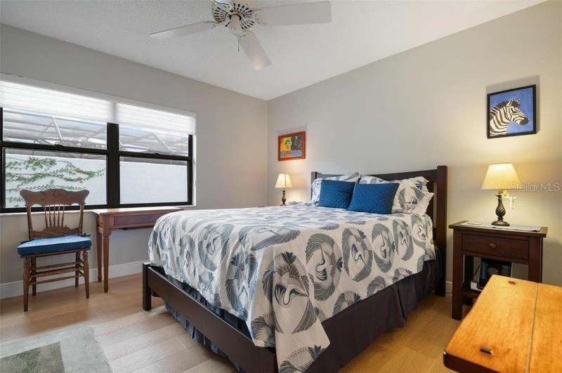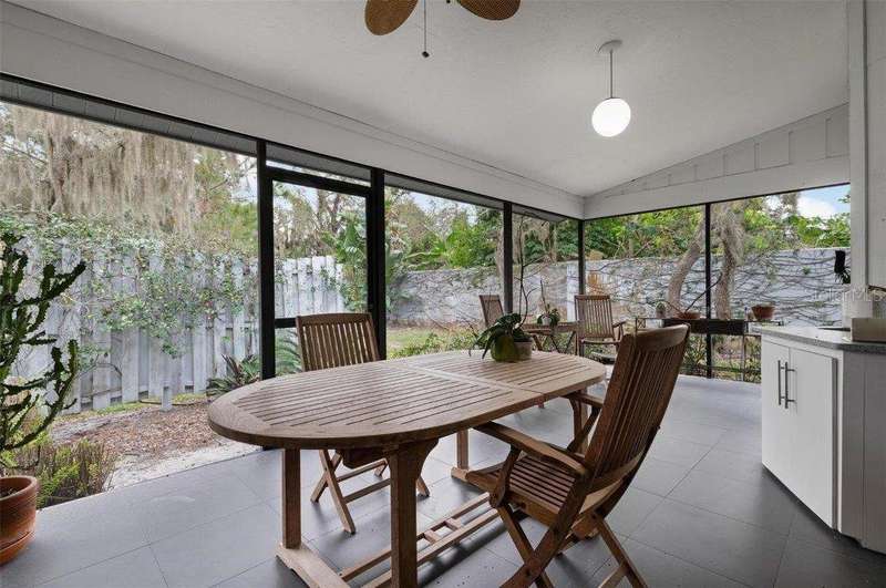 Woodbridge Estates at its finest! End unit, with total privacy, vaulted ceilings in almost every room, wood and ceramic tile floorings throughout, including the two screened porches. This villa style home lives like a single-family home, with everything remodeled in the last few years. The eat-in-kitchen has wooden cabinets, stainless steel appliances, Quartz countertops, under mount sink, back splash tile and pass-through to the dining room. Living room has wood burning fireplace, and opens up to a large, screened porch. Master bedroom has a huge walk-in-closet and totally renovated bathroom with walk-in-shower and soaking tub, duel counter sinks with Quartz counter-tops. The den-office is located off the dining room and has access to the guest bathroom. The second bedroom opens up to a small, screened porch as well. The 2-car garage is oversized, and both garage door and side entrance door were replaced in 2023 and extra space for a work bench. Woodbridge is located on 13 acres, with 60 villas and the amenities are tennis/pickleball courts, Manor house with 2 suites available to rent for guests and heated swimming pool. The community is gated at from 7pm to 7am. The location is perfect for getting to the beach, downtown, shopping and 5 miles to I-75.