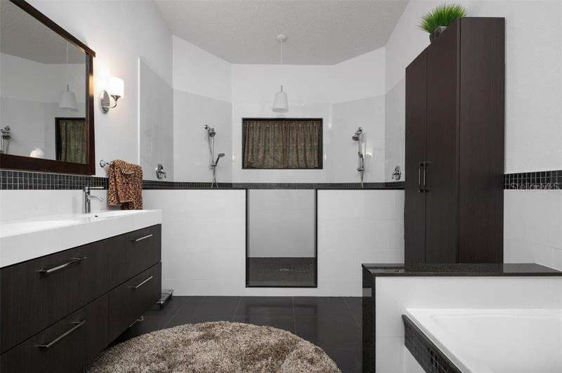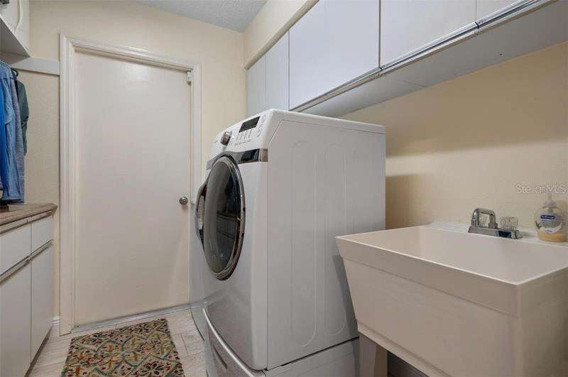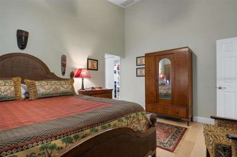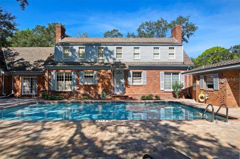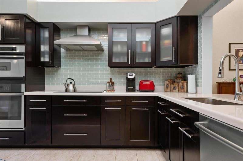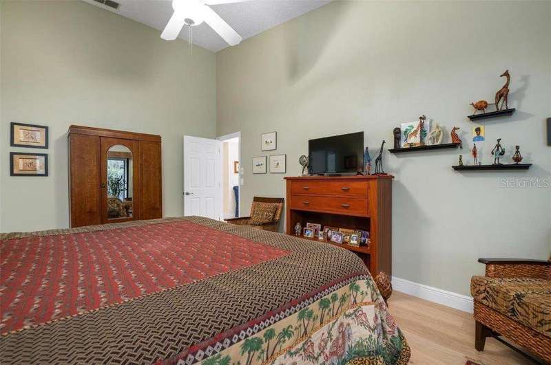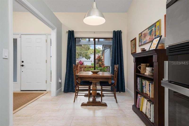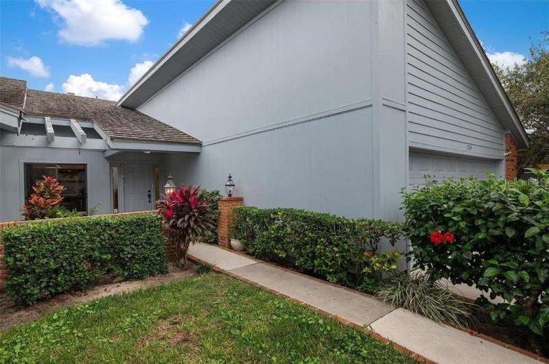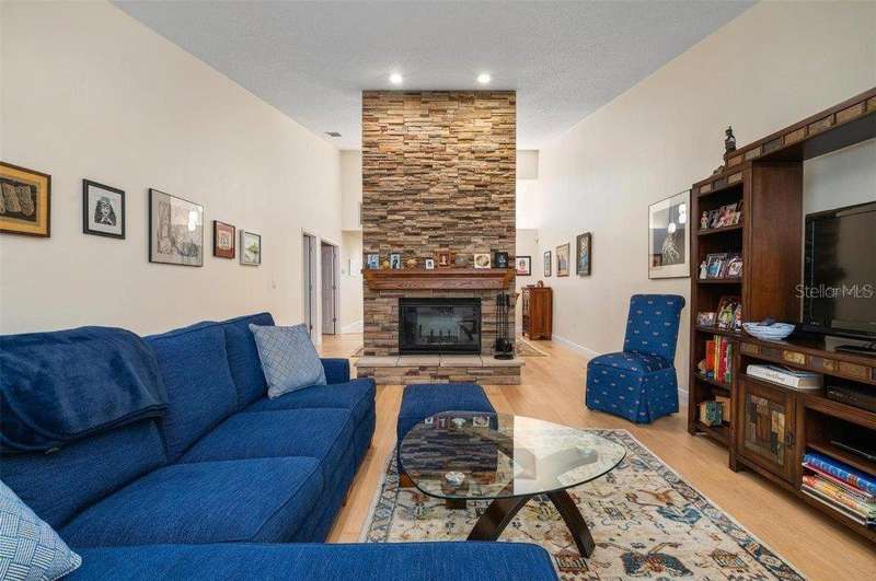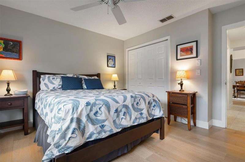 Woodbridge Estates at its finest! End unit, with total privacy, vaulted ceilings in almost every room, wood and ceramic tile floorings throughout, including the two screened porches. This villa style home lives like a single-family home, with everything remodeled in the last few years. The eat-in-kitchen has wooden cabinets, stainless steel appliances, Quartz countertops, under mount sink, back splash tile and pass-through to the dining room. Living room has wood burning fireplace, and opens up to a large, screened porch. Master bedroom has a huge walk-in-closet and totally renovated bathroom with walk-in-shower and soaking tub, duel counter sinks with Quartz counter-tops. The den-office is located off the dining room and has access to the guest bathroom. The second bedroom opens up to a small, screened porch as well. The 2-car garage is oversized, and both garage door and side entrance door were replaced in 2023 and extra space for a work bench. Woodbridge is located on 13 acres, with 60 villas and the amenities are tennis/pickleball courts, Manor house with 2 suites available to rent for guests and heated swimming pool. The community is gated at from 7pm to 7am. The location is perfect for getting to the beach, downtown, shopping and 5 miles to I-75.