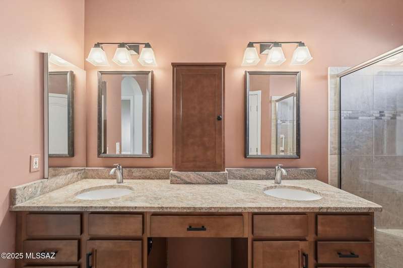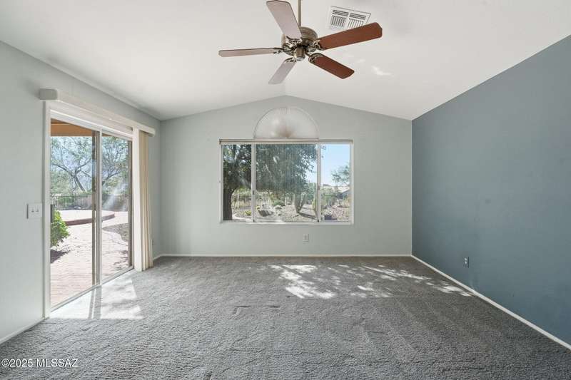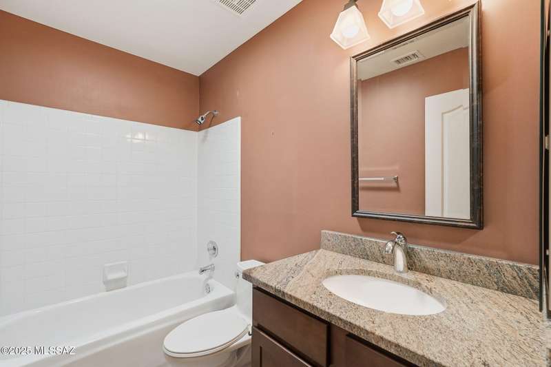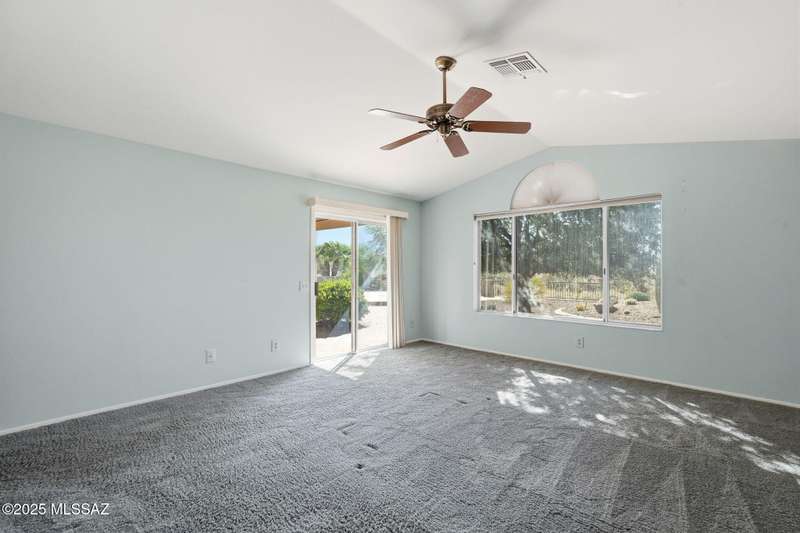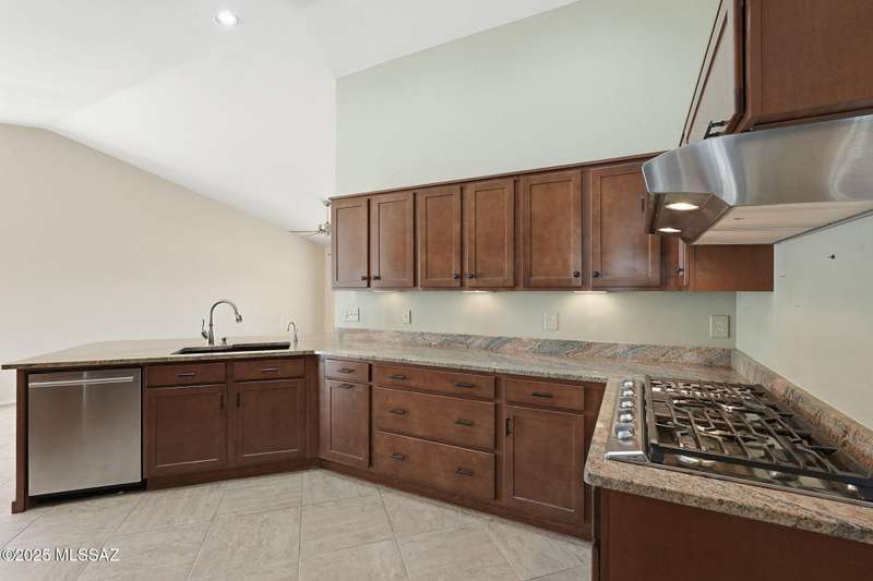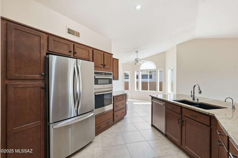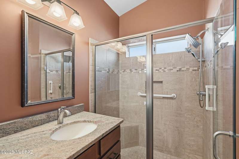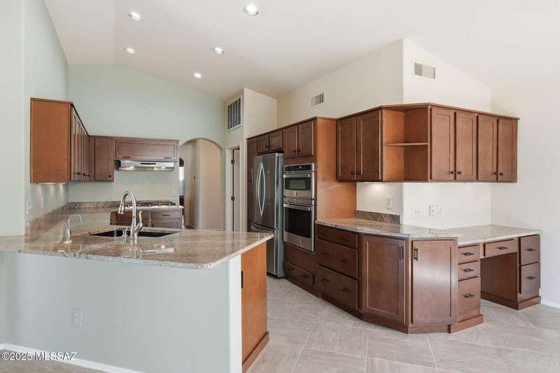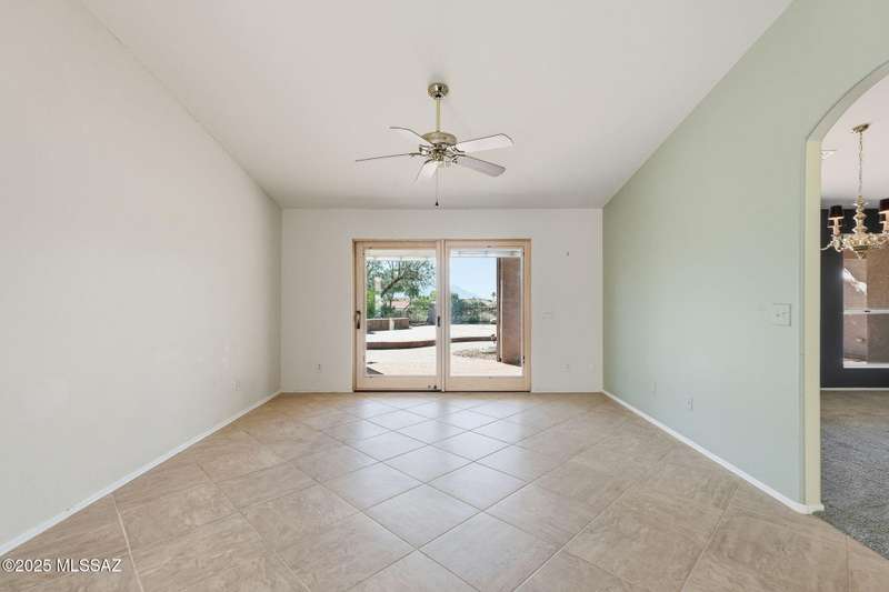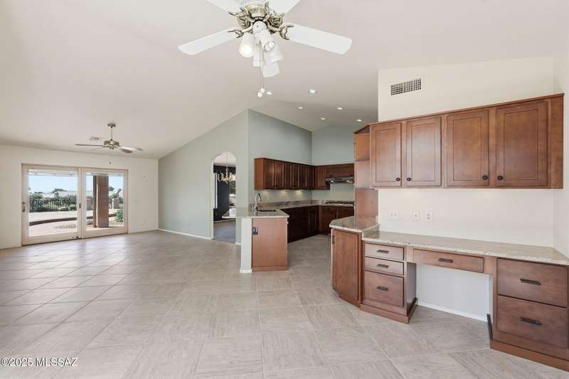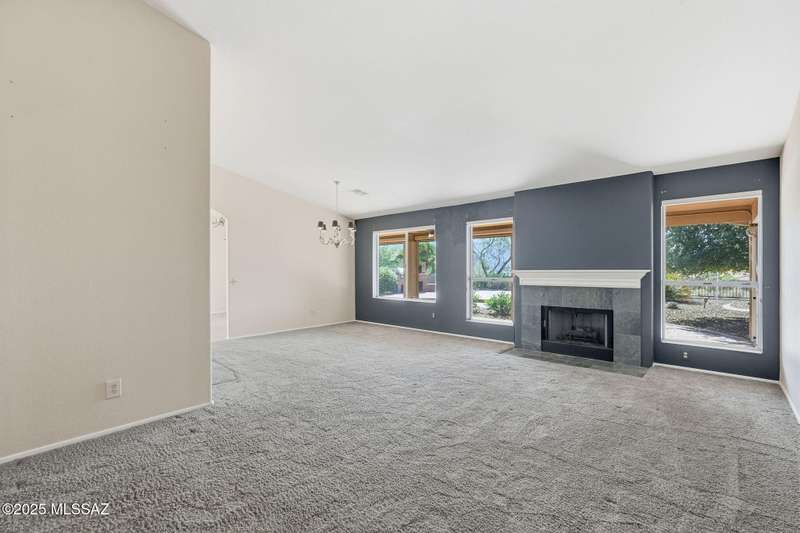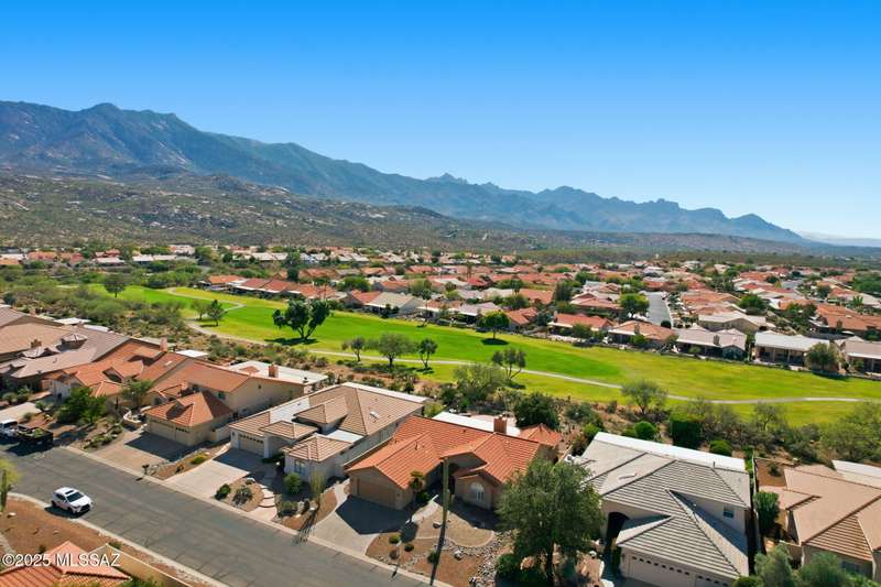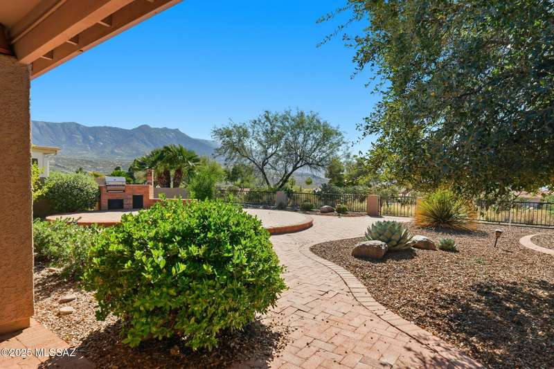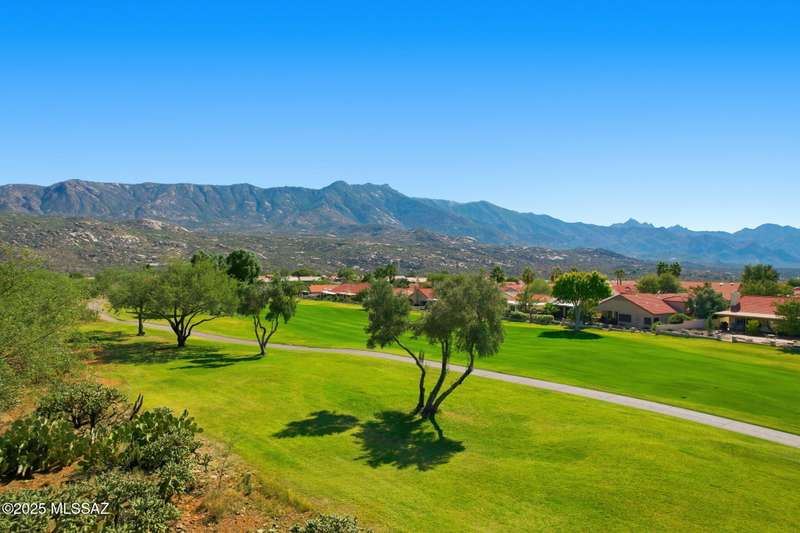 Beautiful mountain and golf course views highlight this inviting SaddleBrooke One home. The Topaz floor plan offers a living room, family room, 2 bedrooms plus a den, and 2 baths. The updated kitchen features granite countertops and rich cabinetry. The spacious primary suite includes patio access and a beautifully remodeled bath with granite counters, shaker cabinets, and a tile shower. Guest bath is similarly updated. Large diagonal floor tile, gas fireplace, and carpeted areas add comfort. Enjoy outdoor living on the paver patio with built-in grill overlooking the golf course with peaceful privacy. Extended garage, 2015 HVAC, and roof underlayment replaced 2 years ago. Laundry with front-load washer/dryer and storage. Enjoy SaddleBrooke's premier active adult amenities!