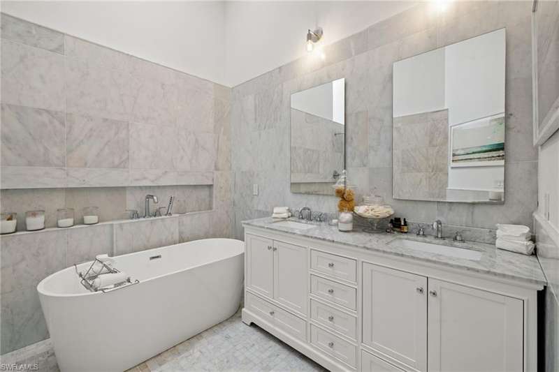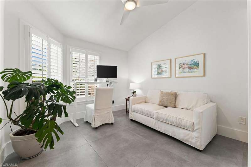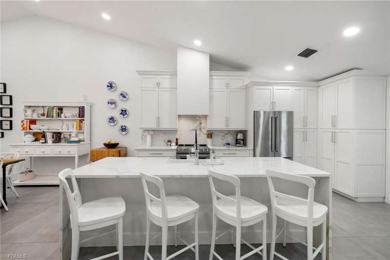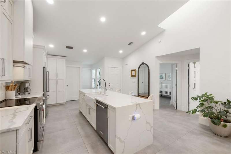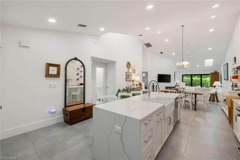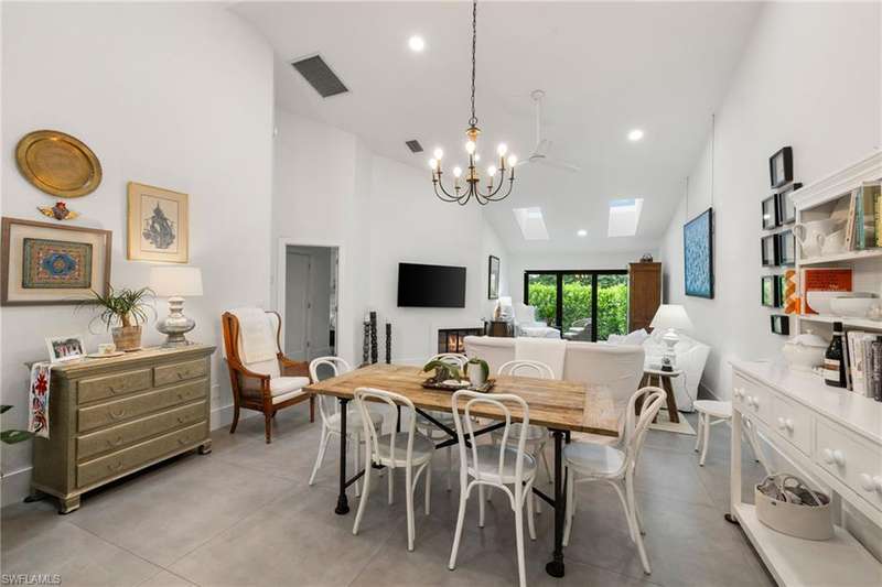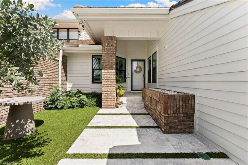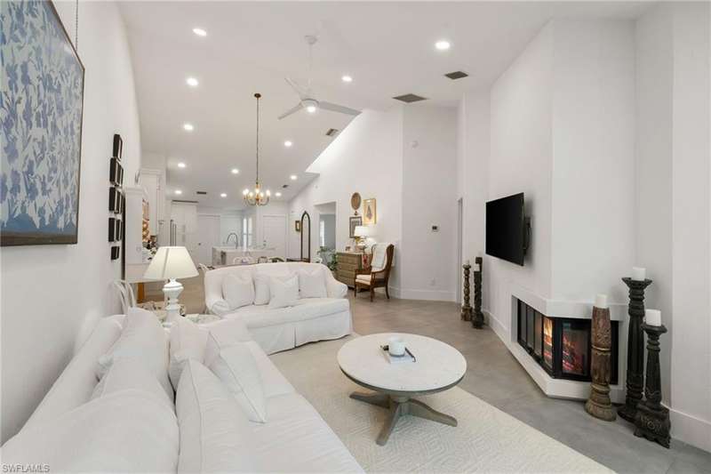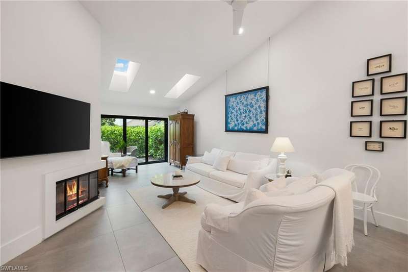 This elegantly remodeled villa is ideally located in the highly sought-after and rarely available Villas of Park Shore, a stone s throw from the beach. Thoughtfully renovated from top to bottom, this residence offers modern luxury with every detail carefully curated. The eye-catching kitchen features custom cabinets, high-end stainless steel appliances, a seamless continuation of the countertop to the backsplash, a large island, chic hardware, and a convenient pot filler. The open-concept floor plan flows effortlessly into the bright, airy living area, where a cozy fireplace and abundant natural light from skylights and vaulted ceilings create a warm ambiance. The remodeled primary ensuite wet bath is a spa-inspired escape with a freestanding soaking tub, a separate shower, and premium finishes for ultimate relaxation. The beautifully remodeled laundry room adds both style and functionality. The gated custom courtyard and pavered lanai, surrounded by privacy hedges, offer serene retre