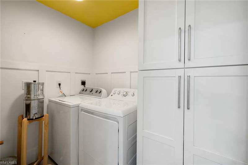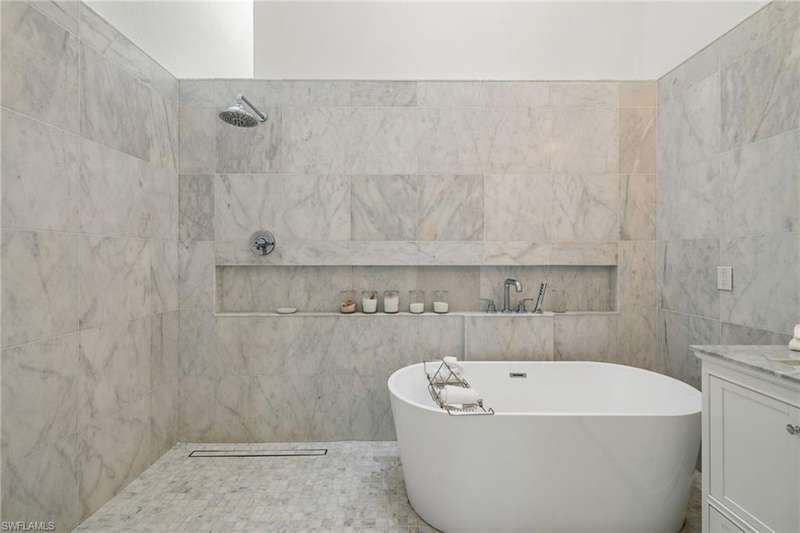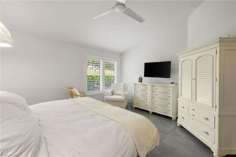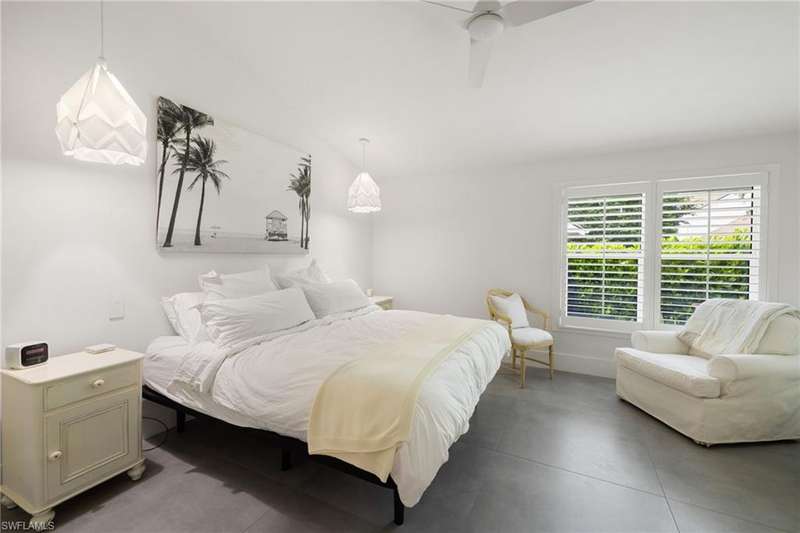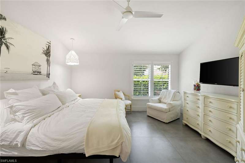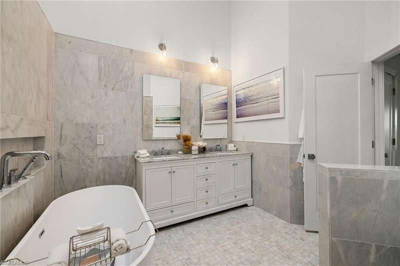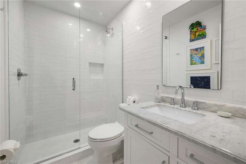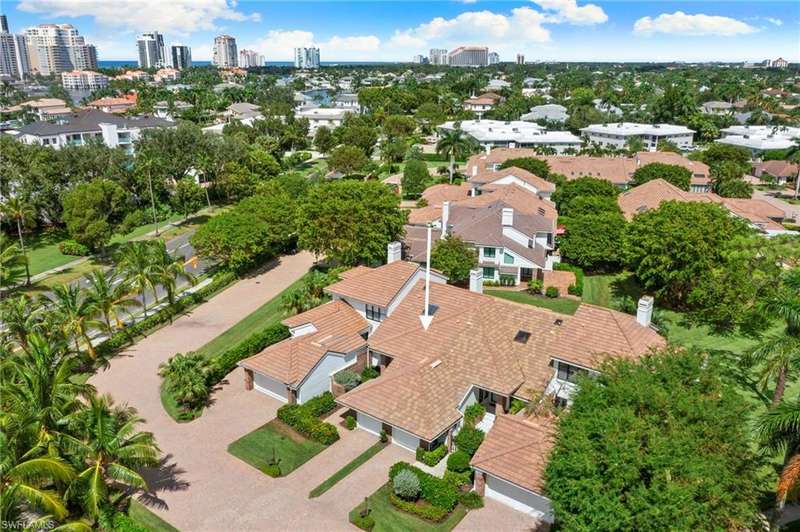 This elegantly remodeled villa is ideally located in the highly sought-after and rarely available Villas of Park Shore, a stone s throw from the beach. Thoughtfully renovated from top to bottom, this residence offers modern luxury with every detail carefully curated. The eye-catching kitchen features custom cabinets, high-end stainless steel appliances, a seamless continuation of the countertop to the backsplash, a large island, chic hardware, and a convenient pot filler. The open-concept floor plan flows effortlessly into the bright, airy living area, where a cozy fireplace and abundant natural light from skylights and vaulted ceilings create a warm ambiance. The remodeled primary ensuite wet bath is a spa-inspired escape with a freestanding soaking tub, a separate shower, and premium finishes for ultimate relaxation. The beautifully remodeled laundry room adds both style and functionality. The gated custom courtyard and pavered lanai, surrounded by privacy hedges, offer serene retre
